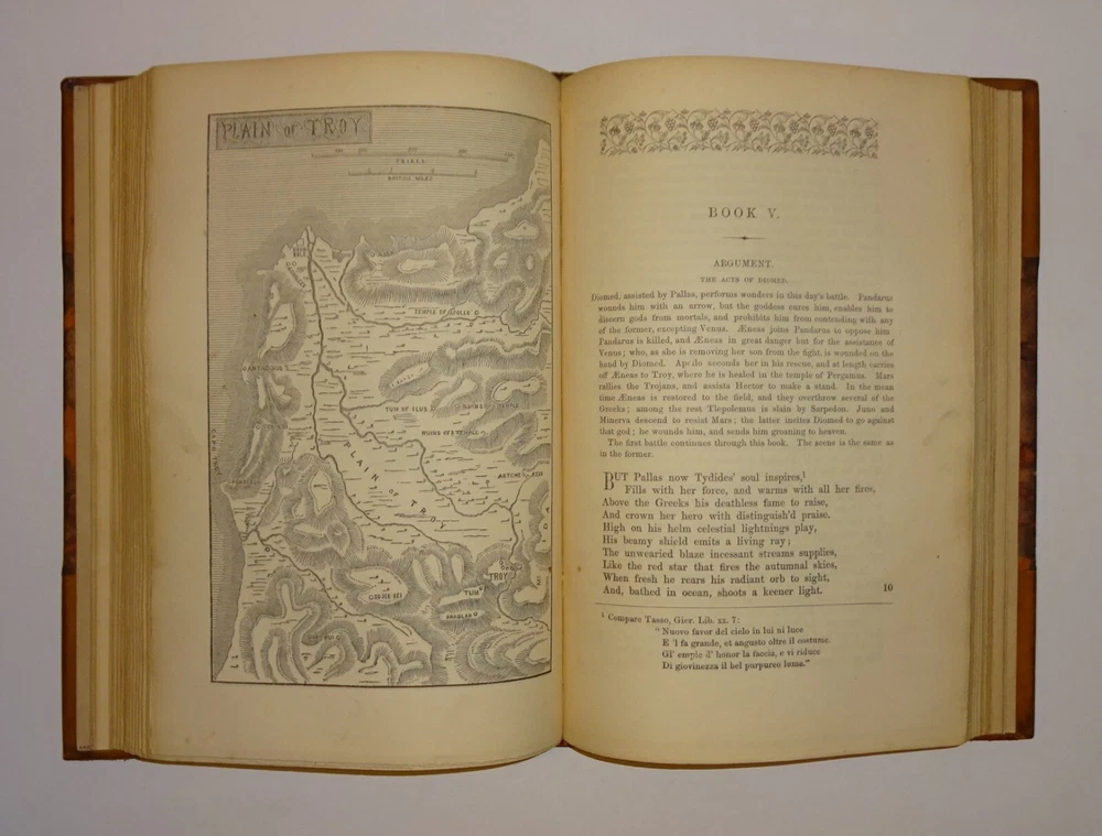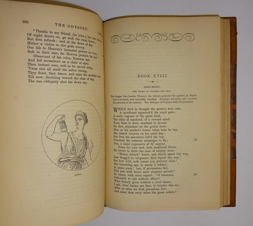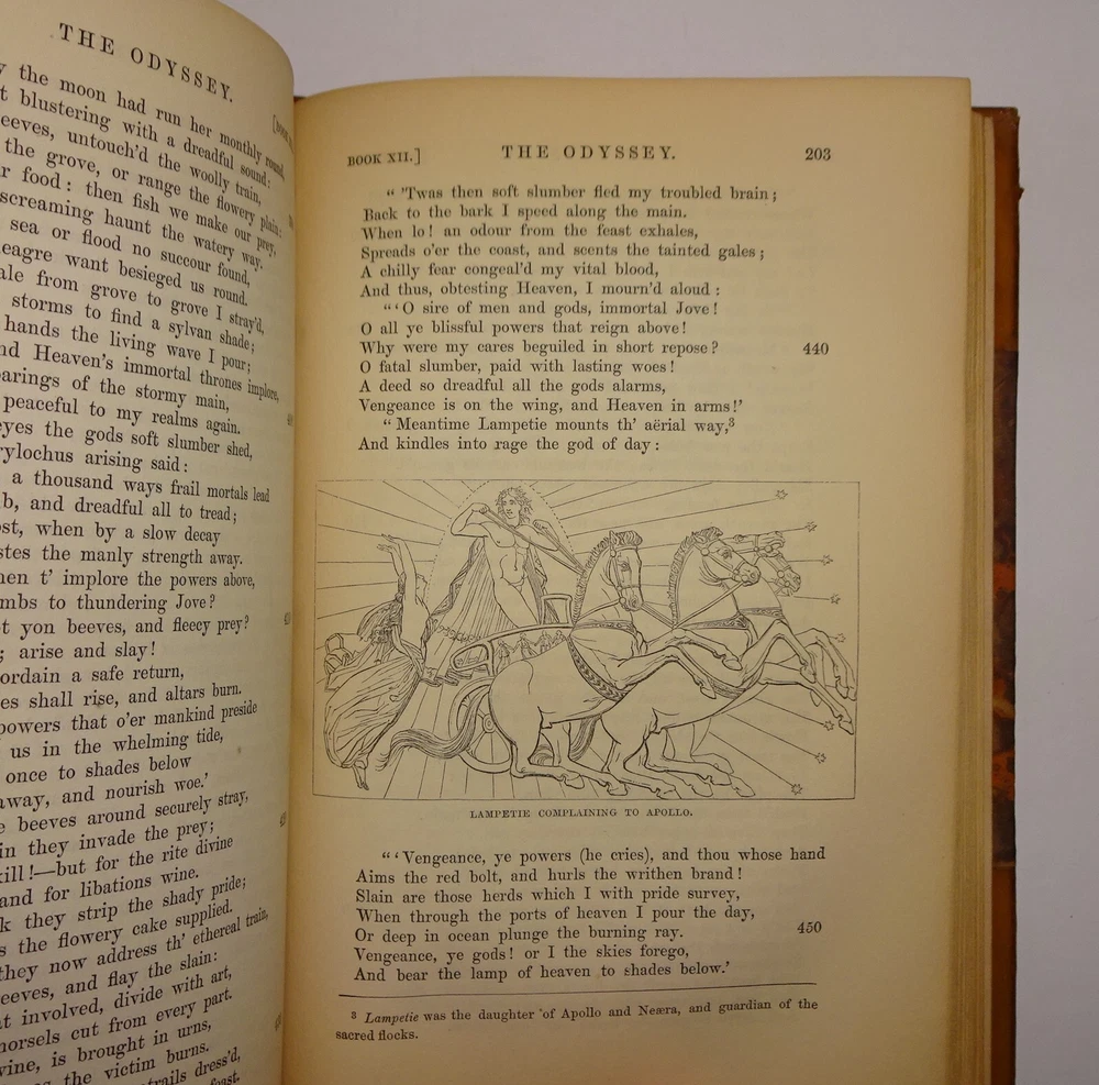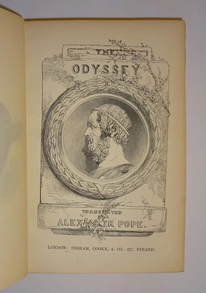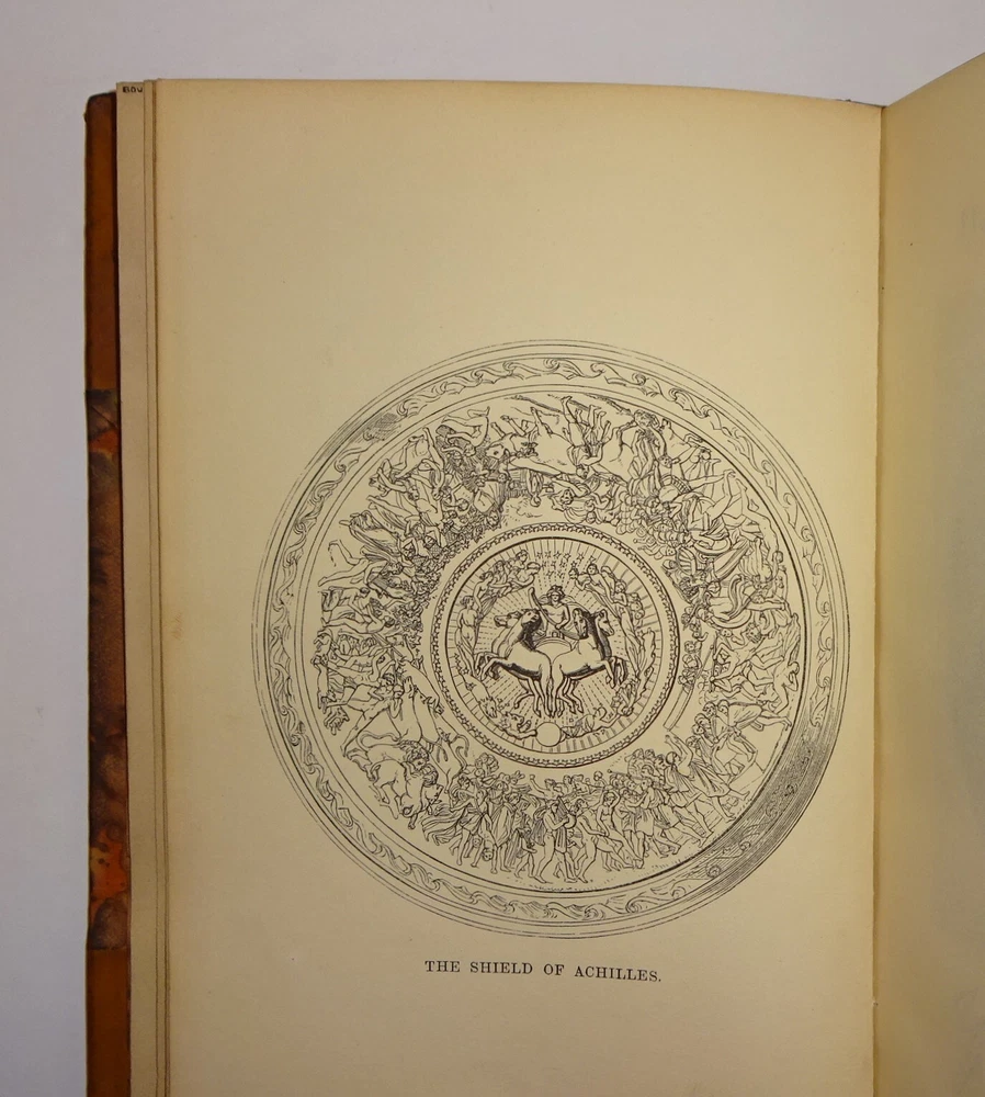 This is a handsome, custom fine binding set of "The Iliad of Homer" (complete in two volumes) together with "The Odyssey of Homer" (complete in one volume). 1853; Ingram, Cooke, and Co.; London. Alexander Pope translation. Each volume contains an illustrated title page, a frontispiece (with tissue guard), illustrations by John Flaxman, and "other engravings"; Volume I of The Iliad also contains a full-page map titled "Plain of Troy." This set has been beautifully bound by London bookbinder "Root & Son" in three-quarter leather with marbled covers and end papers, gilt top page edges, ribbon page markers, and a decorative gilt spine with five raised bands. With an Introduction and Notes by the Rev. Theodore Alois Buckley.