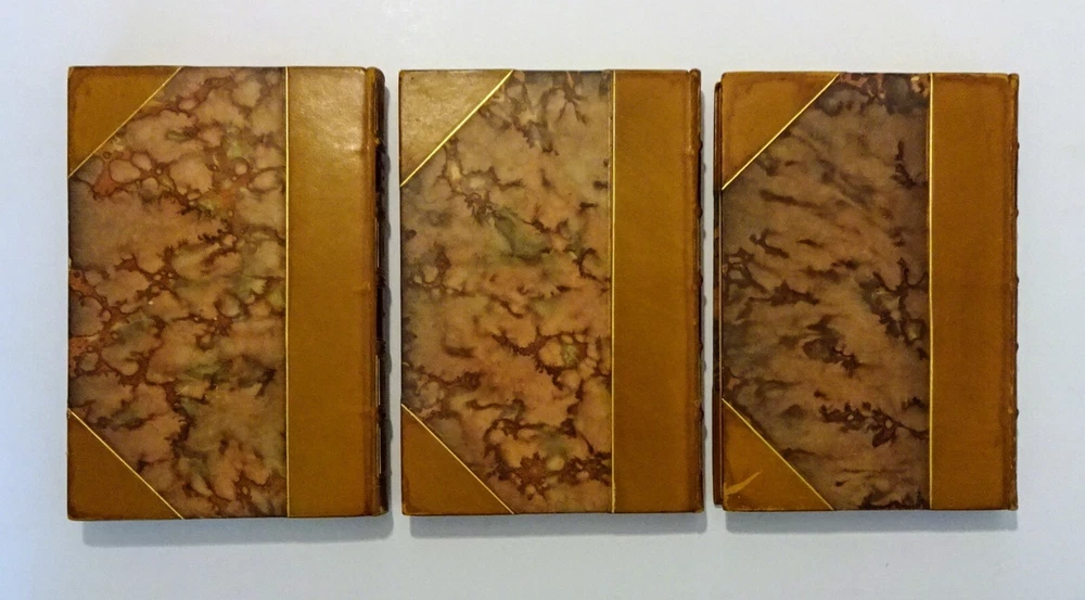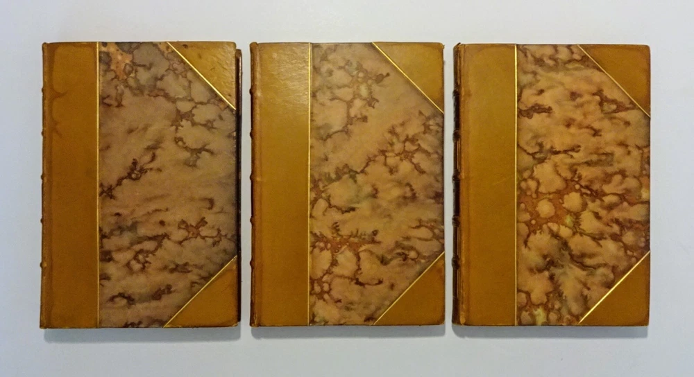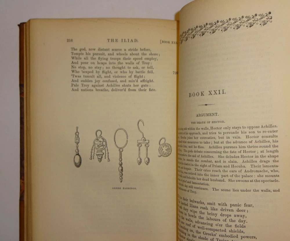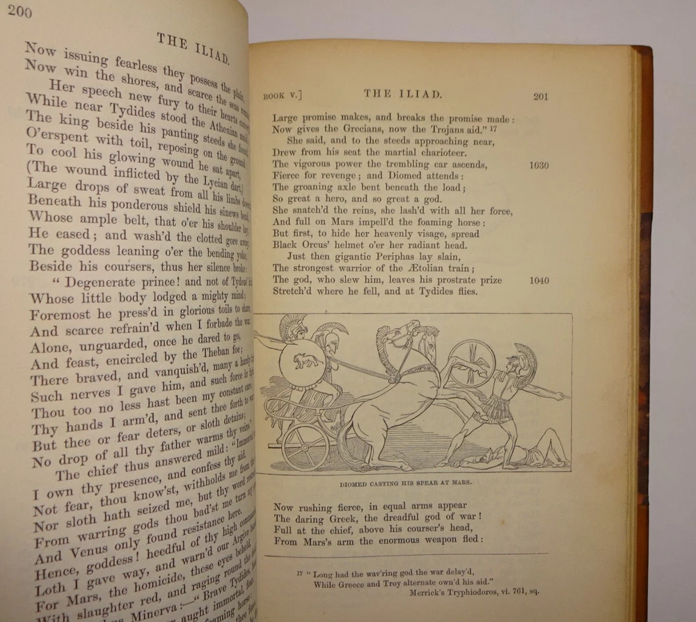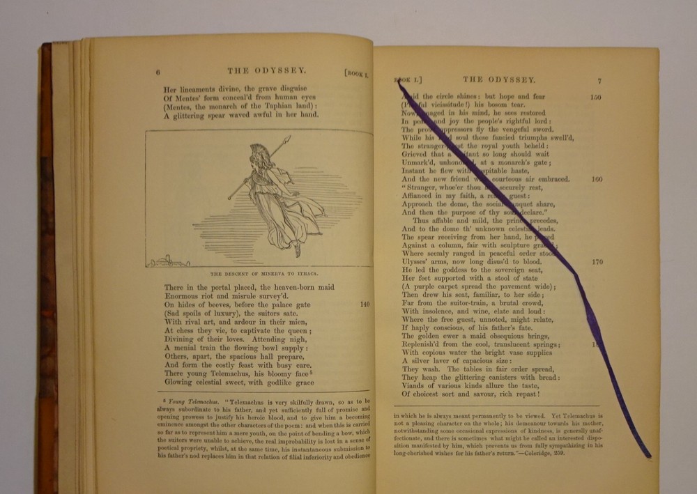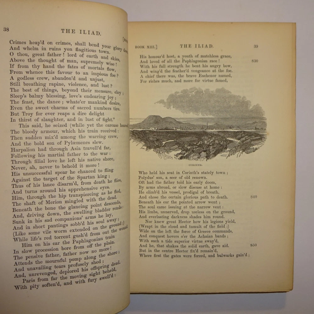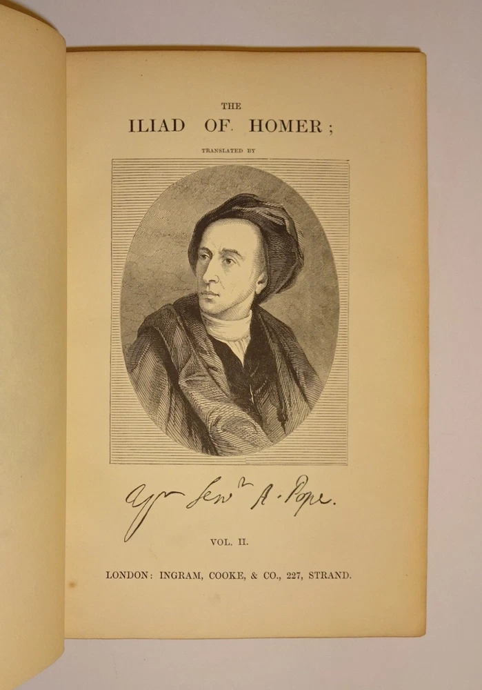 This is a handsome, custom fine binding set of "The Iliad of Homer" (complete in two volumes) together with "The Odyssey of Homer" (complete in one volume). 1853; Ingram, Cooke, and Co.; London. Alexander Pope translation. Each volume contains an illustrated title page, a frontispiece (with tissue guard), illustrations by John Flaxman, and "other engravings"; Volume I of The Iliad also contains a full-page map titled "Plain of Troy." This set has been beautifully bound by London bookbinder "Root & Son" in three-quarter leather with marbled covers and end papers, gilt top page edges, ribbon page markers, and a decorative gilt spine with five raised bands. With an Introduction and Notes by the Rev. Theodore Alois Buckley.