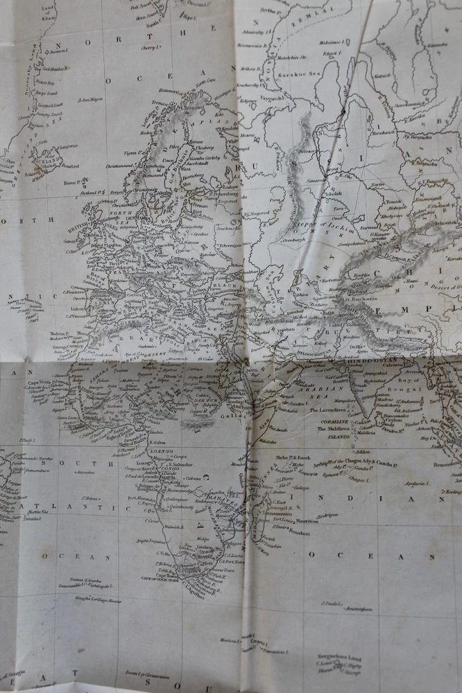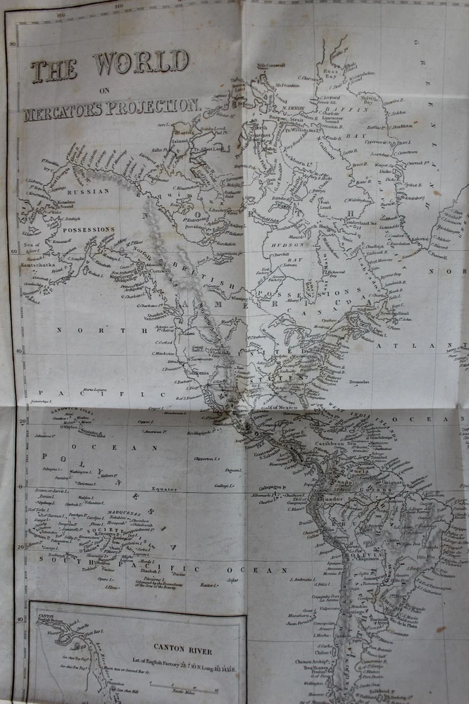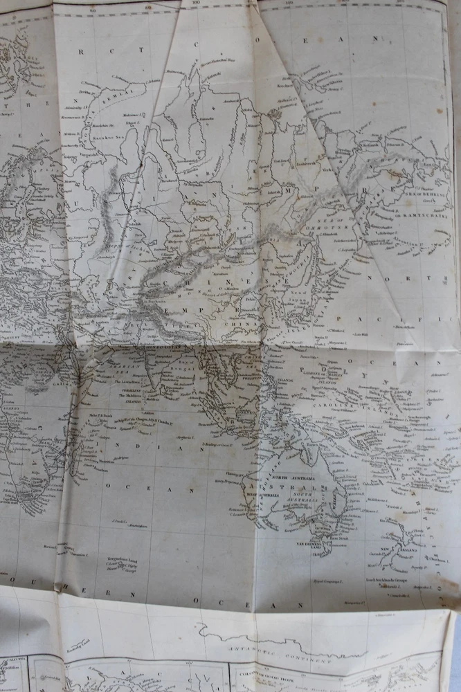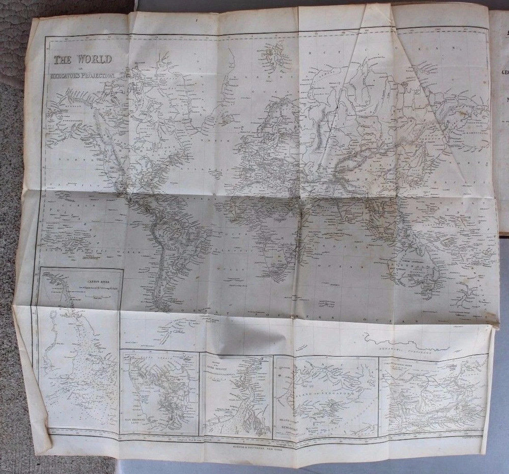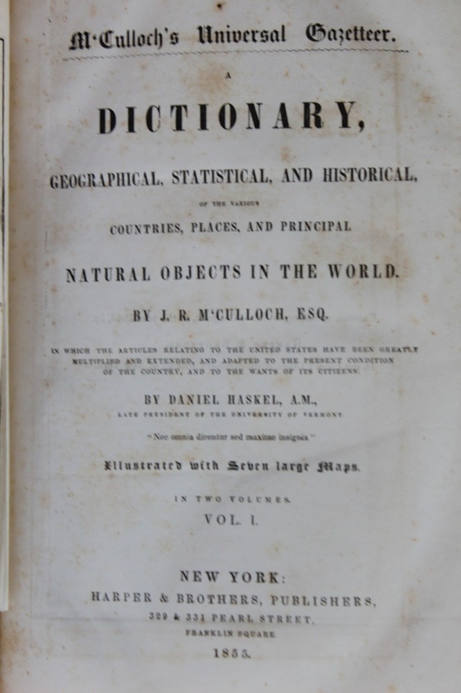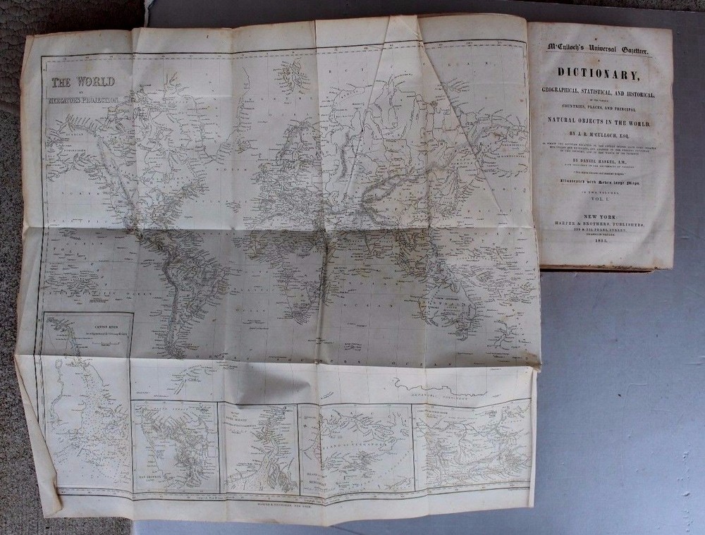 McCulloch's Universal Gazetter - Volume 1 with 4 large folding maps A Dictionary Geographical, Statistical, and Historical of the various countries, places, and principal natural objects in the world. by J. R. McCulloch Published by Harper & Brothers, New York, 1855. Volume 1. The first map of "The World" measures ~21" x 20". The second map is of "Asia" and is large ~20" wide. The third map is "Navigable Rivers, Canals, Railroads of Great Britain and Ireland" and is quite large ~20" wide. The fourth map is "British Possessions in North America with part of the United States" also large in size ~20" wide. Fair condition. The outer leather binding in cracked, but holding and quite worn. All maps complete with a tear where the they are attached to the binding of the book. An uncommon 1855 edition of this book with 4 unusually large maps.