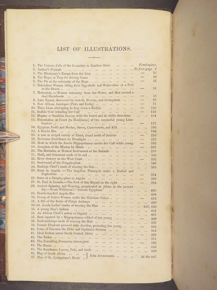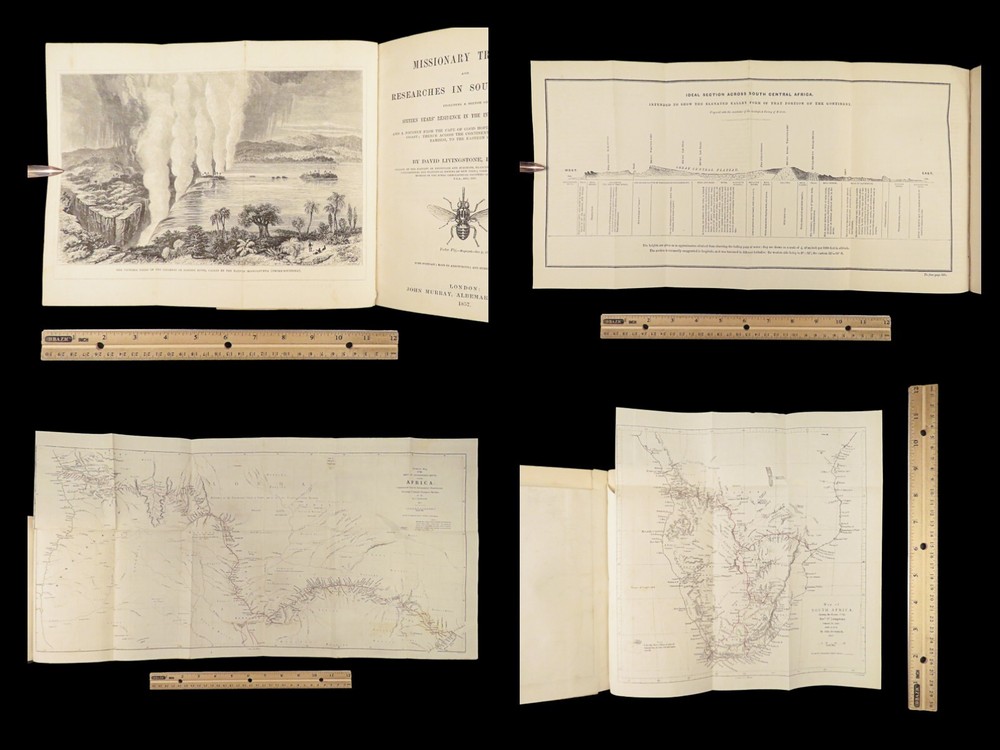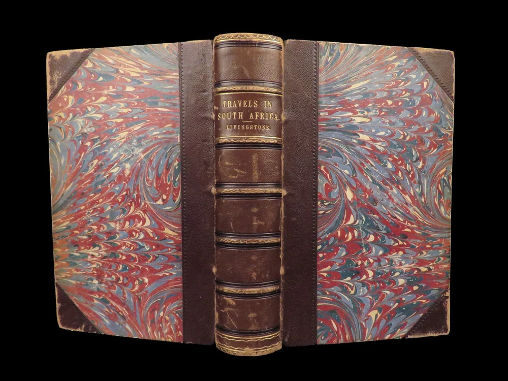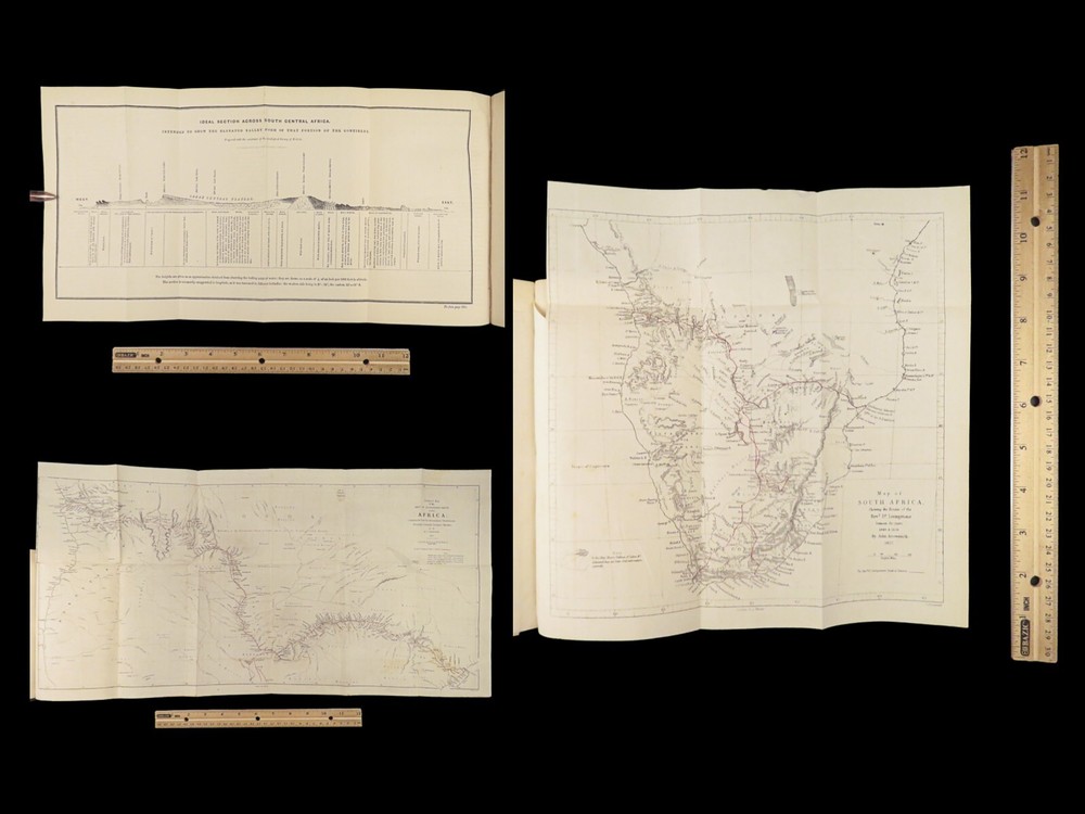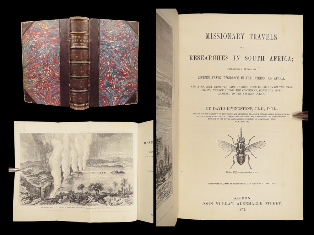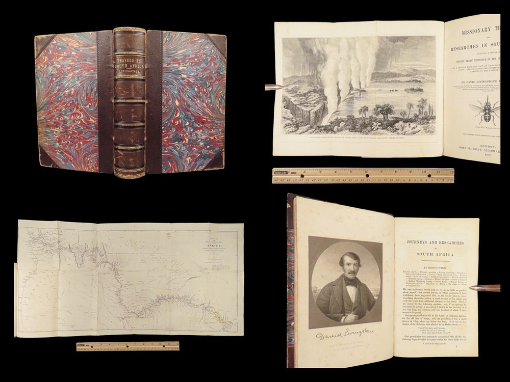 1857 AFRICA 1 ed David Livingstone Missionary Travels Illustrated MAP Angola RARE “If you have men who will only come if they know there is a good road, I don't want them. I want men who will come if there is no road at all.” ― David Livingstone A rare 1857 edition of David Livingstone’s “ Missionary Travels ”. In this book, Livingstone describes his travel and work as a missionary to the indigenous people in Central and South Africa. Through the mid-19th-century, South Africa was completely unknown to Europeans, thus Livingstone’s mission brought light to more than just spreading the gospel. The work deals with customs, languages, animal and plant biology, geology, topography, and mineralogy in Africa. According to PMM, “The geographical results of his journeys were of supreme importance and made it possible to fill in great stretches of the maps of Central Africa which hitherto had been blank.” ( Printing and Mind of Man 341) Livingstone discovered the Zambesi River and Victoria Falls, which he named. He also explored parts of Angola and Mozambique and met with and observed the Hottentot. He was also able to discover some of the most devastating instances of slave trade which propelled his abolitionist ideals. Item number: #26991 Price: $950 LIVINGSTONE, David Missionary Travels And Researches In South Africa London: Murray, 1857. First edition. Details : · Collation: Complete with all pages o ix, [1], 687, [1] o 45 full-page engravings, plus 2 folding maps · References: Czech 97; PMM 341; Abbey Travel 347; Garrison & Morton 5269 o Czech: “Perhaps the most famous of all African exploration books, this recounts Dr. Livingstone's travels through South Africa, with the discovery of Lake Ngami, while accompanied by his wife and William Cotton Oswell. Oswell and the author continued their journey, discovering the Zambesi River, and, eventually, the Victoria Falls” · Language: English · Binding: Leather; tight and secure · Size : ~8.75in X 6in (22cm x 15cm) Our Guarantee: Very Fast. Very Safe. Free Shipping Worldwide. Customer satisfaction is our priority! Notify us with 7 days of receiving, and we will offer a full refund without reservation! 26991