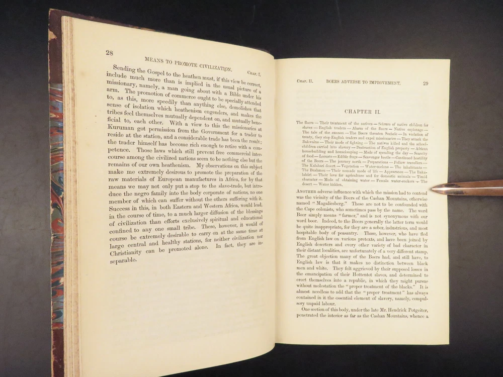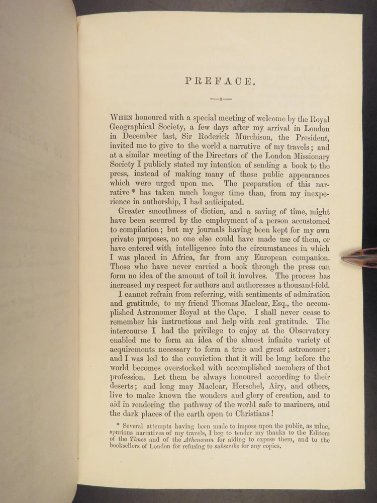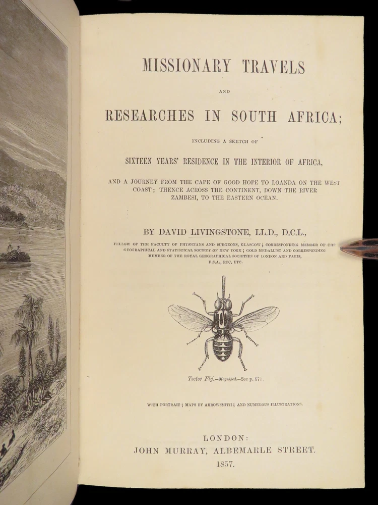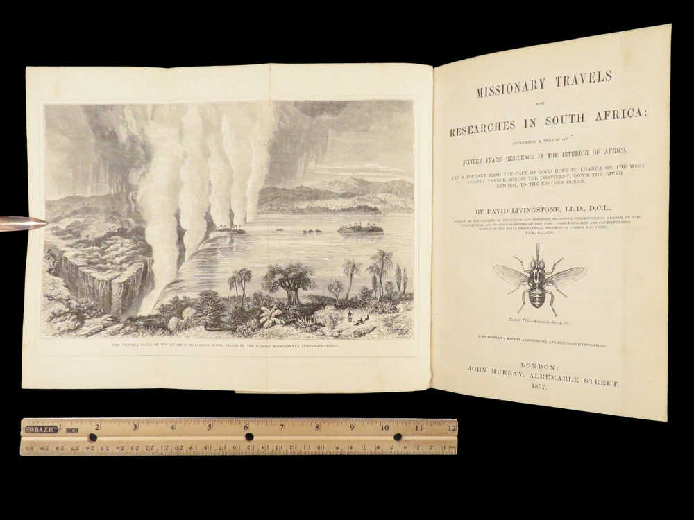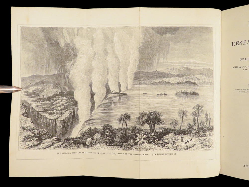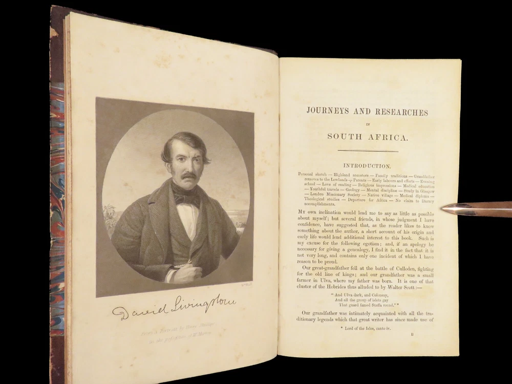 1857 AFRICA 1 ed David Livingstone Missionary Travels Illustrated MAP Angola RARE “If you have men who will only come if they know there is a good road, I don't want them. I want men who will come if there is no road at all.” ― David Livingstone A rare 1857 edition of David Livingstone’s “ Missionary Travels ”. In this book, Livingstone describes his travel and work as a missionary to the indigenous people in Central and South Africa. Through the mid-19th-century, South Africa was completely unknown to Europeans, thus Livingstone’s mission brought light to more than just spreading the gospel. The work deals with customs, languages, animal and plant biology, geology, topography, and mineralogy in Africa. According to PMM, “The geographical results of his journeys were of supreme importance and made it possible to fill in great stretches of the maps of Central Africa which hitherto had been blank.” ( Printing and Mind of Man 341) Livingstone discovered the Zambesi River and Victoria Falls, which he named. He also explored parts of Angola and Mozambique and met with and observed the Hottentot. He was also able to discover some of the most devastating instances of slave trade which propelled his abolitionist ideals. Item number: #26991 Price: $950 LIVINGSTONE, David Missionary Travels And Researches In South Africa London: Murray, 1857. First edition. Details : · Collation: Complete with all pages o ix, [1], 687, [1] o 45 full-page engravings, plus 2 folding maps · References: Czech 97; PMM 341; Abbey Travel 347; Garrison & Morton 5269 o Czech: “Perhaps the most famous of all African exploration books, this recounts Dr. Livingstone's travels through South Africa, with the discovery of Lake Ngami, while accompanied by his wife and William Cotton Oswell. Oswell and the author continued their journey, discovering the Zambesi River, and, eventually, the Victoria Falls” · Language: English · Binding: Leather; tight and secure · Size : ~8.75in X 6in (22cm x 15cm) Our Guarantee: Very Fast. Very Safe. Free Shipping Worldwide. Customer satisfaction is our priority! Notify us with 7 days of receiving, and we will offer a full refund without reservation! 26991