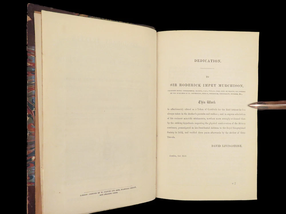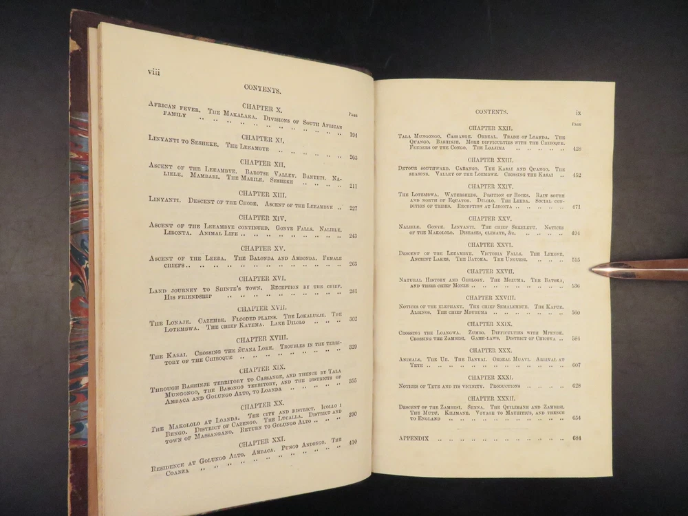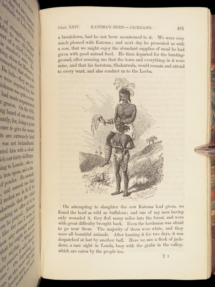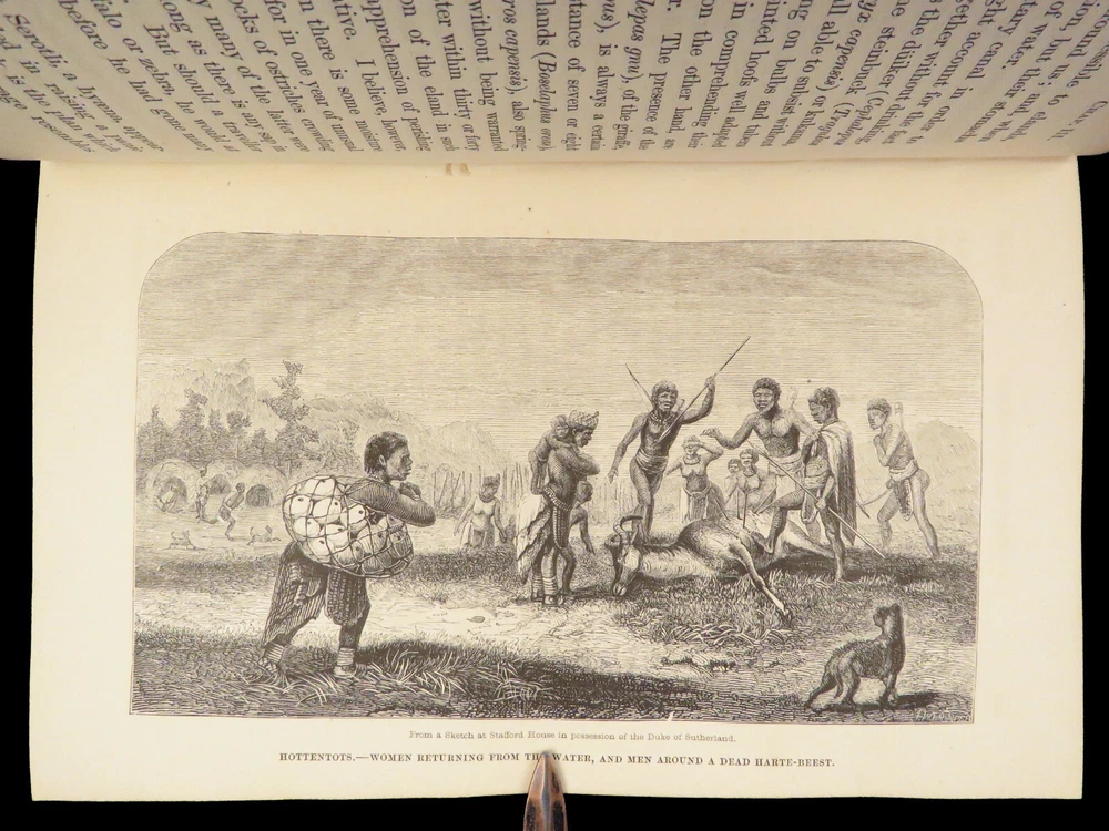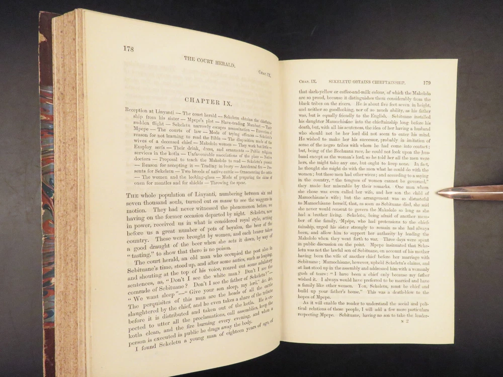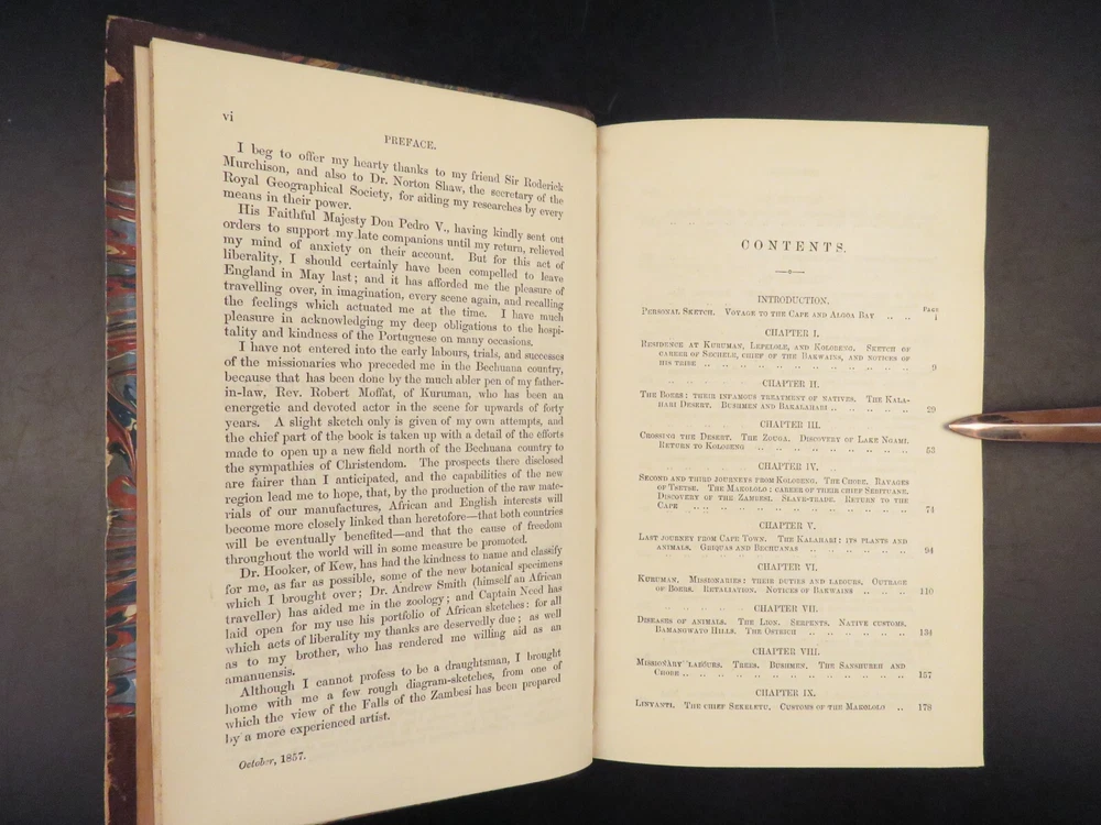 1857 AFRICA 1 ed David Livingstone Missionary Travels Illustrated MAP Angola RARE “If you have men who will only come if they know there is a good road, I don't want them. I want men who will come if there is no road at all.” ― David Livingstone A rare 1857 edition of David Livingstone’s “ Missionary Travels ”. In this book, Livingstone describes his travel and work as a missionary to the indigenous people in Central and South Africa. Through the mid-19th-century, South Africa was completely unknown to Europeans, thus Livingstone’s mission brought light to more than just spreading the gospel. The work deals with customs, languages, animal and plant biology, geology, topography, and mineralogy in Africa. According to PMM, “The geographical results of his journeys were of supreme importance and made it possible to fill in great stretches of the maps of Central Africa which hitherto had been blank.” ( Printing and Mind of Man 341) Livingstone discovered the Zambesi River and Victoria Falls, which he named. He also explored parts of Angola and Mozambique and met with and observed the Hottentot. He was also able to discover some of the most devastating instances of slave trade which propelled his abolitionist ideals. Item number: #26991 Price: $950 LIVINGSTONE, David Missionary Travels And Researches In South Africa London: Murray, 1857. First edition. Details : · Collation: Complete with all pages o ix, [1], 687, [1] o 45 full-page engravings, plus 2 folding maps · References: Czech 97; PMM 341; Abbey Travel 347; Garrison & Morton 5269 o Czech: “Perhaps the most famous of all African exploration books, this recounts Dr. Livingstone's travels through South Africa, with the discovery of Lake Ngami, while accompanied by his wife and William Cotton Oswell. Oswell and the author continued their journey, discovering the Zambesi River, and, eventually, the Victoria Falls” · Language: English · Binding: Leather; tight and secure · Size : ~8.75in X 6in (22cm x 15cm) Our Guarantee: Very Fast. Very Safe. Free Shipping Worldwide. Customer satisfaction is our priority! Notify us with 7 days of receiving, and we will offer a full refund without reservation! 26991