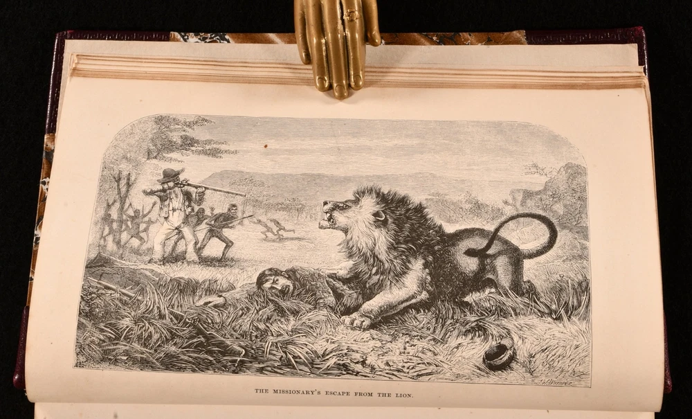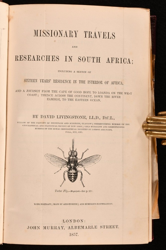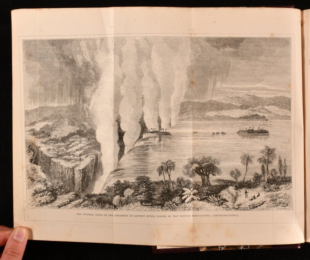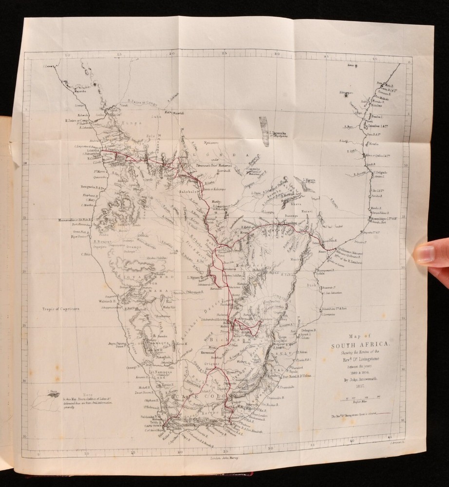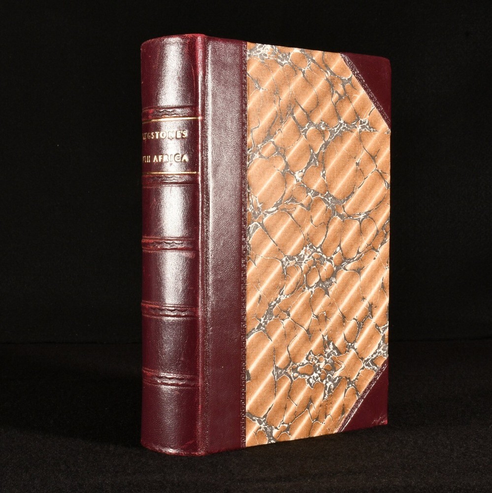 Click here to see our other books! Missionary Travels and Researches in South Africa David Livingstone 1857 John Murray : London 8.5" by 6" [5], vi-ix, [2], 2-687, [1pp] SUMMARY A rebound first edition copy of this important travel work by David Livingstone, complete with illustrations and folding maps. First Edition,Folding Maps,Illustrated,Leather Binding,Rebound Overall Condition: Very Good Indeed This book weighs 1.5 KG when packed UK Postage: £ 3.99 US Postage: £ 23.99 EU Postage : £ 18.99 European Postage: £ 19.99 Asia Postage: £ 31.99 Worldwide Postage: £ 32.99 DESCRIPTION First edition - issue with lithographs facing pages 66 and 225, and no extra leaf after page 8. Illustrated with a folding plate to the frontispiece, three folding maps, one folding plate, twenty-four plates, and in-text engravings. Collated, complete. 'Missionary Travels and Researches in South Africa' shows the intellectual breadth of the author in his descriptions of his experiences working as a missionary and travelling in South Africa. Livingstone was well educated on Africa, having spent his sixteen years there reading extensively on religion, medicine, anthropology, and natural history. It was during these sixteen years that he decided to keep a journal on his experiences, knowing that his reputation as an explorer was rising. This work is written in a conversational style with humorous tones. He offers a fantastic, enlightening, and detailed account of the lives of people in South Africa in the mid nineteenth century. The work was very popular upon publication, seeing twelve-thousand copies of the first impression being sold out before publication. David Livingstone was a Victorian hero for his work with the London Missionary Society, as a medical pioneer and explorer in Africa. This book gives great detail into his explorations, including an insight into the years in which is was missing and presumed dead by British authorities. Prior owner's ink inscription to the recto to the front free endpaper, 'The Reverend Thomas Green, B.A., Presented to him by the members of his Bible class as a token of esteem, Ryecroft, 9th December 1857'. CONDITION In a half morocco binding with marbled paper to the boards. Externally, smart. A little rubbing to the spine and extremities. Prior owner's ink inscription to the recto to the front free endpaper. Internally, firmly bound. Pages are bright and generally clean with some spots, including to the folding maps. A little edge wear to the folding maps. Overall Condition: Very Good Indeed GLOSSARY OF TERMS Overall Condition (Dustwrapper condition rating is shown after that for the book itself, where a dustwrapper is present) Fine - Very well preserved copy showing very little wear Very Good Indeed - Only one or two minor faults, really a very attractive copy Very Good - Quite a wide term meaning no major faults but probably several smaller ones often expected given the age of the book, but still a respectable copy Good - Meaning not very good. Some more serious faults as will be described in the condition report under 'condition' Good Only - Meaning one or more faults that could really do with repair Fair - As with good only above but with other faults leaving a compromised copy even after repair Poor - Really bad and possibly seriously incomplete. We only sell books in this condition where their rarity or value makes them attractive none the less. Major defects will be described. GUARANTEE We offer a full money back guarantee on our descriptions. Please ask for details and conditions. We prefer PAYPAL. If you pay via PAYPAL we will post the item off the same or the next working day with the postage you have selected. Please note we cannot accept USD cheques