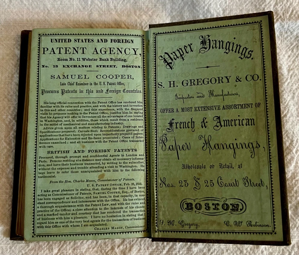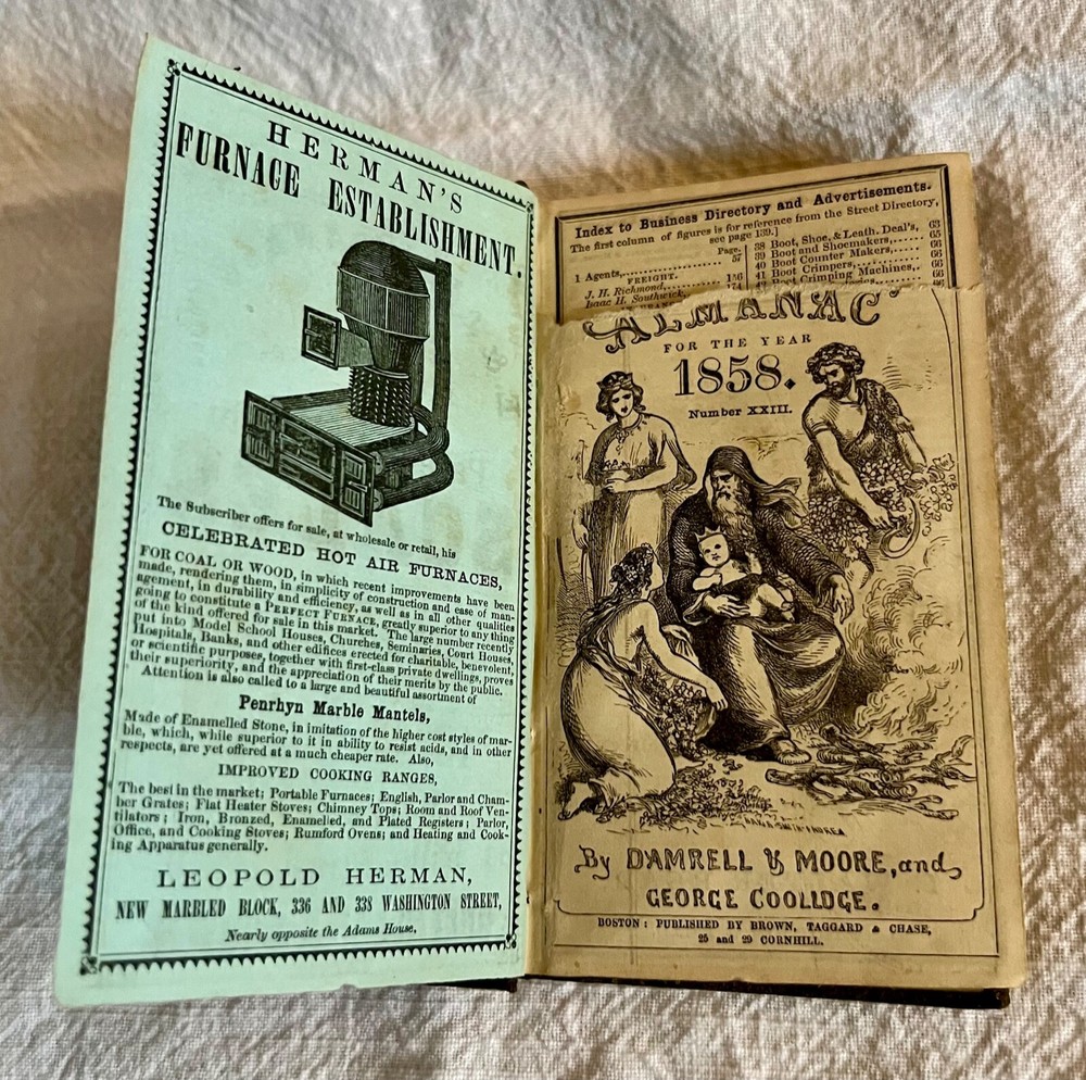 Explore the historical tapestry of New England with the 1858 Boston Almanac, a vintage treasure bound in rich brown leather. This almanac serves not only as a reference but also as a collector's piece, featuring a detailed map that offers a unique glimpse into the past geography of the United States. With its pages steeped in the language of 1858, this almanac provides more than just aesthetic appeal; it offers a journey through the societal norms and cultural references of a bygone era. Perfect for collectors and enthusiasts of antique publications, this piece is a testament to the enduring charm of historic New England.