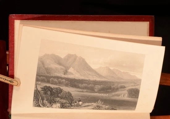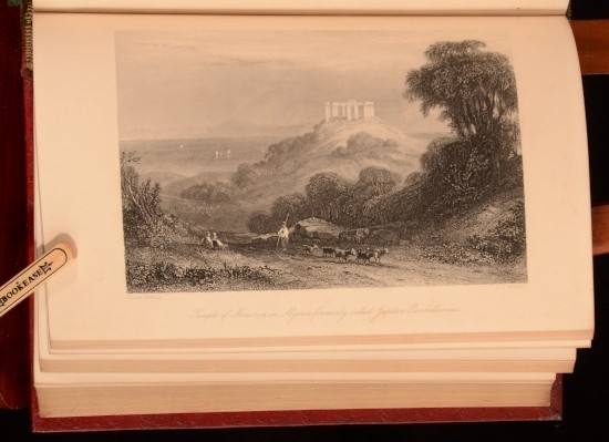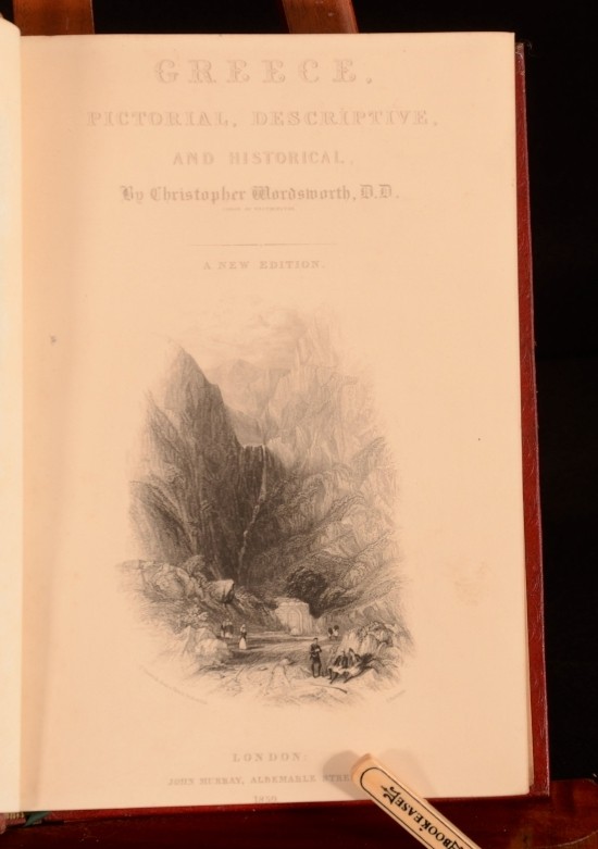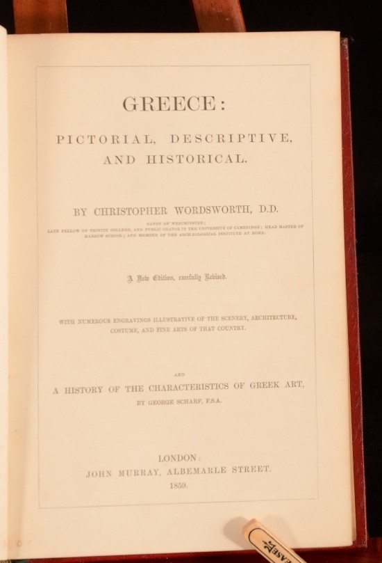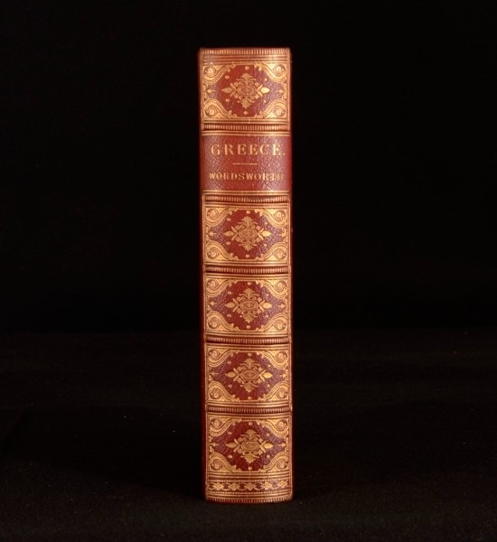 Click here to see our other books! Greece Pictorial, Descriptive and Historical Christopher Wordsworth 1859 John Murray : London 10" by 6.5" xxiv, 452, [4] pp SUMMARY A beautifully bound and illustrated copy of this work on Greece. Illustrated,Leather Binding Overall Condition: Fine This book weighs 3 KG when packed UK Postage: £ 3.99 US Postage: £ 36.99 EU Postage : £ 25.99 European Postage: £ 27.99 Asia Postage: £ 47.99 Worldwide Postage: £ 69.99 DESCRIPTION In an attractive red morocco binding with gilt detailing. Original publisher's advertisements to the rear. Profusely illustrated with fifteen steel engraved plates, four maps, one plan and numerous engravings in the text. Christopher Wordsworth was an English bishop in the Anglican Church, a man of letters, author and nephew of the poet William Wordsworth. He went on a tour of Greece between 1832-1833 after which he published various works on the topography and archaeology of the region, of which this is his most famous. CONDITION In a sumptuous publisher's full morocco binding elaborately decorated with all over gilt and gilt edges. Externally, in lovely condition with just some minor shelfwear. Internally, firmly bound. Pages bright and clean with just the occasional handling mark. Eton presentation inscription to an early page dated 1871. Overall Condition: Fine GLOSSARY OF TERMS Overall Condition (Dustwrapper condition rating is shown after that for the book itself, where a dustwrapper is present) Fine - Very well preserved copy showing very little wear Very Good Indeed - Only one or two minor faults, really a very attractive copy Very Good - Quite a wide term meaning no major faults but probably several smaller ones often expected given the age of the book, but still a respectable copy Good - Meaning not very good. Some more serious faults as will be described in the condition report under 'condition' Good Only - Meaning one or more faults that could really do with repair Fair - As with good only above but with other faults leaving a compromised copy even after repair Poor - Really bad and possibly seriously incomplete. We only sell books in this condition where their rarity or value makes them attractive none the less. Major defects will be described. GUARANTEE We offer a full money back guarantee on our descriptions. Please ask for details and conditions. We prefer PAYPAL. If you pay via PAYPAL we will post the item off the same or the next working day with the postage you have selected. Please note we cannot accept USD cheques