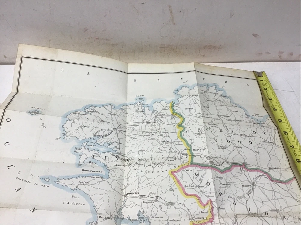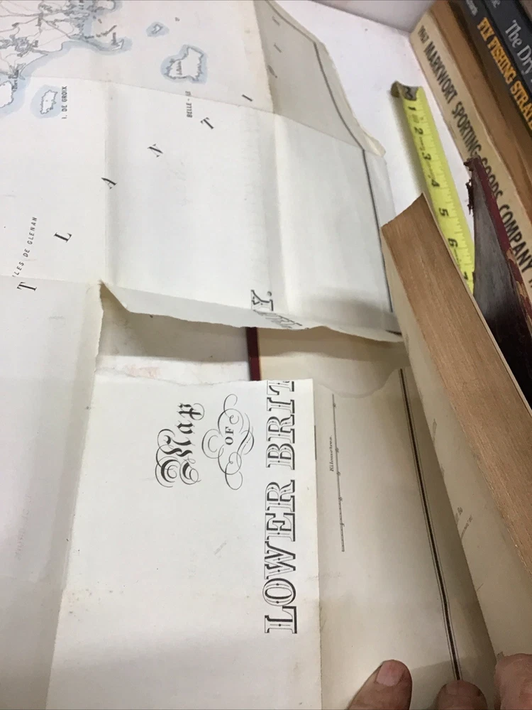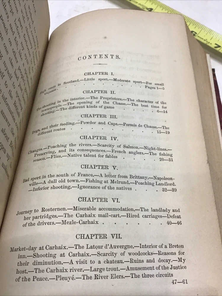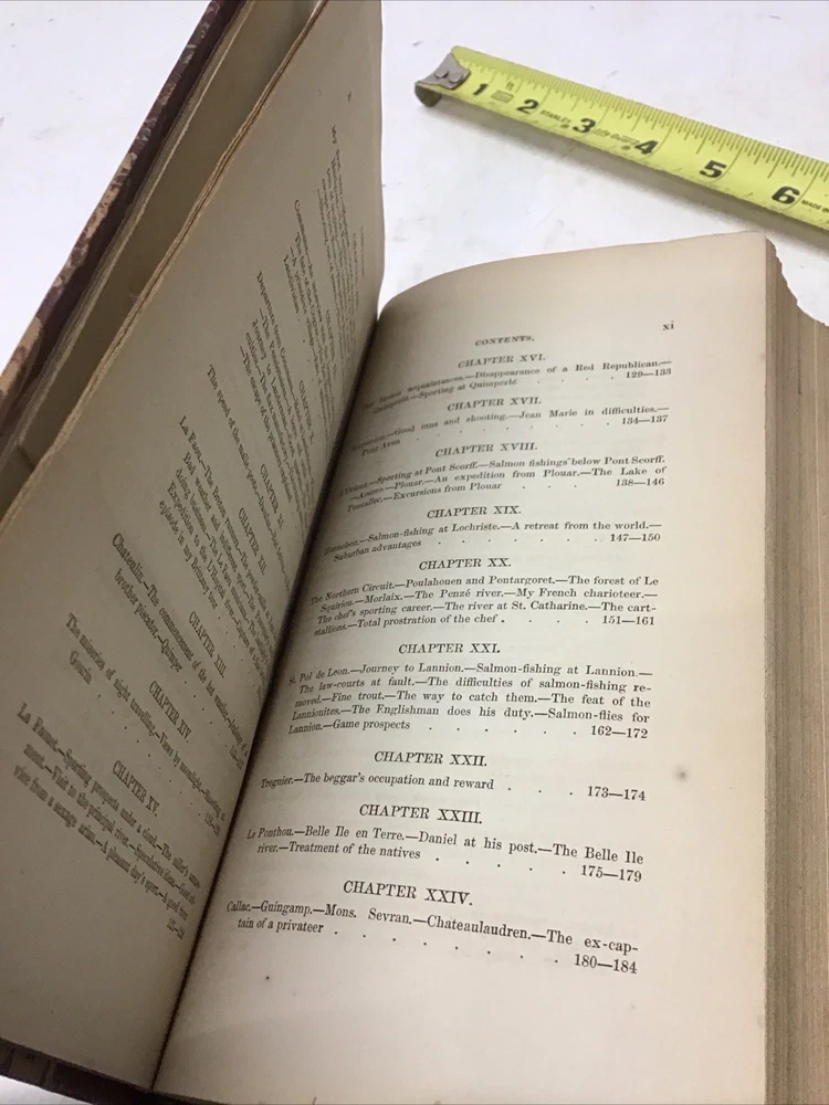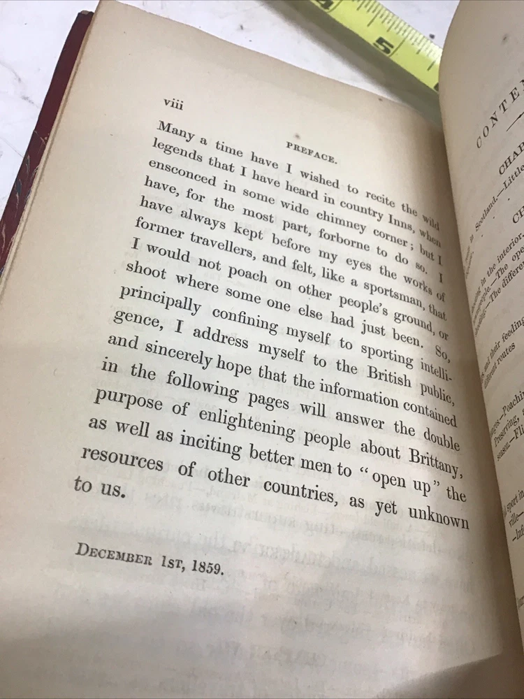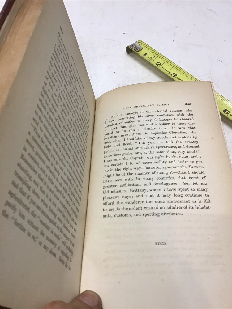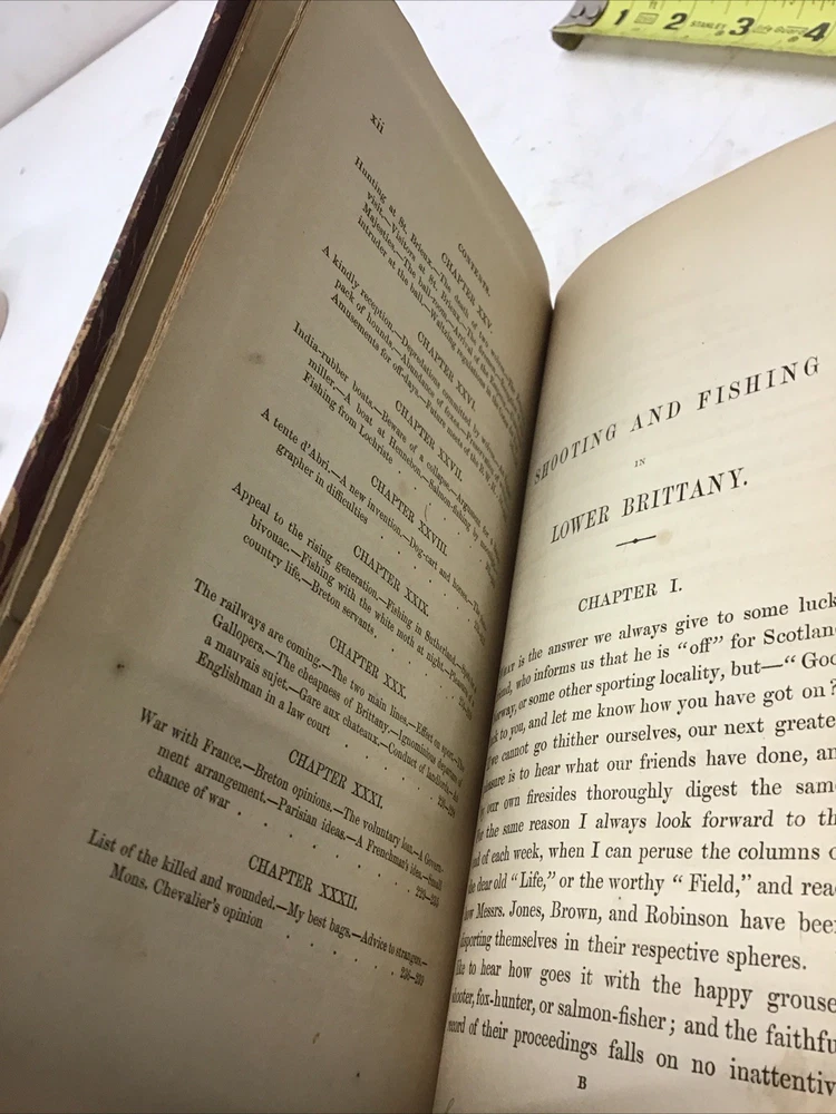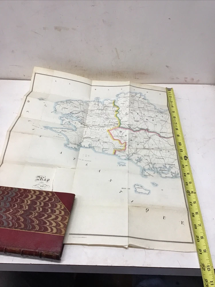 1859 Shooting and Fishing in Lower Brittany by John Kemp is an antique book that delves into the hunting and fishing practices in the region of Lower Brittany, France. The book, published in 1859, provides insights into outdoor and nature activities in the area, making it a valuable collectible for those interested in hunting and fishing history. With a folding map included, readers can easily explore the locations and activities described in the book, making it a comprehensive resource for enthusiasts of the outdoors. Shooting and Fishing in Lower Brittany. A complete and practical guide to sportsmen. Kemp, John Published by Longmans, Green, Longman and Roberts, London, 1859 1859 Shooting and Fishing in Lower Brittany By John Kemp/Folding Map 17.5” x 21” Size 5.25” x 8.1/8” 239 pages Front cover has been detached and is supported by tape and is stiff and attached being 165+ years old. The folding 17.5” x 21” map has bright colors and has a tear that but complete as seen in pictures. Has bookplate of Chloe Crone Woods and name of previous 1899 owner. Has marbleized endpapers. Keep in mind the shipping price also covers handling fees, packaging materials & time, not just postage. See our eBay store for thousands of our other items. B16