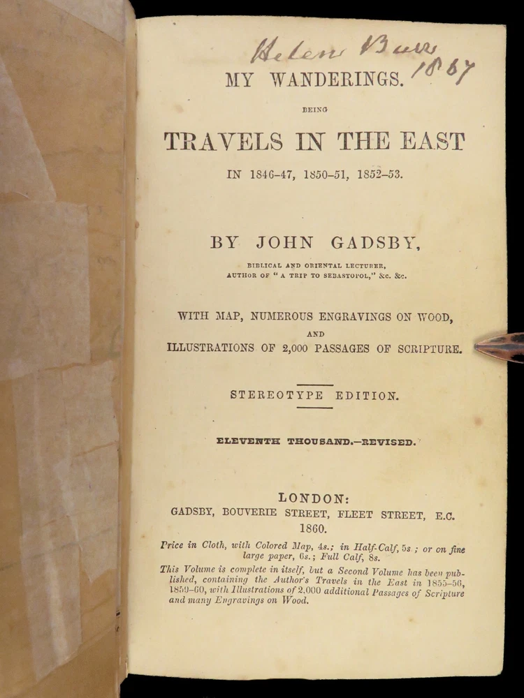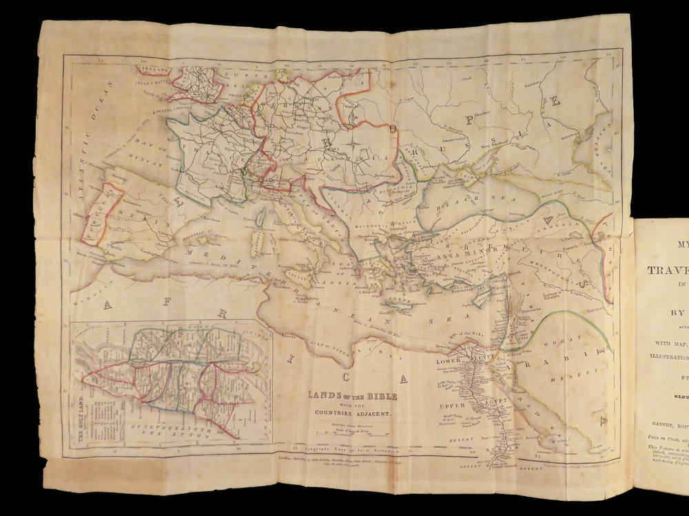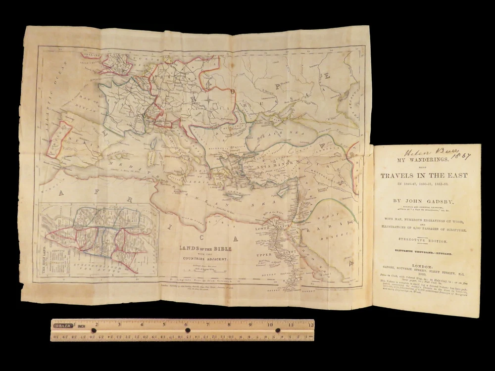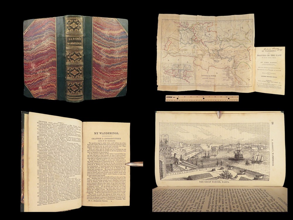 1860 John Gadsby VOYAGES Holy Land Rome Pompeii Cairo Egypt Jerusalem MAP A rare, 19 th -century travelogue by John Gadsby. Gadsby, an English voyager, traveled throughout Southern Europe, the Middle East and Holy Land in the 1840s-50s. This journey prompted an impressive and detailed account of his experiences in Egypt, Jerusalem, Rome, Pompeii, Smyrna, Thebes, and everywhere in between. This 1860 edition of his voyages includes an impressive, folding map with hand-painted country borders. Item number: #27067 Price: $499 GADSBY, John My wanderings. Being travels in the East in 1846-47, 1850-51, 1853-53. London: Gadsby, 1860. Details : · Collation: Complete with all pages o 594, [30] o Folding color map o Dozens of in-text woodcuts · Provenance: Handwritten o Sarah Anne Burr, [18]62 o Helen Burr, 1867 · Language: English · Binding: Leather; tight and secure o Marbled boards · Size : ~7.5in X 4.5in (19cm x 11.5cm) Our Guarantee: Very Fast. Very Safe. Free Shipping Worldwide. Customer satisfaction is our priority! Notify us with 7 days of receiving, and we will offer a full refund without reservation!