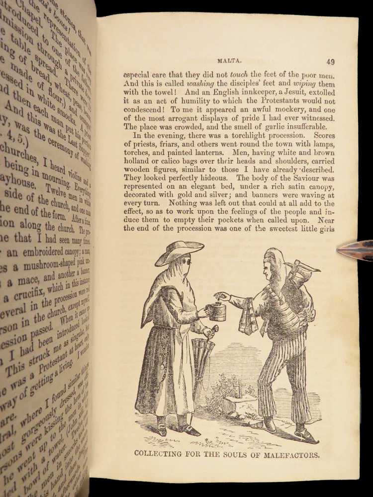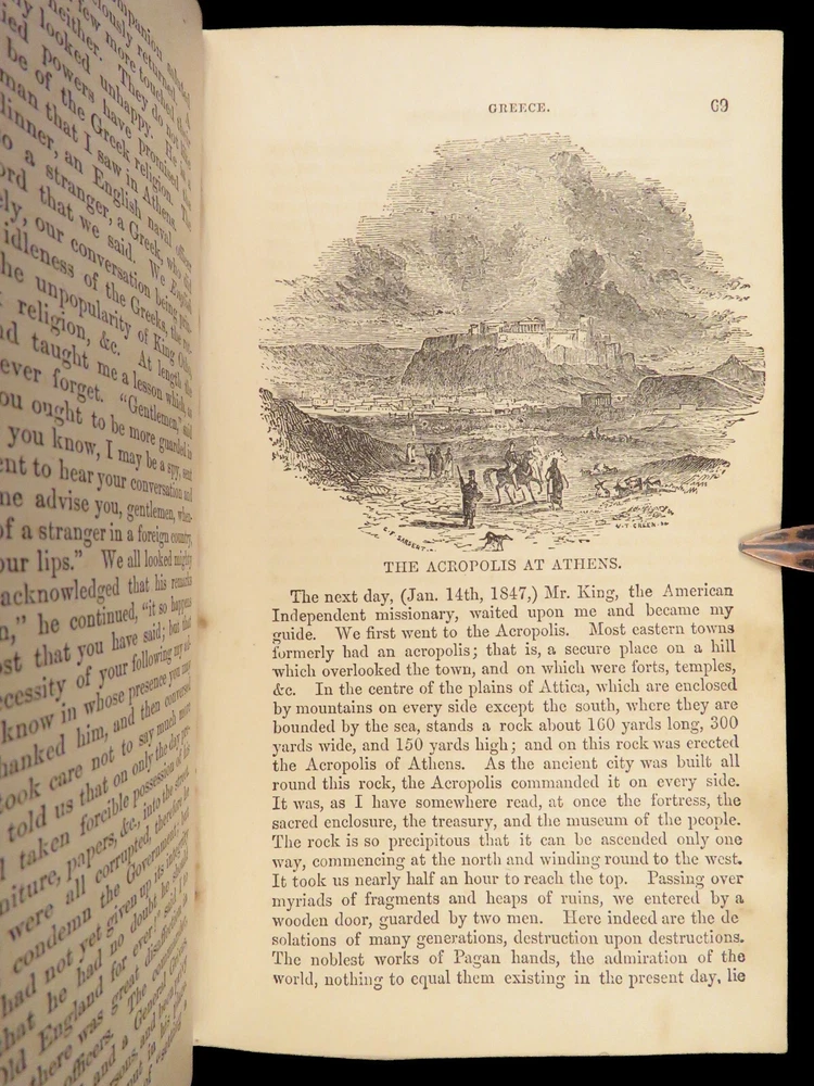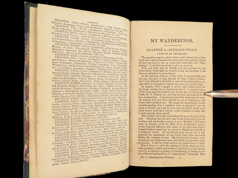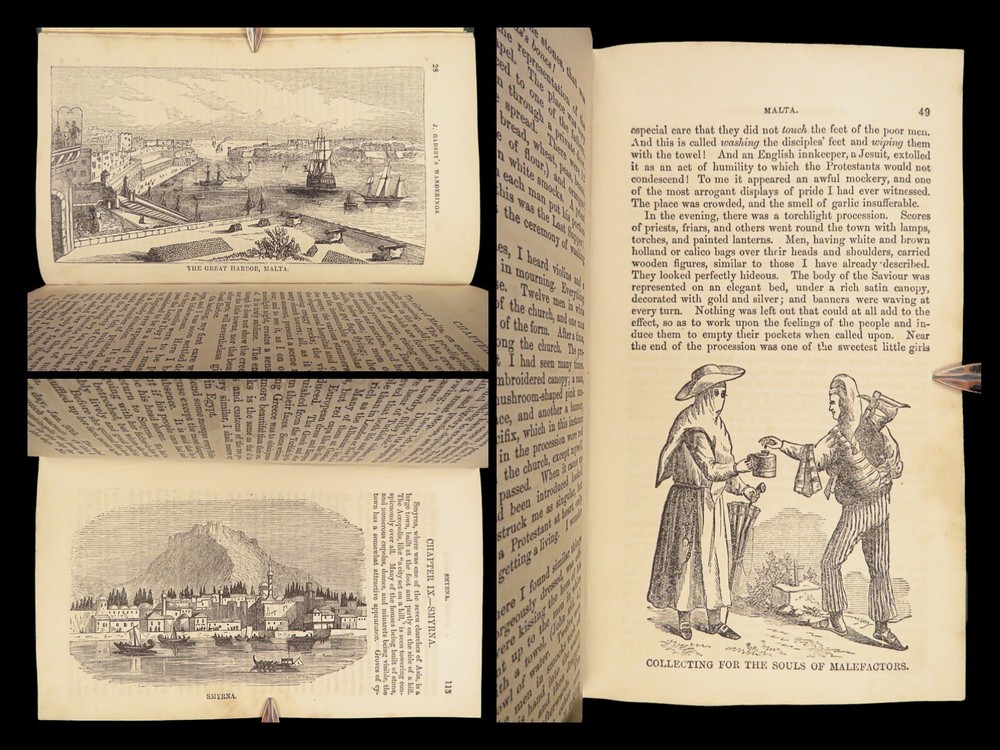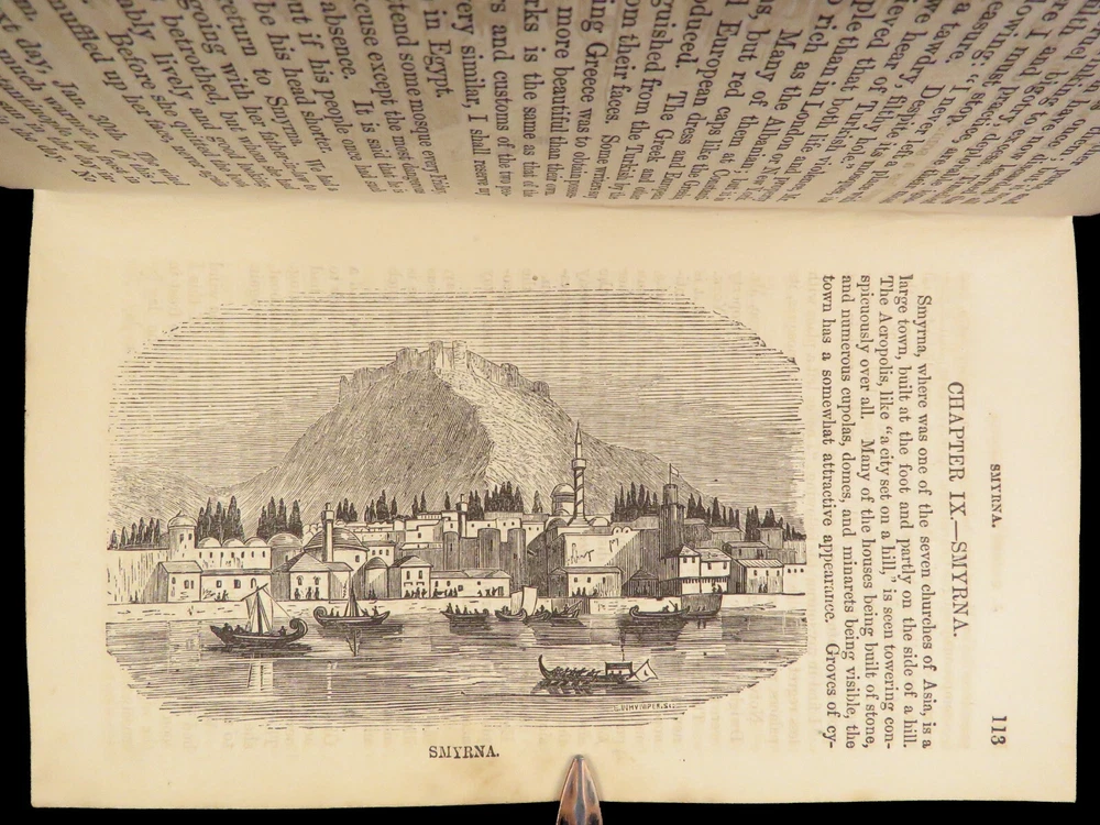1860 John Gadsby VOYAGES Holy Land Rome Pompeii Cairo Egypt Jerusalem MAP A rare, 19 th -century travelogue by John Gadsby. Gadsby, an English voyager, traveled throughout Southern Europe, the Middle East and Holy Land in the 1840s-50s. This journey prompted an impressive and detailed account of his experiences in Egypt, Jerusalem, Rome, Pompeii, Smyrna, Thebes, and everywhere in between. This 1860 edition of his voyages includes an impressive, folding map with hand-painted country borders. Item number: #27067 Price: $499 GADSBY, John My wanderings. Being travels in the East in 1846-47, 1850-51, 1853-53. London: Gadsby, 1860. Details : · Collation: Complete with all pages o 594, [30] o Folding color map o Dozens of in-text woodcuts · Provenance: Handwritten o Sarah Anne Burr, [18]62 o Helen Burr, 1867 · Language: English · Binding: Leather; tight and secure o Marbled boards · Size : ~7.5in X 4.5in (19cm x 11.5cm) Our Guarantee: Very Fast. Very Safe. Free Shipping Worldwide. Customer satisfaction is our priority! Notify us with 7 days of receiving, and we will offer a full refund without reservation!