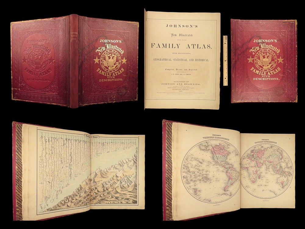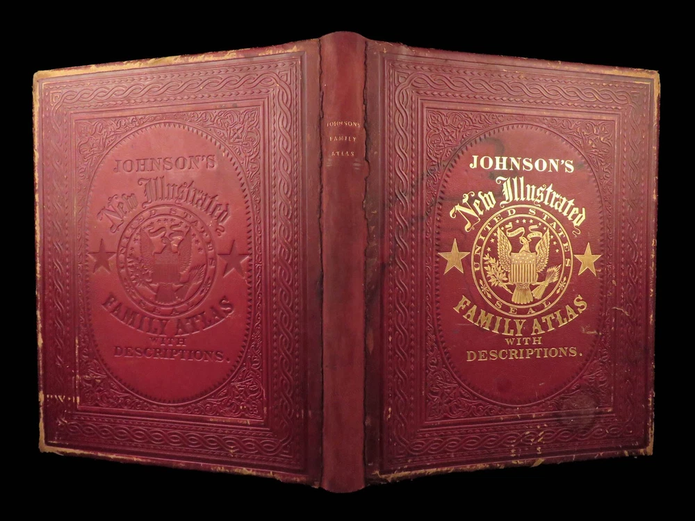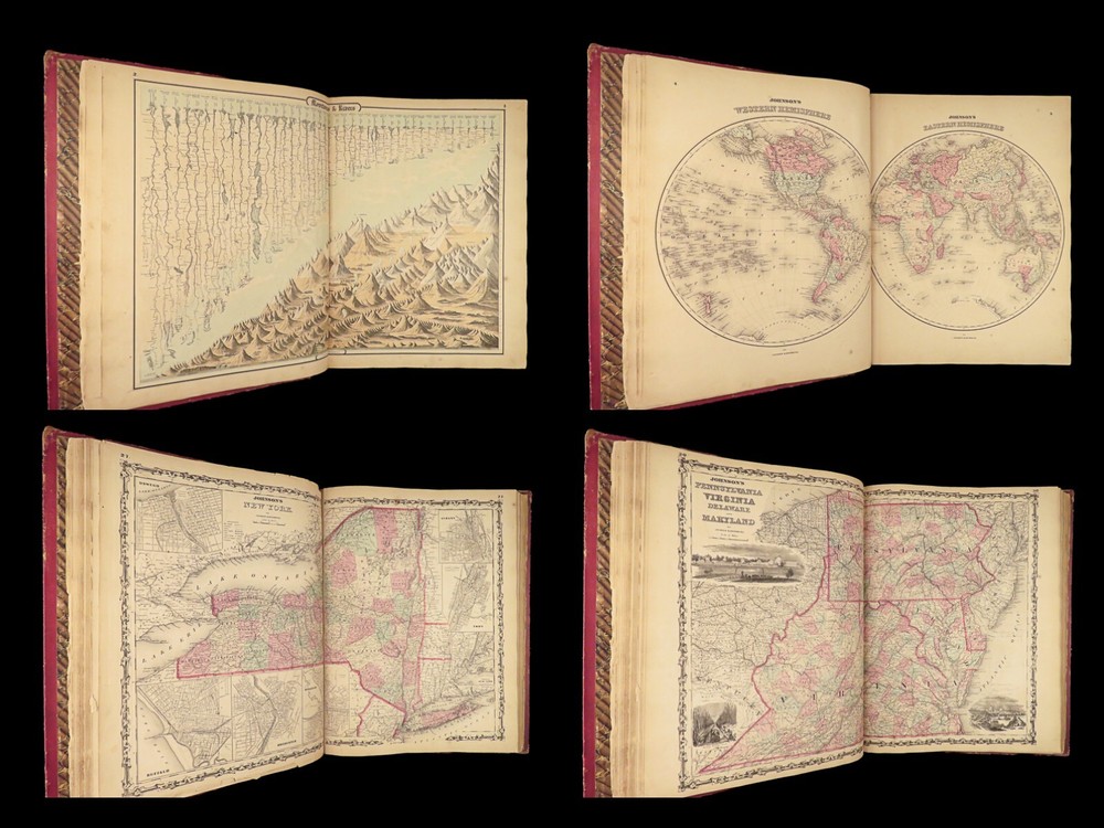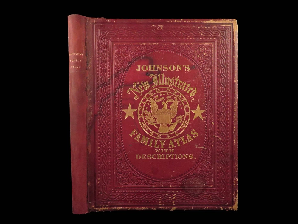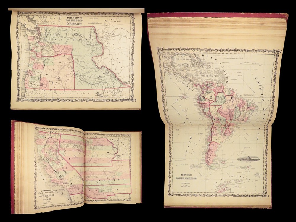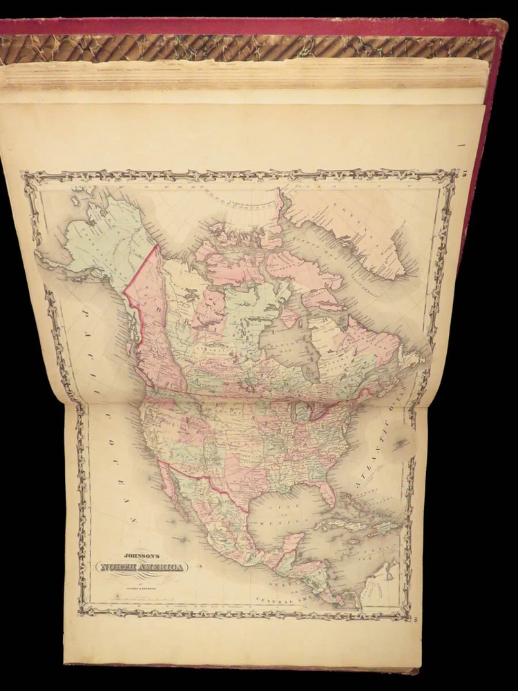1860 Johnson Family ATLAS Geography Color 92 MAPS Texas California New York HUGE “The most impressive issue of the Johnson Family Atlas!” An incredible Civil War-era family atlas! This 92-map atlas consists of colored J.H. Colton maps of states, cities, United States, and countries of the world! Individual maps from this collection are highly sought after and can be found for sale for nearly $500 by themselves! The double-page map of the United States is particularly fine. Alvin Johnson was a famous map publisher in the mid-19 th -century. Historians speculate that J.H. Colton sold the rights to his maps to Johnson, and the result was the masterpiece! Item number: #25311 Price: $2500 JOHNSON, Alvin Jewett Johnson's new illustrated family atlas: with physical geography, and with descriptions, geographical, statistical and historical, including the latest federal census. New York: Johnson, 1860. Details : · Collation: Complete o 99, [1] o 93 engravings and hand-colored maps (including vignette title page) · Language: English · Binding: Leather; tight and secure · Size : ~18.75in X 15in (47.5cm x 38cm) Our Guarantee: Very Fast. Very Safe. Free Shipping Worldwide. Customer satisfaction is our priority! Notify us with 7 days of receiving, and we will offer a full refund without reservation! 25311