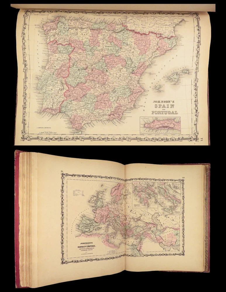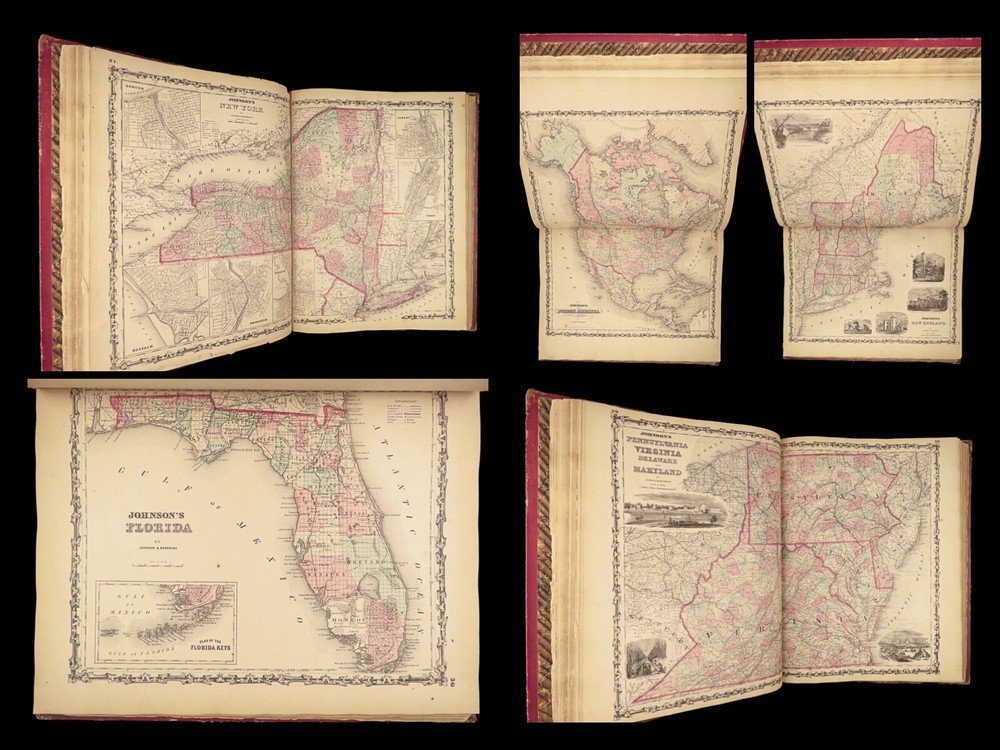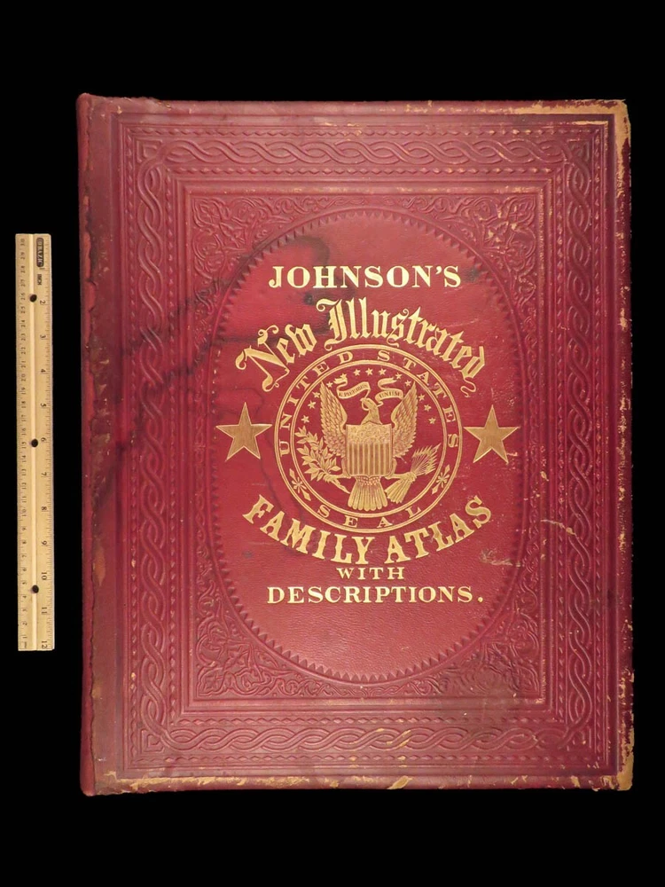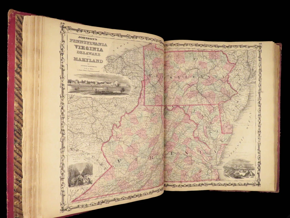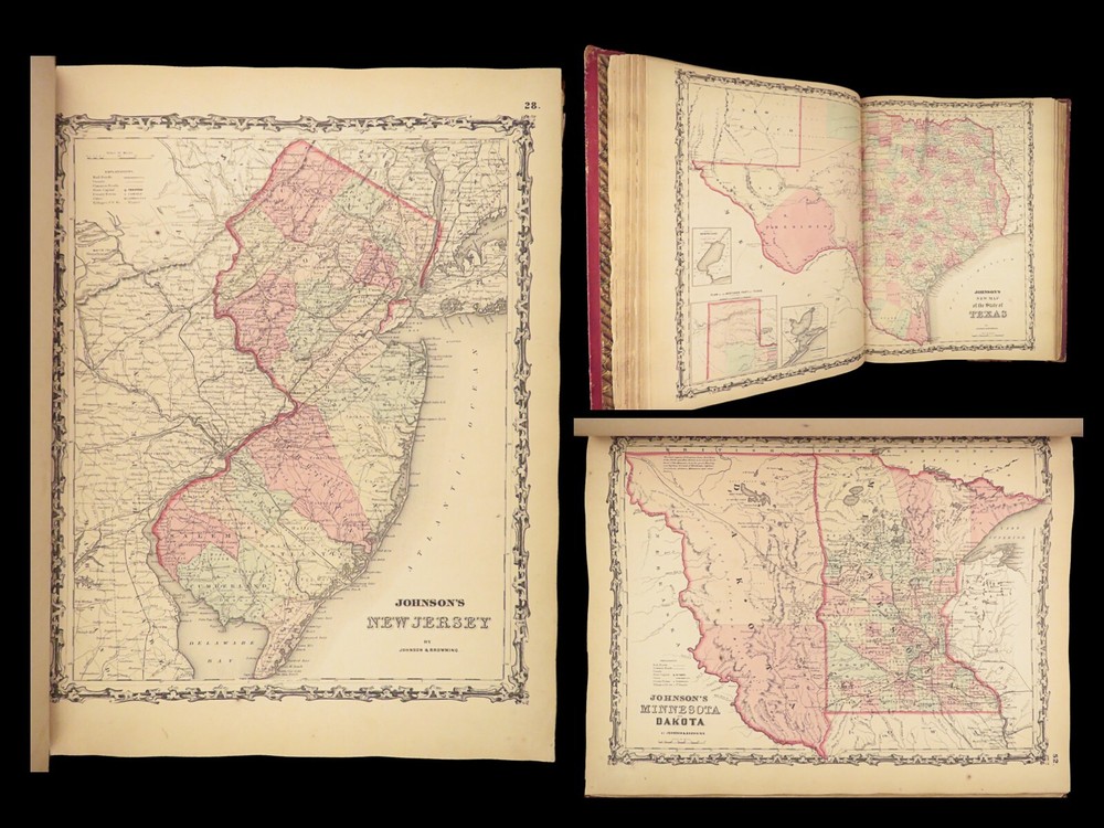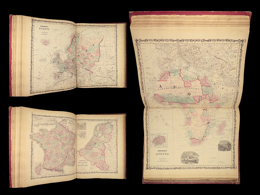 1860 Johnson Family ATLAS Geography Color 92 MAPS Texas California New York HUGE “The most impressive issue of the Johnson Family Atlas!” An incredible Civil War-era family atlas! This 92-map atlas consists of colored J.H. Colton maps of states, cities, United States, and countries of the world! Individual maps from this collection are highly sought after and can be found for sale for nearly $500 by themselves! The double-page map of the United States is particularly fine. Alvin Johnson was a famous map publisher in the mid-19 th -century. Historians speculate that J.H. Colton sold the rights to his maps to Johnson, and the result was the masterpiece! Item number: #25311 Price: $2500 JOHNSON, Alvin Jewett Johnson's new illustrated family atlas: with physical geography, and with descriptions, geographical, statistical and historical, including the latest federal census. New York: Johnson, 1860. Details : · Collation: Complete o 99, [1] o 93 engravings and hand-colored maps (including vignette title page) · Language: English · Binding: Leather; tight and secure · Size : ~18.75in X 15in (47.5cm x 38cm) Our Guarantee: Very Fast. Very Safe. Free Shipping Worldwide. Customer satisfaction is our priority! Notify us with 7 days of receiving, and we will offer a full refund without reservation! 25311