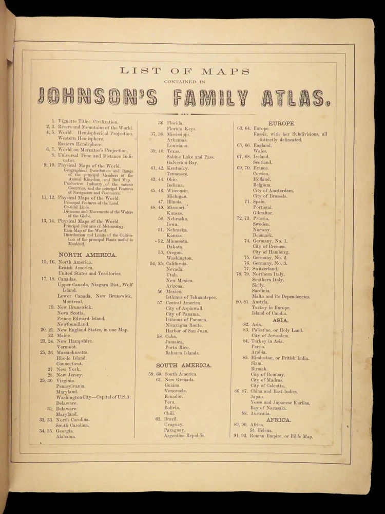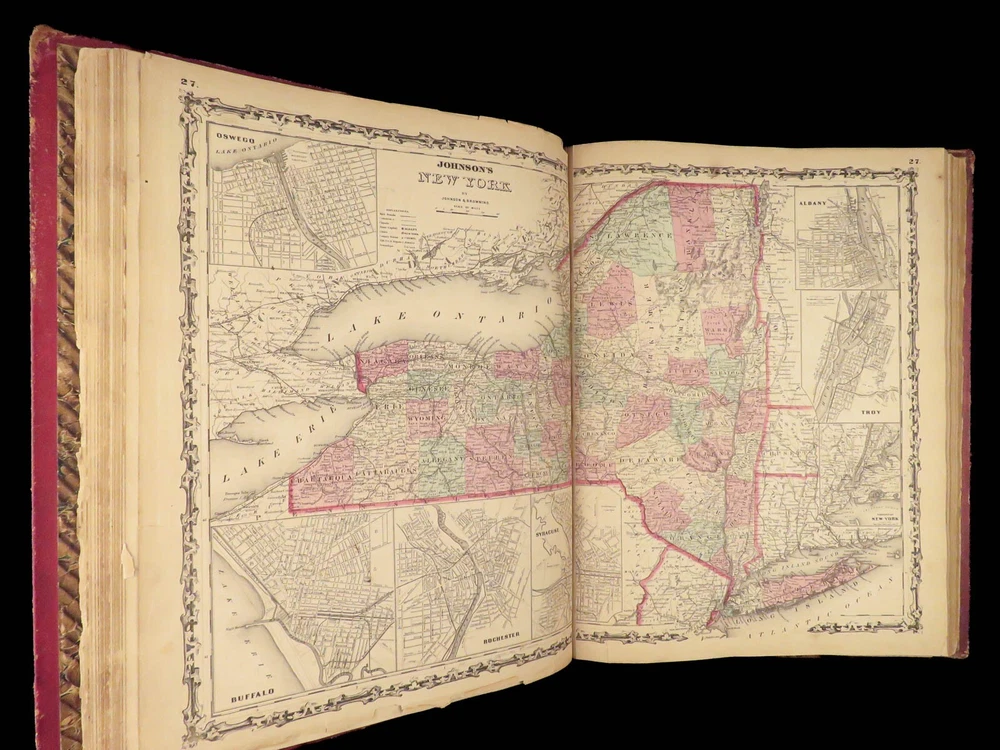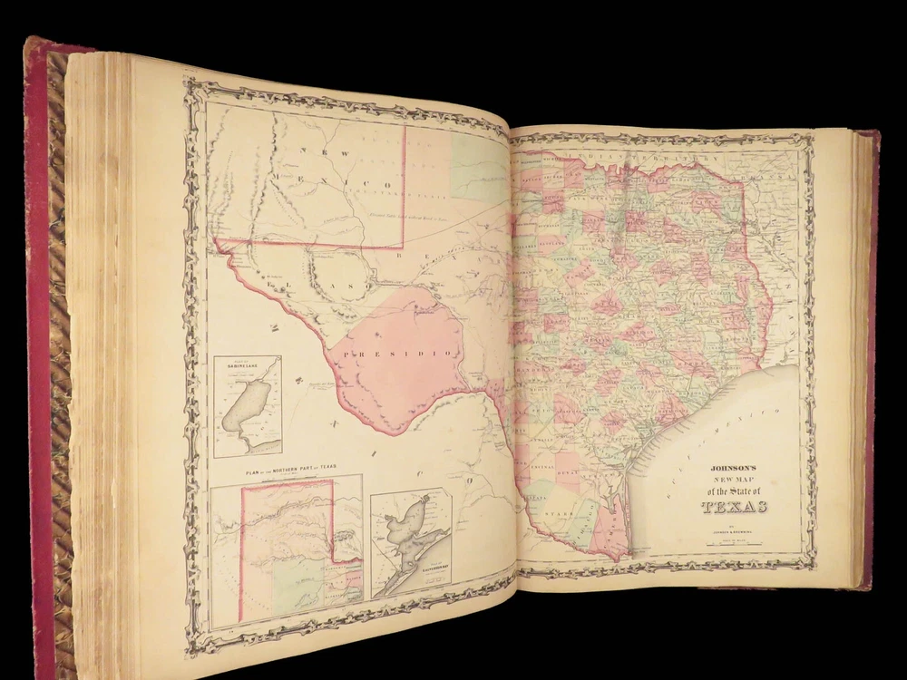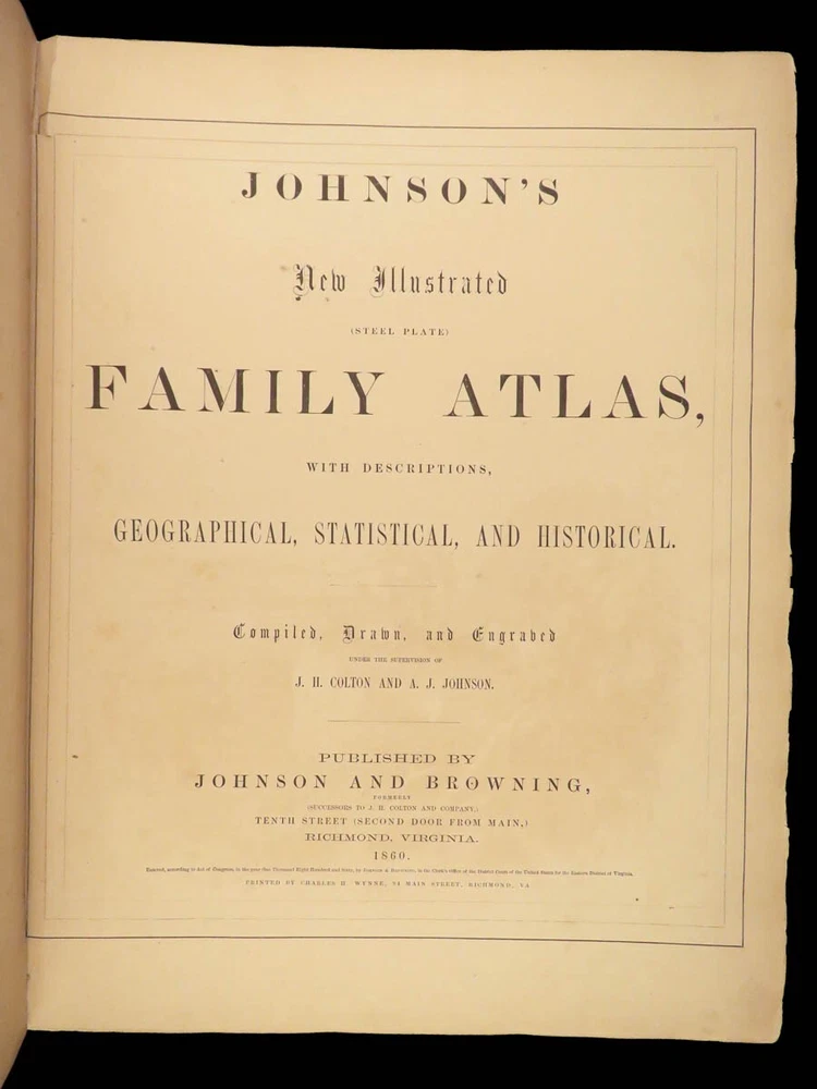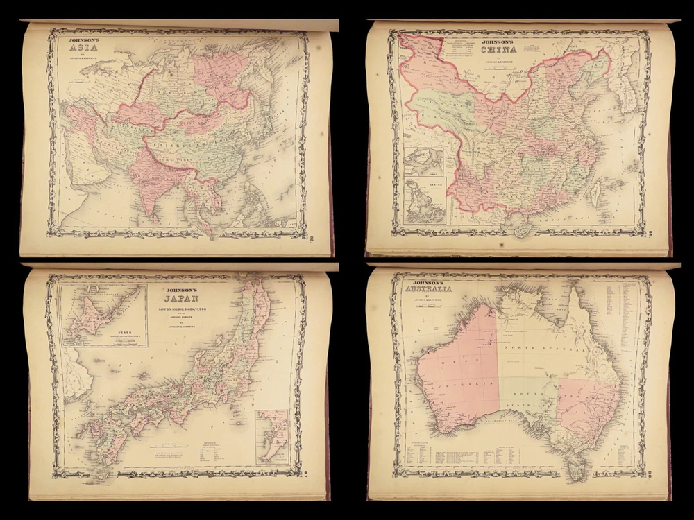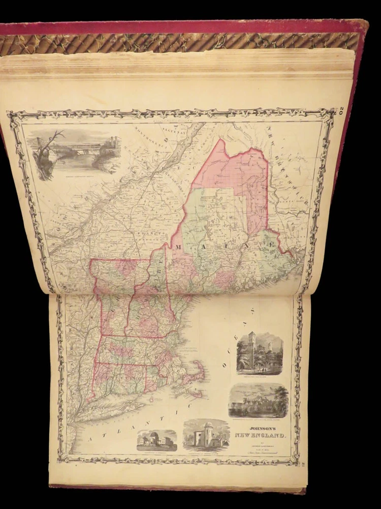 1860 Johnson Family ATLAS Geography Color 92 MAPS Texas California New York HUGE “The most impressive issue of the Johnson Family Atlas!” An incredible Civil War-era family atlas! This 92-map atlas consists of colored J.H. Colton maps of states, cities, United States, and countries of the world! Individual maps from this collection are highly sought after and can be found for sale for nearly $500 by themselves! The double-page map of the United States is particularly fine. Alvin Johnson was a famous map publisher in the mid-19 th -century. Historians speculate that J.H. Colton sold the rights to his maps to Johnson, and the result was the masterpiece! Item number: #25311 Price: $2500 JOHNSON, Alvin Jewett Johnson's new illustrated family atlas: with physical geography, and with descriptions, geographical, statistical and historical, including the latest federal census. New York: Johnson, 1860. Details : · Collation: Complete o 99, [1] o 93 engravings and hand-colored maps (including vignette title page) · Language: English · Binding: Leather; tight and secure · Size : ~18.75in X 15in (47.5cm x 38cm) Our Guarantee: Very Fast. Very Safe. Free Shipping Worldwide. Customer satisfaction is our priority! Notify us with 7 days of receiving, and we will offer a full refund without reservation! 25311