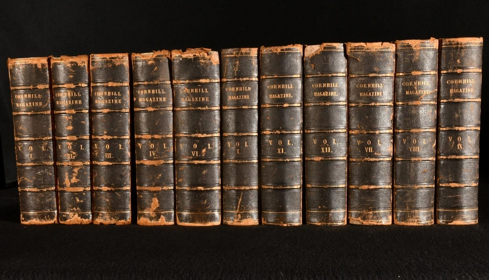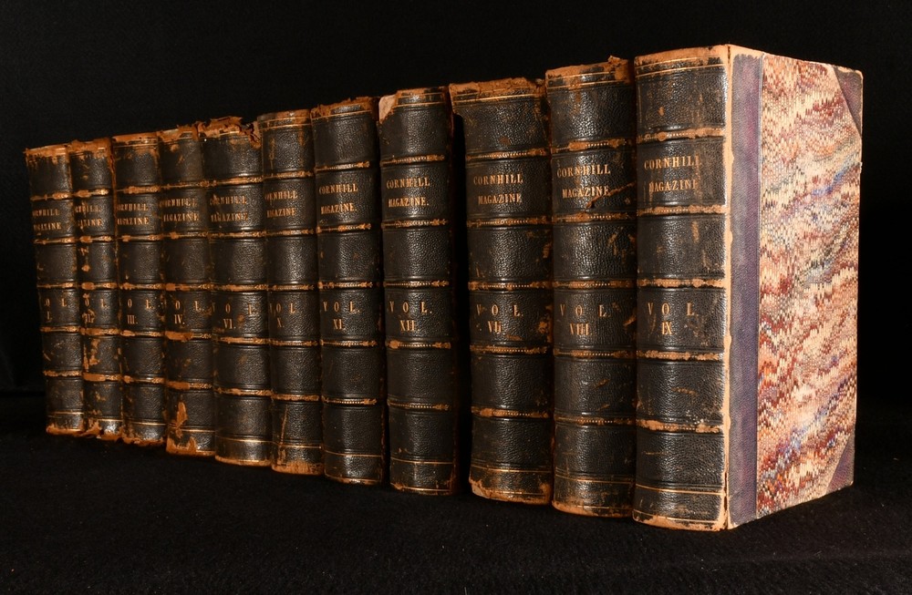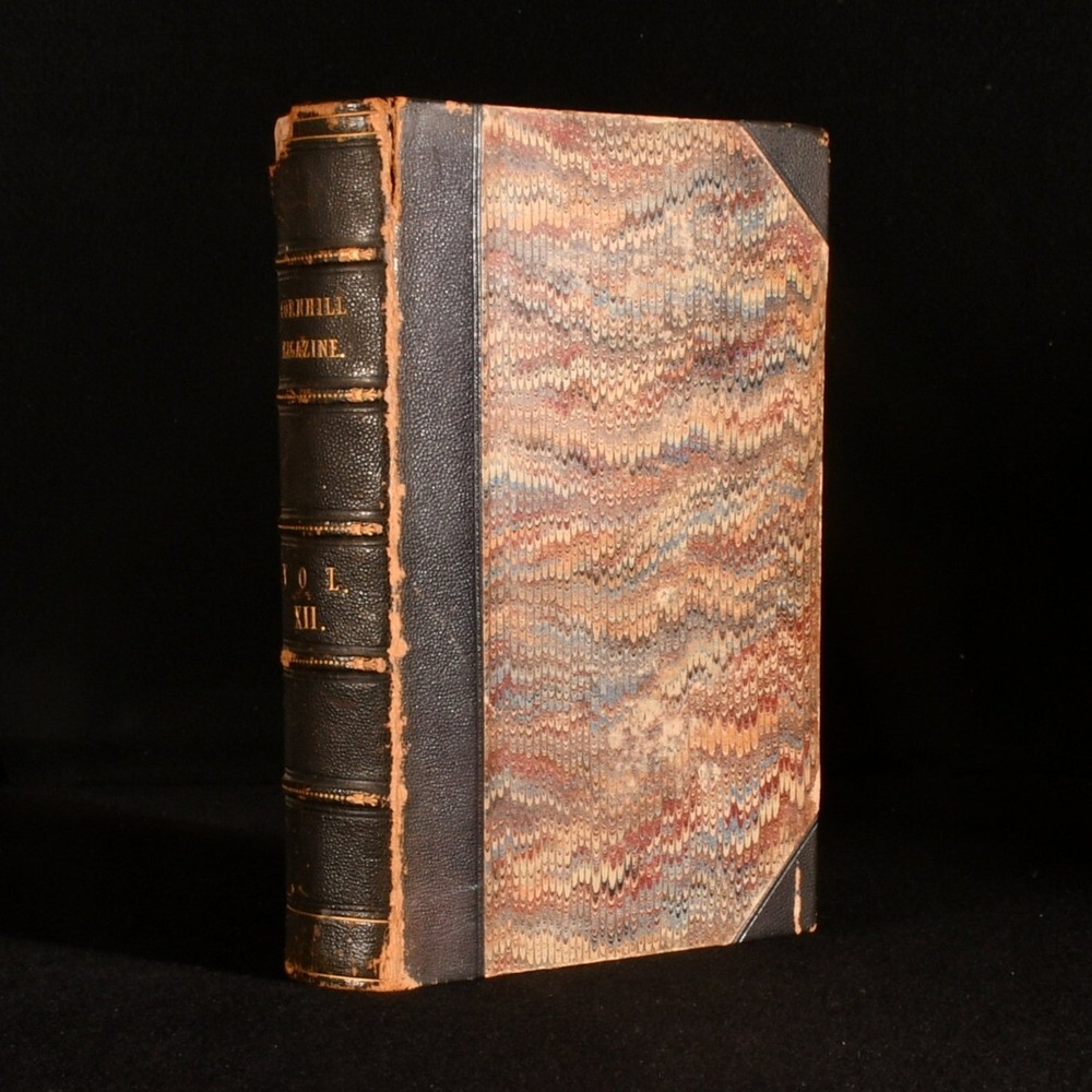 Click here to see our other books! Volumes I-4 and 6-12 of The Cornhill Magazine William Makepeace Thackeray [ed.] 1860-1865 Smith, Elder and Co. : London 8.5" by 5.5" vi, 760pp; vi, 760pp; vi, 760pp; vi, 760pp; vi, 760pp; vii, 856pp; vii, 804pp; vi, 760pp; vii, 760pp; vii, 760pp; vii, 760pp; vii, 760pp SUMMARY 11 volumes of popular the Victorian literary journal, The Cornhill Magazine Folding Maps,Folding Plates,Illustrated,Leather Binding Overall Condition: Good This book weighs 15 KG when packed UK Postage: £ 4.49 US Postage: £ 79.99 EU Postage : £ 40.99 European Postage: £ 75.99 Asia Postage: £ 159.99 Worldwide Postage: £ 249.99 DESCRIPTION 11 Volumes of The Cornhill Magazine, dating from January 1860 to December 1965. This collection is comprised of volumes I-IV and VI-XII (missing volume V). The Cornhill magazine was a monthly literary journal containing articles on a diverse range of subjects, as well as poems and serialised novels. Although issues continued to be published until 1975, the magazine reached the peak of its popularity under the editorship of William Makepeace Thackeray between 1860 and 1870. This collection contains novels such as Anthony Trollope's Framley Personage, Armadale by Wilkie Collins, William Thackeray's Denis Duval, and the first appearance of George Eliot's popular story, Romola. As well as Thackeray's Roudabout papers, the volumes also contain poetry by Charlotte Bronte, Alfred Tennyson, and Elizabeth Barrett Browning. Each volume is illustrated with between 12 and 24 plates, and volumes I, III, IV, and VI contain folding maps or folding plates. All volumes are complete, although some plates appear on different pages than listed. In volume I, the plate called for at page 194 is on page 197, and the plate listed at page 233 is on page 247. In volume II, the plate called for page 13 is the frontispiece, the illustration called for at page 272 can be found at page 252, and the plate called for at 472 can be found at 462. In volume VII, the plate listed at page 207 can be found at page 202. Chip in page 385 in volume II. Sticker of Howell and Day Booksellers, Printers and Stationers in Birmingham to front pastedown of volume VIII. CONDITION In a half calf binding over marbled boards. Externally sound with some light rubbing to the boards and some scuffing to the leather at the spine. There are small closed tears the head of the spine of volume IV, the front joint of volume XIII is tender so some of the leather flaps at the head, and there is also some loss of leather to the head of volume XII. Front joint starting in volumes II and VII, and rear joints starting in volumes I and VI. The front hinge is starting in volume XII, and the rear hinges of volumes X and XI are also starting. Internally, generally firmly bound. Pages are generally bright and clean with some occasional spotting, particularly at the plates. Overall Condition: Good GLOSSARY OF TERMS Overall Condition (Dustwrapper condition rating is shown after that for the book itself, where a dustwrapper is present) Fine - Very well preserved copy showing very little wear Very Good Indeed - Only one or two minor faults, really a very attractive copy Very Good - Quite a wide term meaning no major faults but probably several smaller ones often expected given the age of the book, but still a respectable copy Good - Meaning not very good. Some more serious faults as will be described in the condition report under 'condition' Good Only - Meaning one or more faults that could really do with repair Fair - As with good only above but with other faults leaving a compromised copy even after repair Poor - Really bad and possibly seriously incomplete. We only sell books in this condition where their rarity or value makes them attractive none the less. Major defects will be described. GUARANTEE We offer a full money back guarantee on our descriptions. Please ask for details and conditions. We prefer PAYPAL. If you pay via PAYPAL we will post the item off the same or the next working day with the postage you have selected. Please note we cannot accept USD cheques