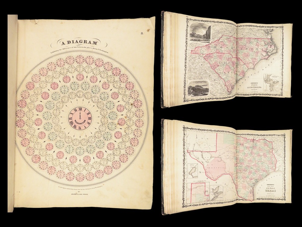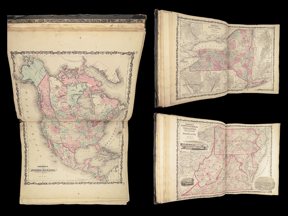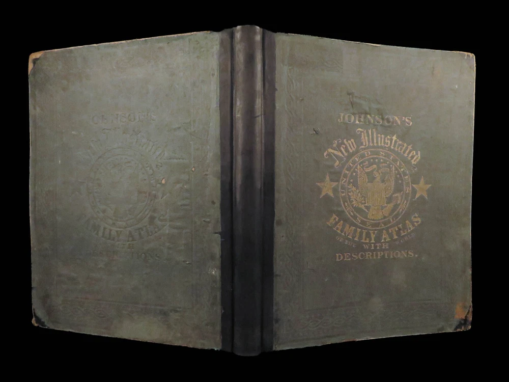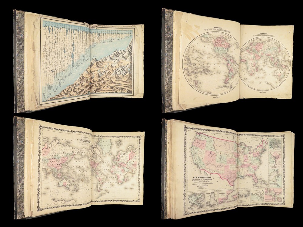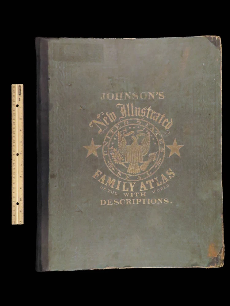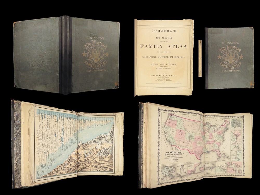 1863 Johnson Family ATLAS Geography Color MAPS Texas California New York HUGE “The most unusual issue of the Johnson Family Atlas!” An incredible Civil War-era family atlas! This atlas consists of nearly 100 colored J.H. Colton maps of states, cities, United States, and countries of the world! Individual maps from this collection are highly sought after and can be found for sale for nearly $500 by themselves! The double-page illustration of the world maps is particularly fine. Alvin Johnson was a famous map publisher in the mid-19 th -century. Historians speculate that J.H. Colton sold the rights to his maps to Johnson, and the result was the masterpiece! According to Geographicus, “ The 1863 issue of the Family Atlas was the most unusual , it being a compilation of older Johnson and Browning maps, updated 1862 Johnson and Ward map issues, and newer 1863 maps with a revised border design.” Item number: #27410 Price: $1950 JOHNSON, Alvin Jewett. Johnson's new illustrated family atlas: with physical geography, and with descriptions, geographical, statistical and historical, including the latest federal census. New York: Johnson and Ward, 1863. Details : · Collation: o [2], 99, [1] § Some pages bound out of order, but present o Illustrated throughout, 97 plates § Wanting maps 13-14 · Language: English · Binding: Leather; tight and secure · Size: ~18.5in X 15in (48.5cm x 38cm) Our Guarantee: Very Fast. Very Safe. Free Shipping Worldwide. Customer satisfaction is our priority! Notify us with 7 days of receiving, and we will offer a full refund without reservation!