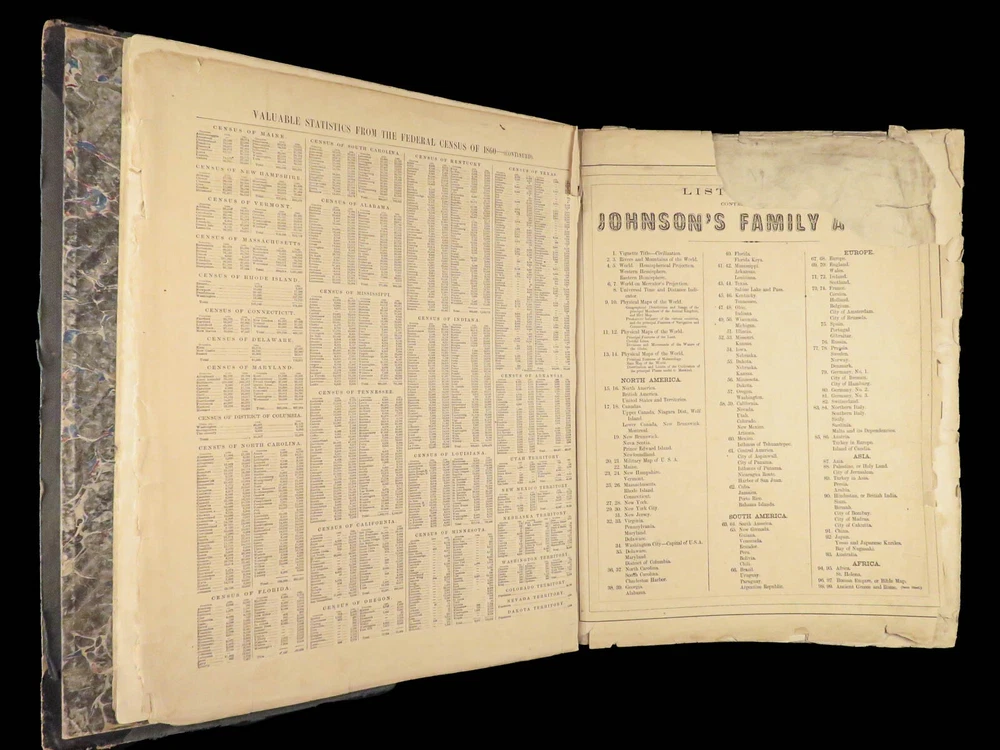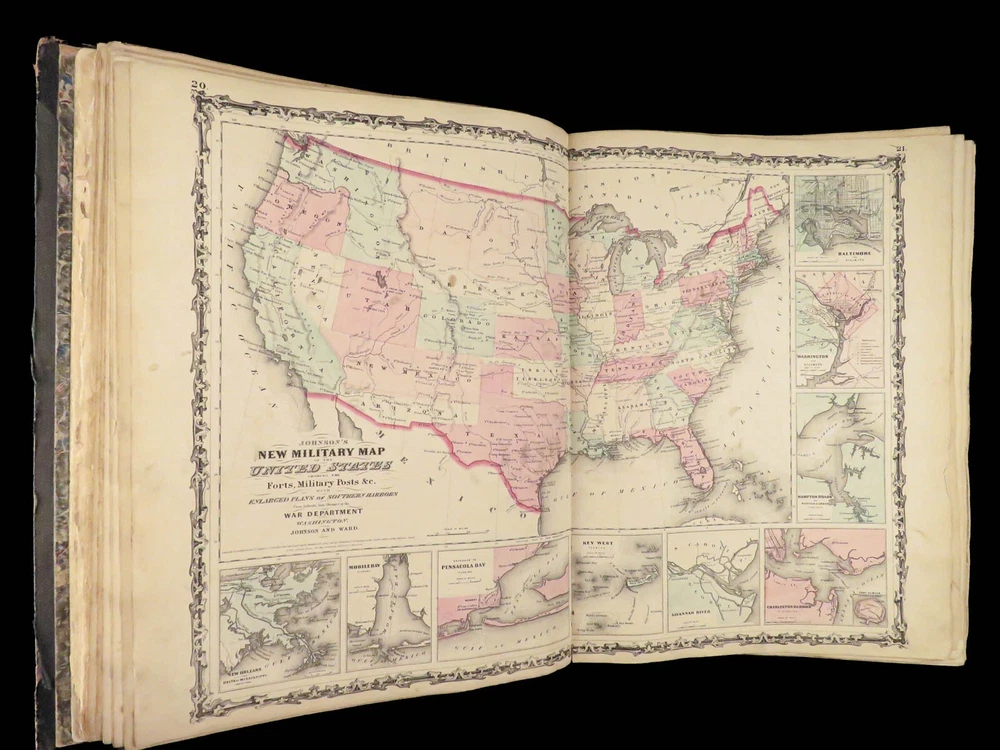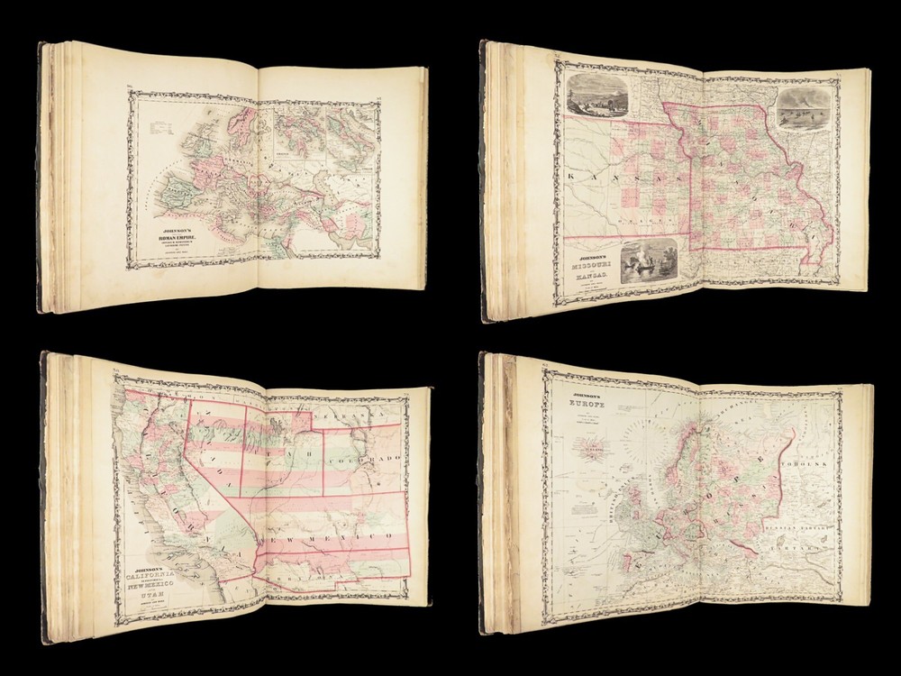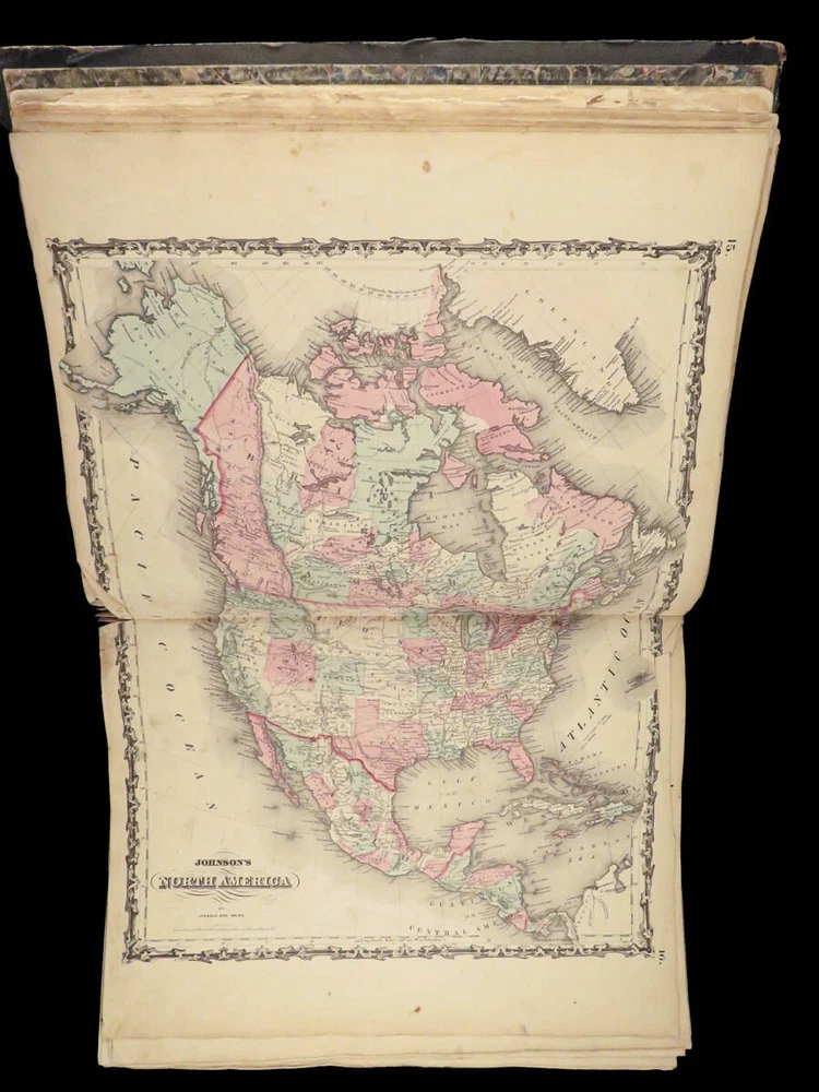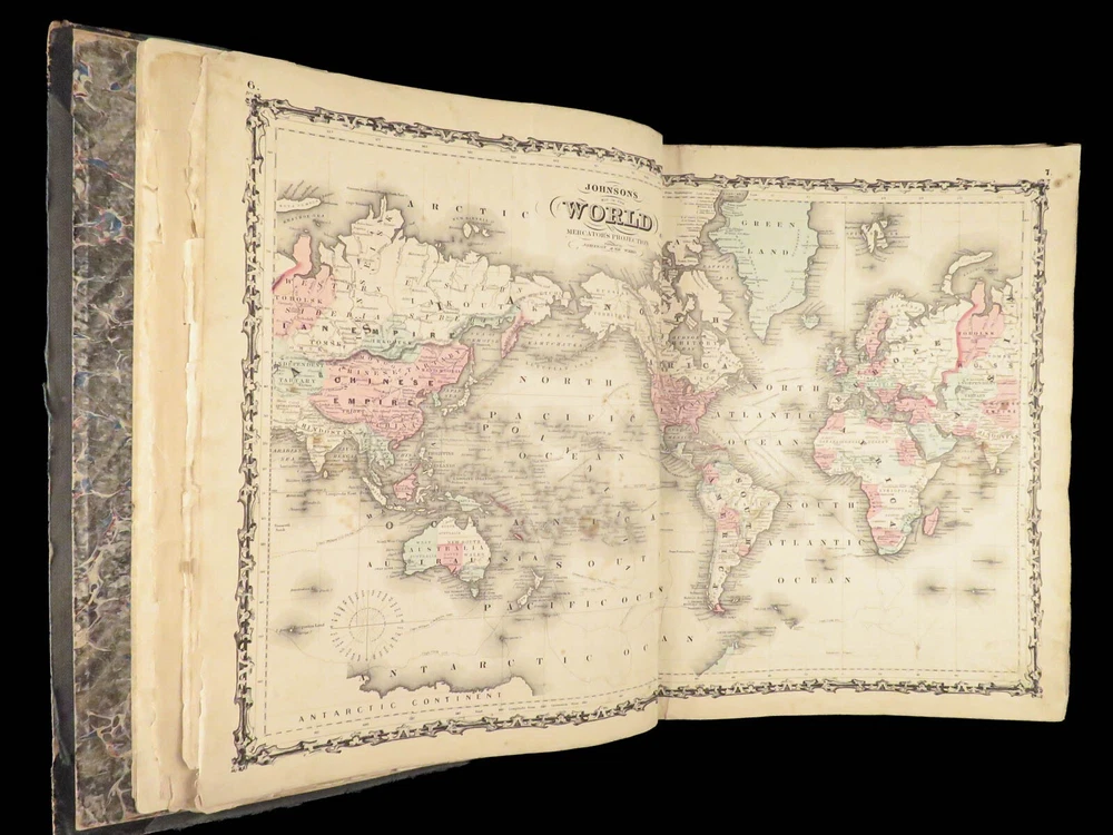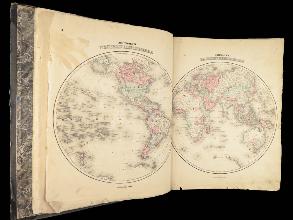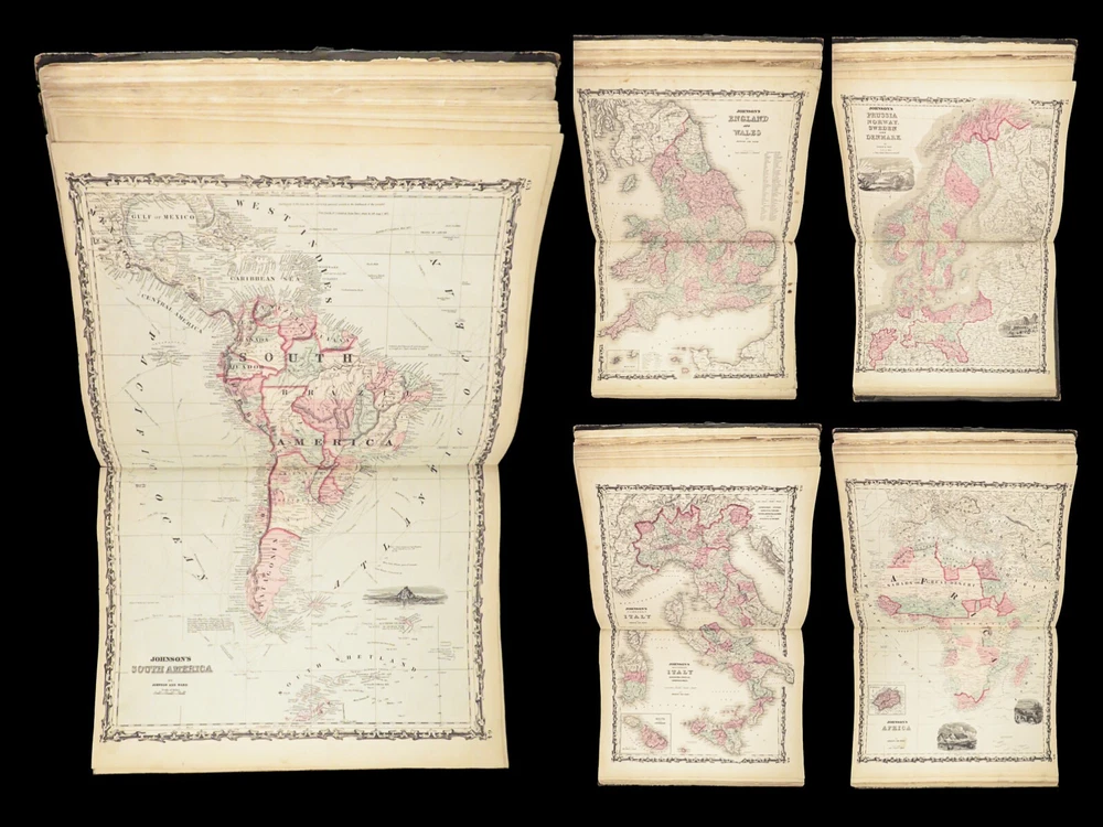 1863 Johnson Family ATLAS Geography Color MAPS Texas California New York HUGE “The most unusual issue of the Johnson Family Atlas!” An incredible Civil War-era family atlas! This atlas consists of nearly 100 colored J.H. Colton maps of states, cities, United States, and countries of the world! Individual maps from this collection are highly sought after and can be found for sale for nearly $500 by themselves! The double-page illustration of the world maps is particularly fine. Alvin Johnson was a famous map publisher in the mid-19 th -century. Historians speculate that J.H. Colton sold the rights to his maps to Johnson, and the result was the masterpiece! According to Geographicus, “ The 1863 issue of the Family Atlas was the most unusual , it being a compilation of older Johnson and Browning maps, updated 1862 Johnson and Ward map issues, and newer 1863 maps with a revised border design.” Item number: #27410 Price: $1950 JOHNSON, Alvin Jewett. Johnson's new illustrated family atlas: with physical geography, and with descriptions, geographical, statistical and historical, including the latest federal census. New York: Johnson and Ward, 1863. Details : · Collation: o [2], 99, [1] § Some pages bound out of order, but present o Illustrated throughout, 97 plates § Wanting maps 13-14 · Language: English · Binding: Leather; tight and secure · Size: ~18.5in X 15in (48.5cm x 38cm) Our Guarantee: Very Fast. Very Safe. Free Shipping Worldwide. Customer satisfaction is our priority! Notify us with 7 days of receiving, and we will offer a full refund without reservation!