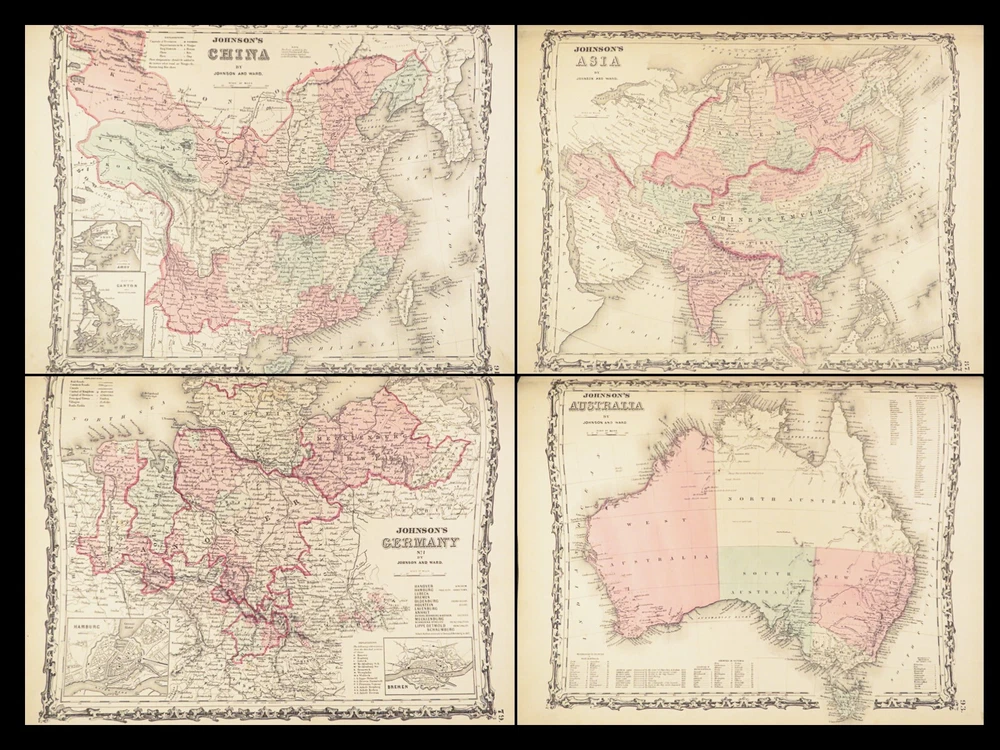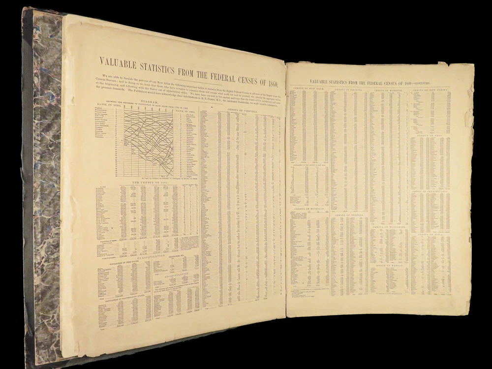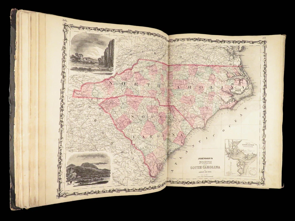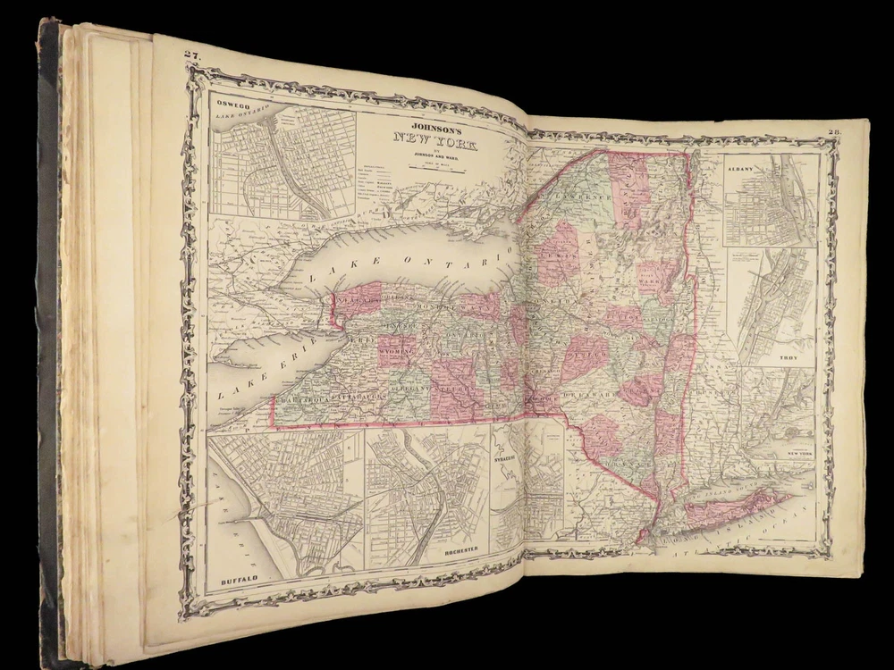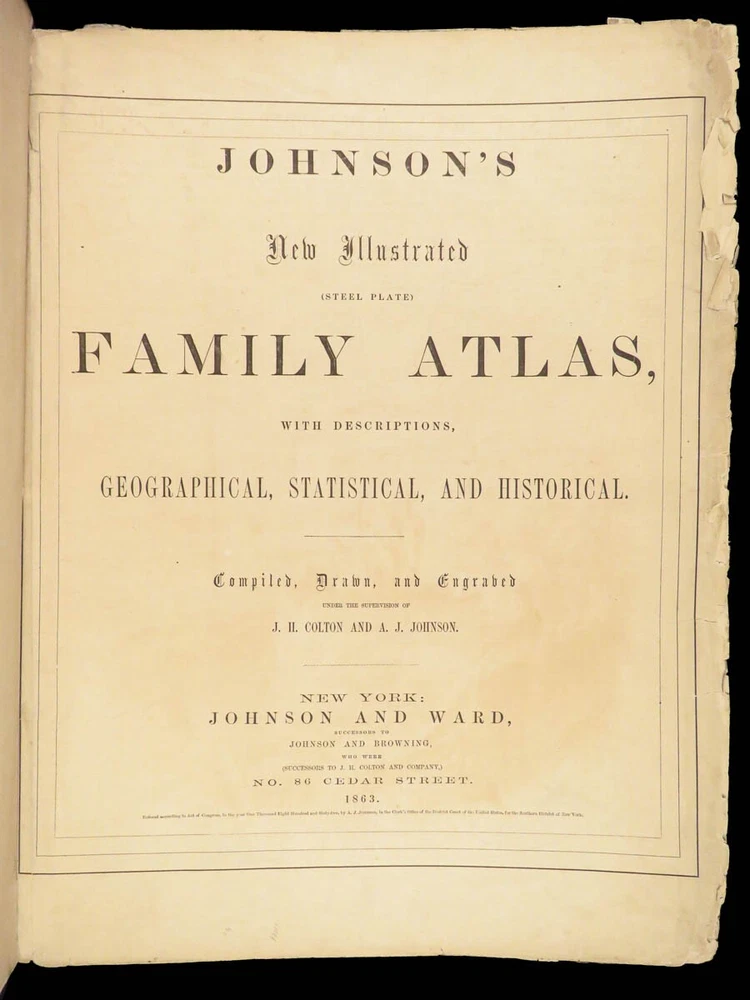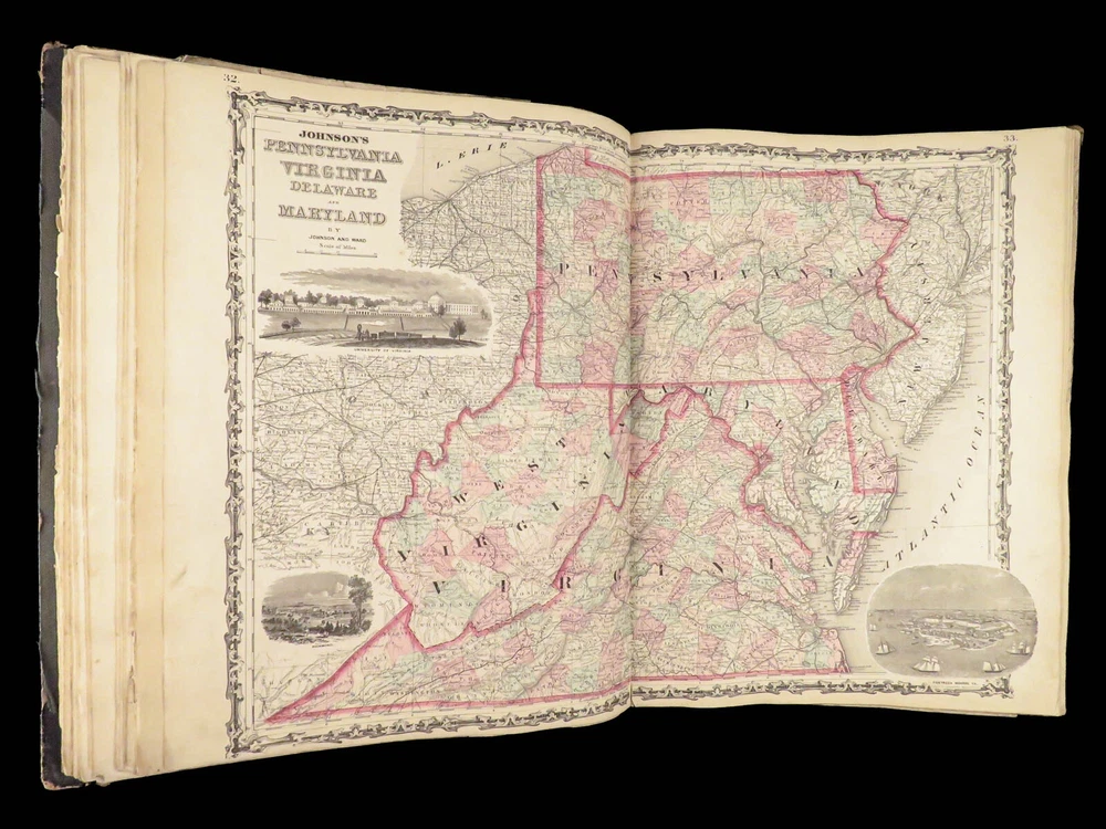 1863 Johnson Family ATLAS Geography Color MAPS Texas California New York HUGE “The most unusual issue of the Johnson Family Atlas!” An incredible Civil War-era family atlas! This atlas consists of nearly 100 colored J.H. Colton maps of states, cities, United States, and countries of the world! Individual maps from this collection are highly sought after and can be found for sale for nearly $500 by themselves! The double-page illustration of the world maps is particularly fine. Alvin Johnson was a famous map publisher in the mid-19 th -century. Historians speculate that J.H. Colton sold the rights to his maps to Johnson, and the result was the masterpiece! According to Geographicus, “ The 1863 issue of the Family Atlas was the most unusual , it being a compilation of older Johnson and Browning maps, updated 1862 Johnson and Ward map issues, and newer 1863 maps with a revised border design.” Item number: #27410 Price: $1950 JOHNSON, Alvin Jewett. Johnson's new illustrated family atlas: with physical geography, and with descriptions, geographical, statistical and historical, including the latest federal census. New York: Johnson and Ward, 1863. Details : · Collation: o [2], 99, [1] § Some pages bound out of order, but present o Illustrated throughout, 97 plates § Wanting maps 13-14 · Language: English · Binding: Leather; tight and secure · Size: ~18.5in X 15in (48.5cm x 38cm) Our Guarantee: Very Fast. Very Safe. Free Shipping Worldwide. Customer satisfaction is our priority! Notify us with 7 days of receiving, and we will offer a full refund without reservation!