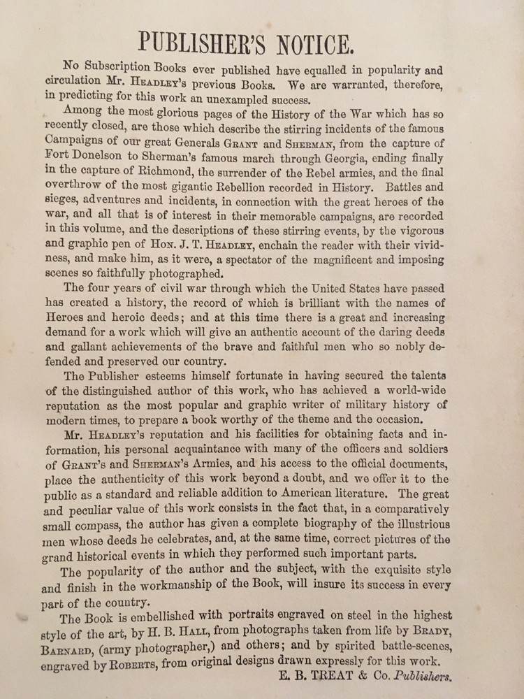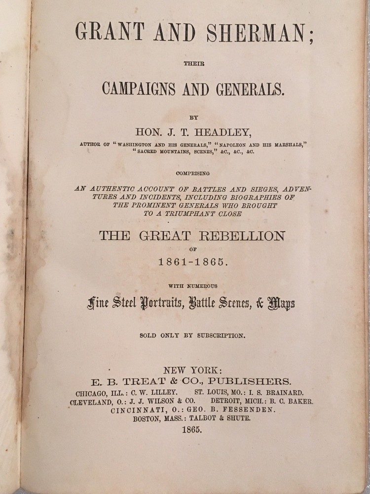 *Welcome to Maine.Picker. We list new items daily, carefully curated from the finest New England estates. Make sure to check our other listings.* 1865 Civil War GRANT & SHERMAN Campaigns & Generals HON HEADLEY Maps and Battles Features: numerous fine steel portraits, battle scenes & maps involving campaigns of Ulysses S. Grant, William T. Sherman and other generals. This is an extremely rare book and was sold only by subscription. It is a must for the civil war collector! Size: approximately 9” by 6 1/4”. About 2 3/8” thick. Condition report: fair to good. Spine separation and cover wear. Ripping and tearing of cover with some missing mostly along spine. Staining and foxing throughout. Some pages darker than others. Please view photos. We have been selling since 1999. Help us maintain eBay as one of the top auction platforms to transact on. Thank you for you business!