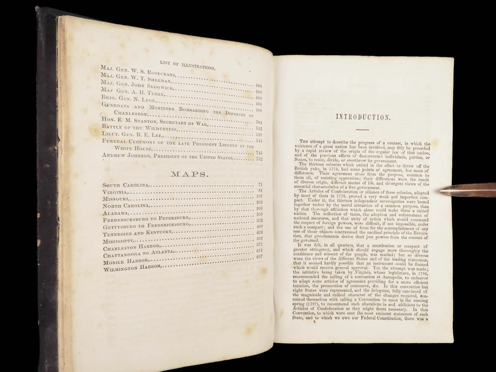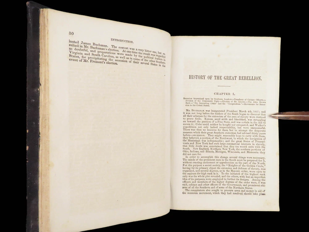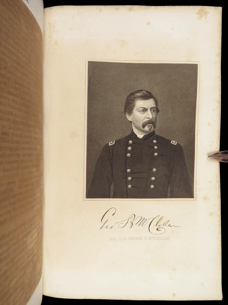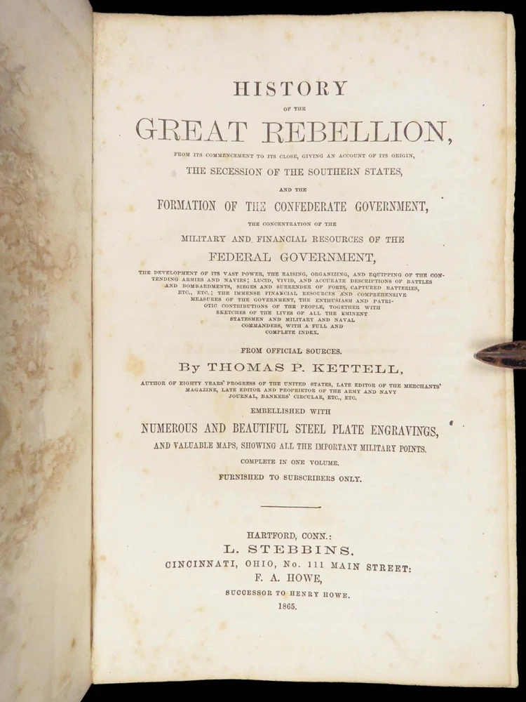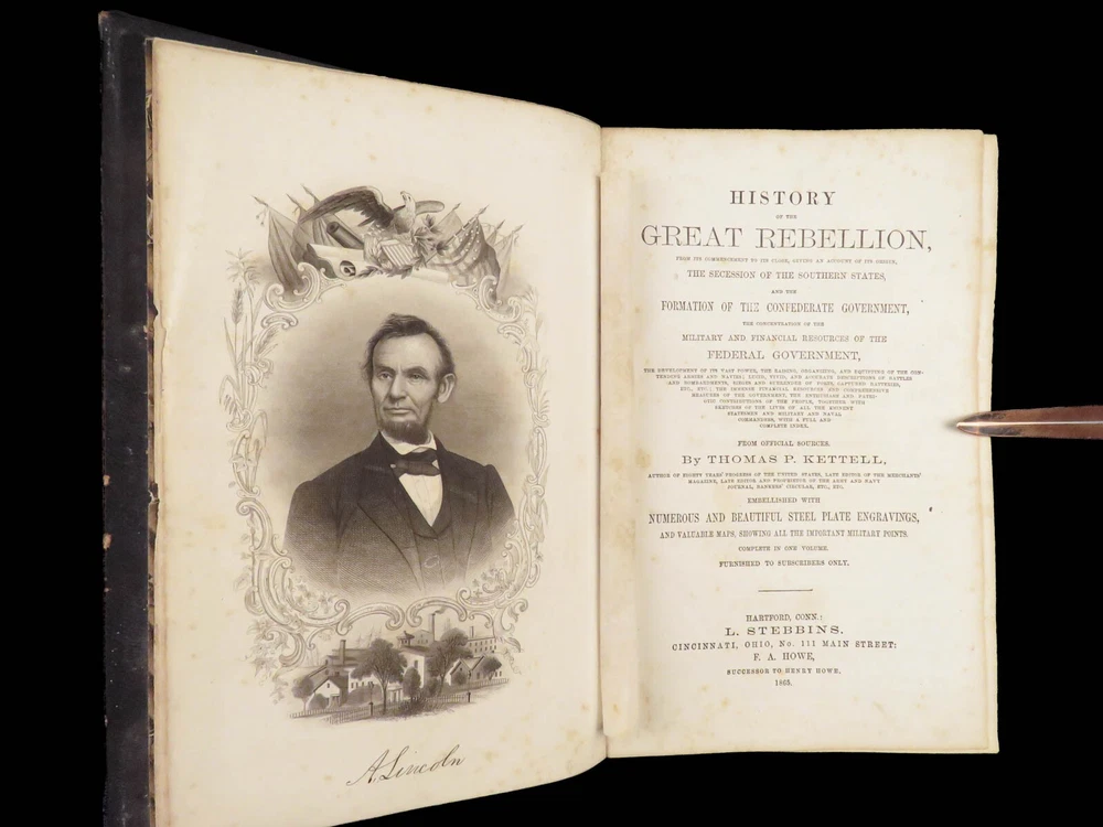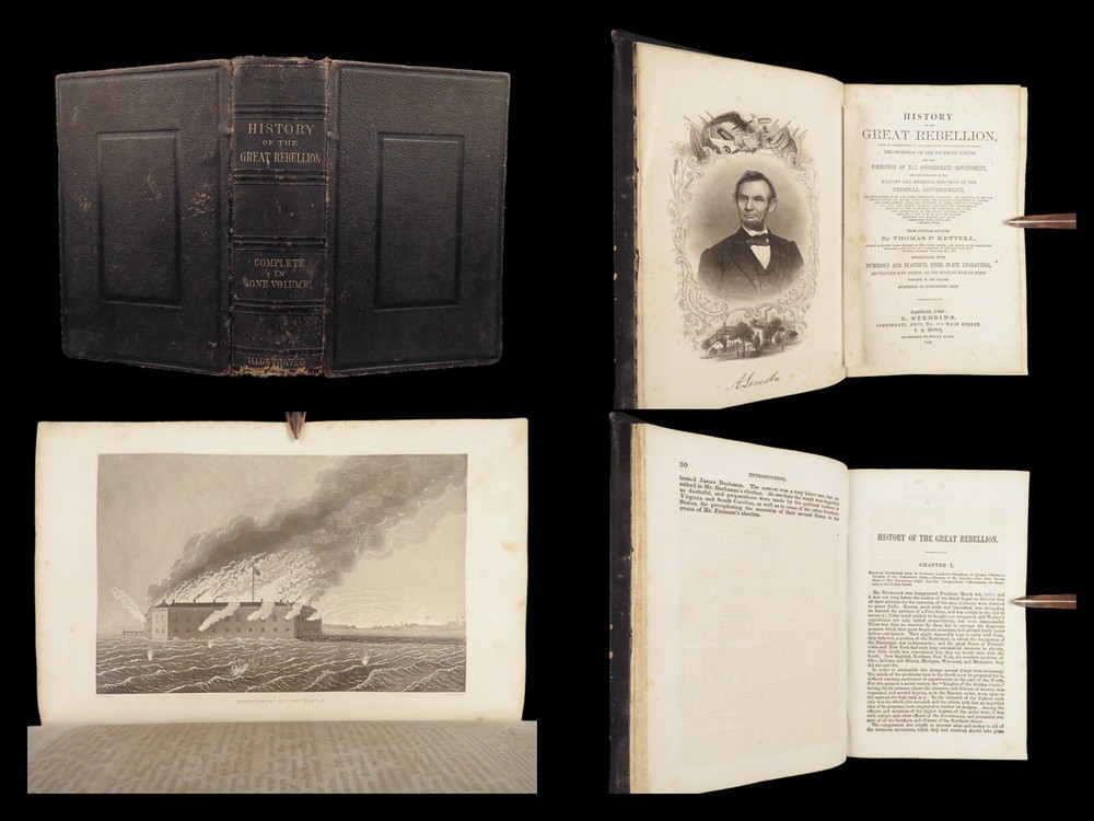 1865 History of Great Rebellion by Thomas Kettell | CIVIL WAR Portraits & Maps Thomas Kettell’s “ History of the Great Rebellion ” is perhaps the most thorough accounts of the Civil War, published the same year the war ended. This work covers everything. Troop movement, generals’ orders, invasions and operations, congressional meetings, and major battles from Charlestown all the way to Missouri and everywhere in between, and so much more. The illustrations of portraits, battle maps, and battle scenes make this first edition and valuable and highly desirable piece of Civil War literature. Item number: #28475 Price: $499 KETTELL, Thomas Prentice History of the Great Rebellion ... giving an account of its origin, the secession of the southern states Hartford, Conn: L. Stebbins, 1865. First edition. Details : · Collation: Complete with all pages o iv, 5-778, [2] · Language: English · Binding: Leather; tight and secure · Size: ~8.5in X 5.5in (22cm x 14cm) Our Guarantee: Very Fast. Very Safe. Free Shipping Worldwide. Customer satisfaction is our priority! Notify us with 7 days of receiving, and we will offer a full refund without reservation!
