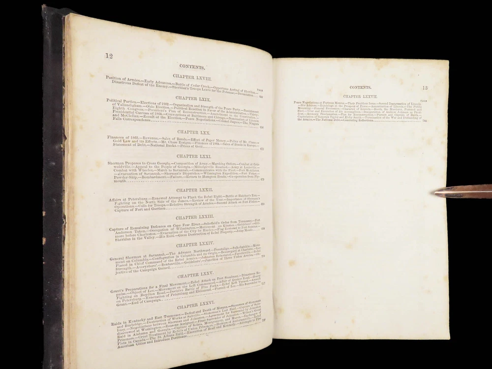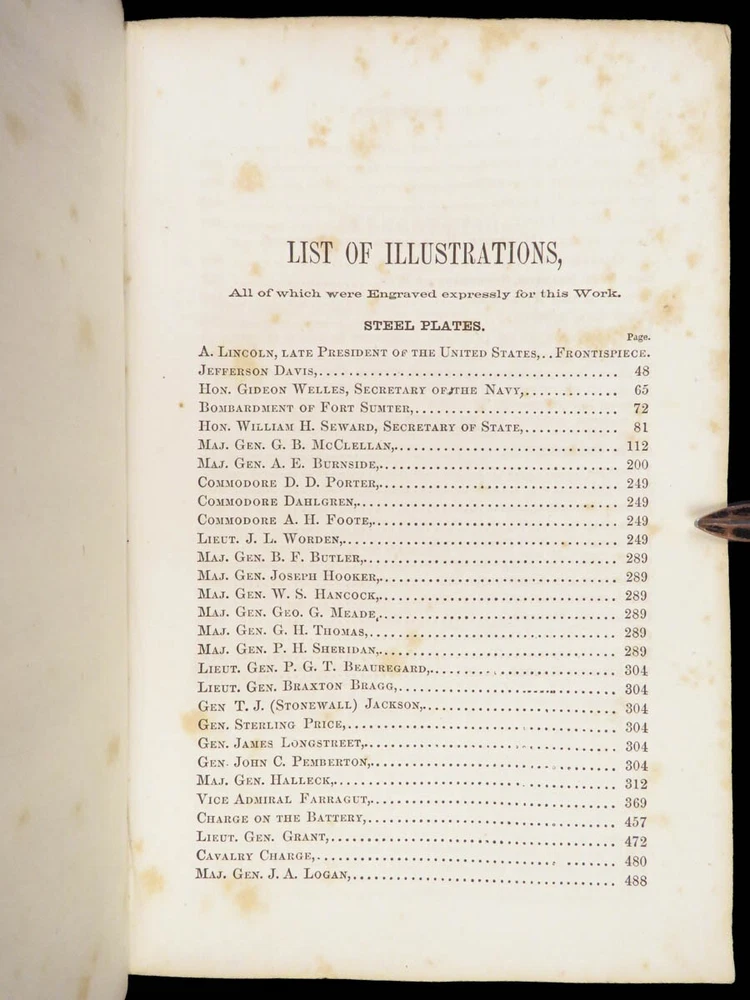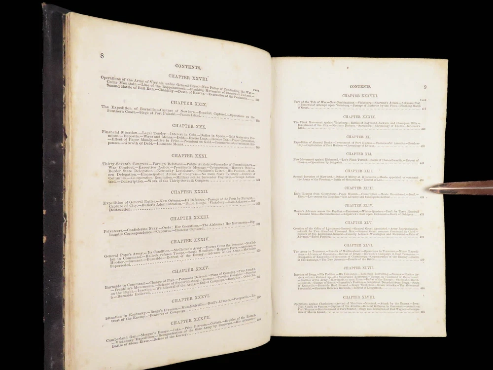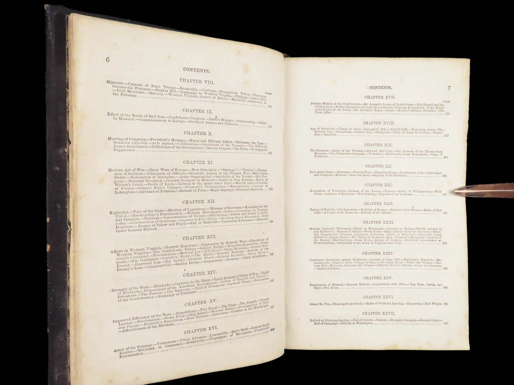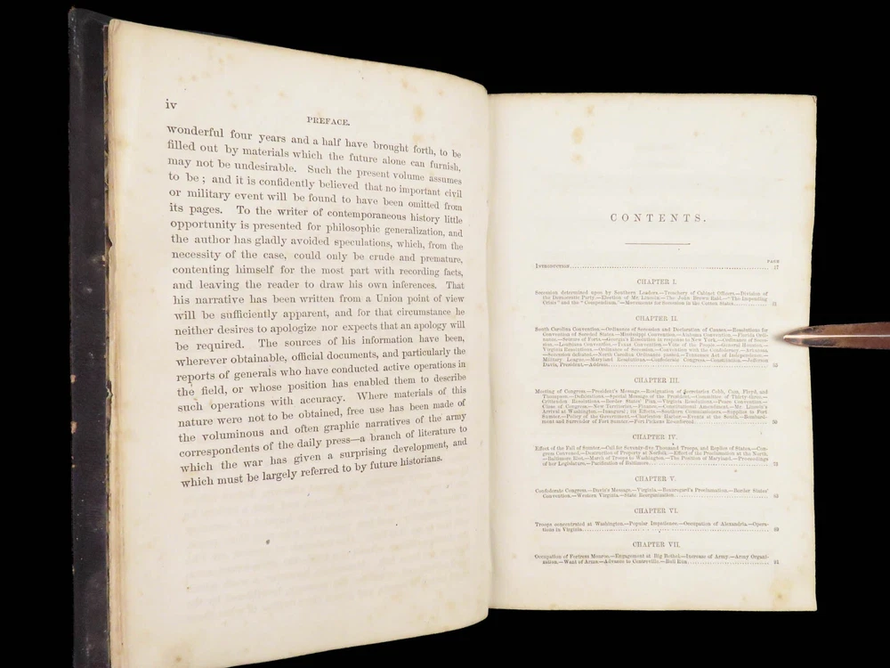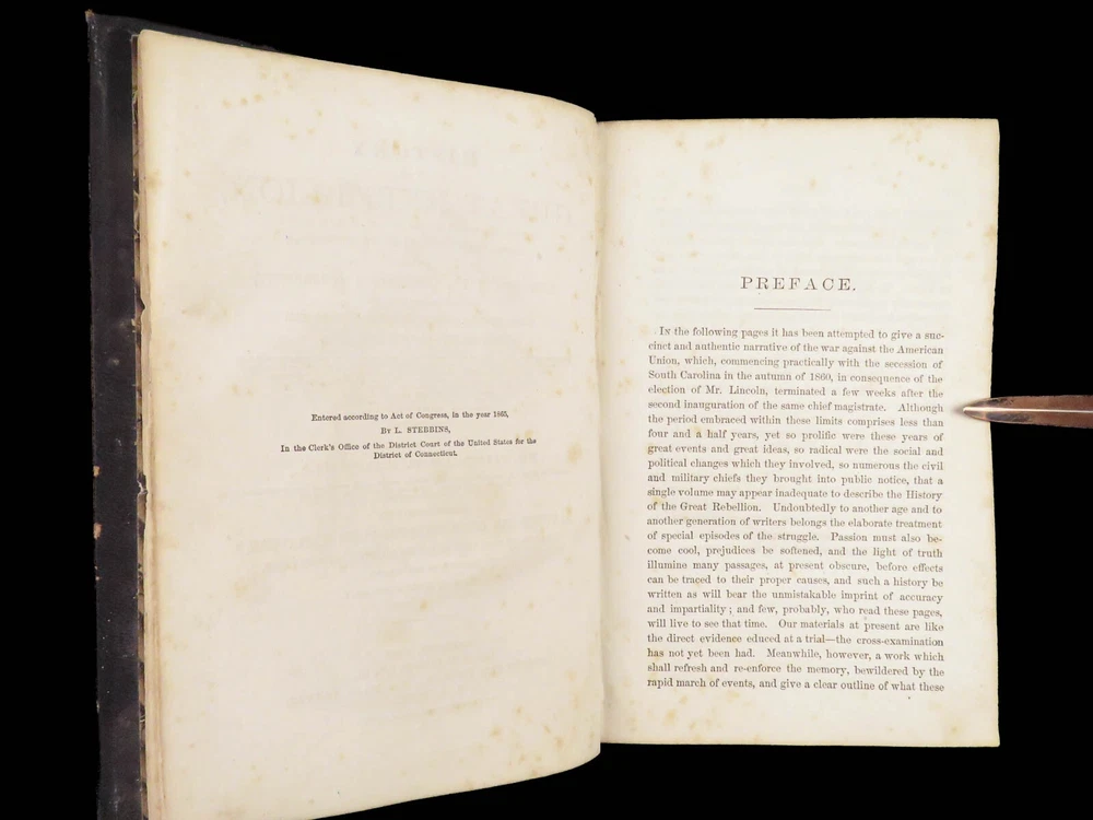 1865 History of Great Rebellion by Thomas Kettell | CIVIL WAR Portraits & Maps Thomas Kettell’s “ History of the Great Rebellion ” is perhaps the most thorough accounts of the Civil War, published the same year the war ended. This work covers everything. Troop movement, generals’ orders, invasions and operations, congressional meetings, and major battles from Charlestown all the way to Missouri and everywhere in between, and so much more. The illustrations of portraits, battle maps, and battle scenes make this first edition and valuable and highly desirable piece of Civil War literature. Item number: #28475 Price: $499 KETTELL, Thomas Prentice History of the Great Rebellion ... giving an account of its origin, the secession of the southern states Hartford, Conn: L. Stebbins, 1865. First edition. Details : · Collation: Complete with all pages o iv, 5-778, [2] · Language: English · Binding: Leather; tight and secure · Size: ~8.5in X 5.5in (22cm x 14cm) Our Guarantee: Very Fast. Very Safe. Free Shipping Worldwide. Customer satisfaction is our priority! Notify us with 7 days of receiving, and we will offer a full refund without reservation!
