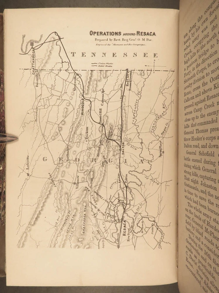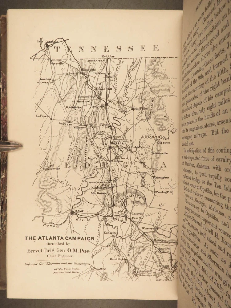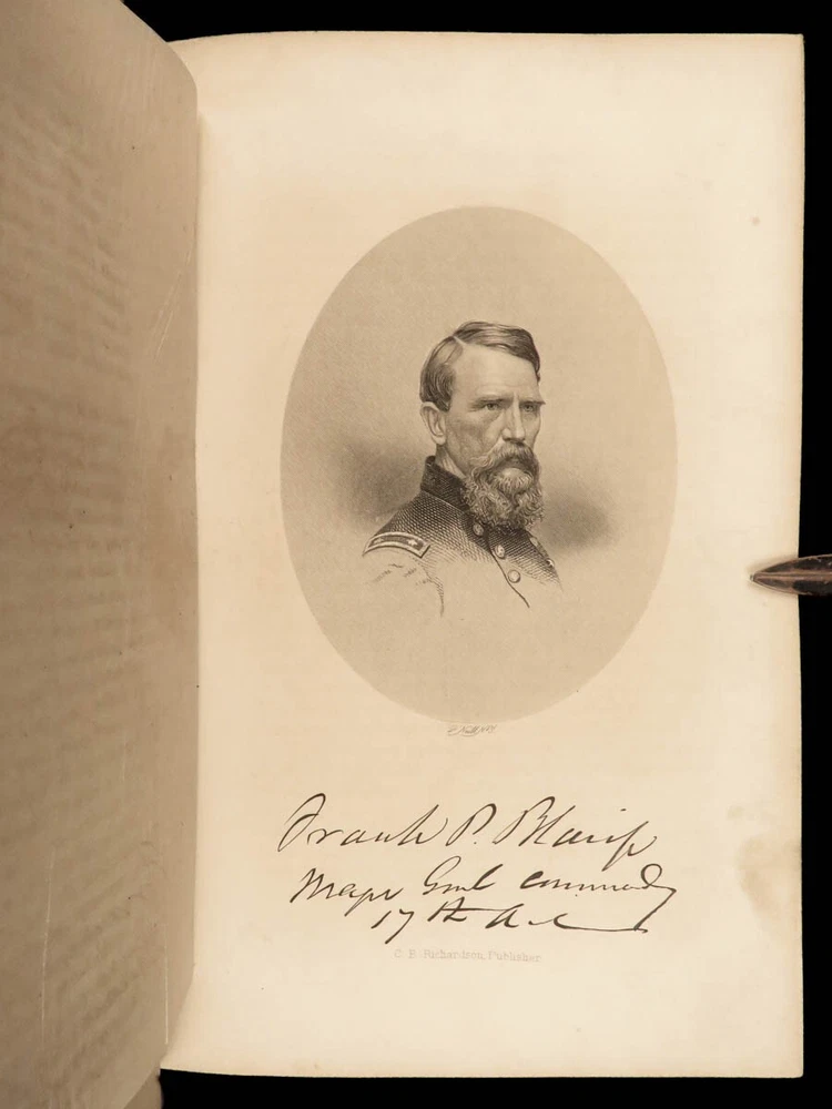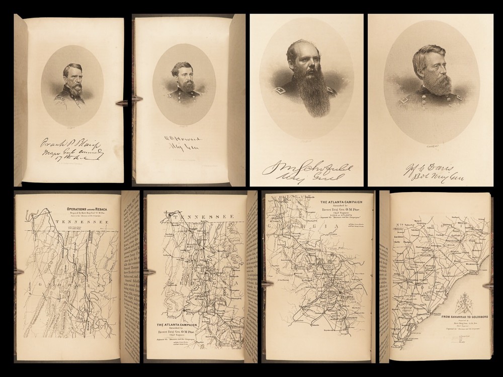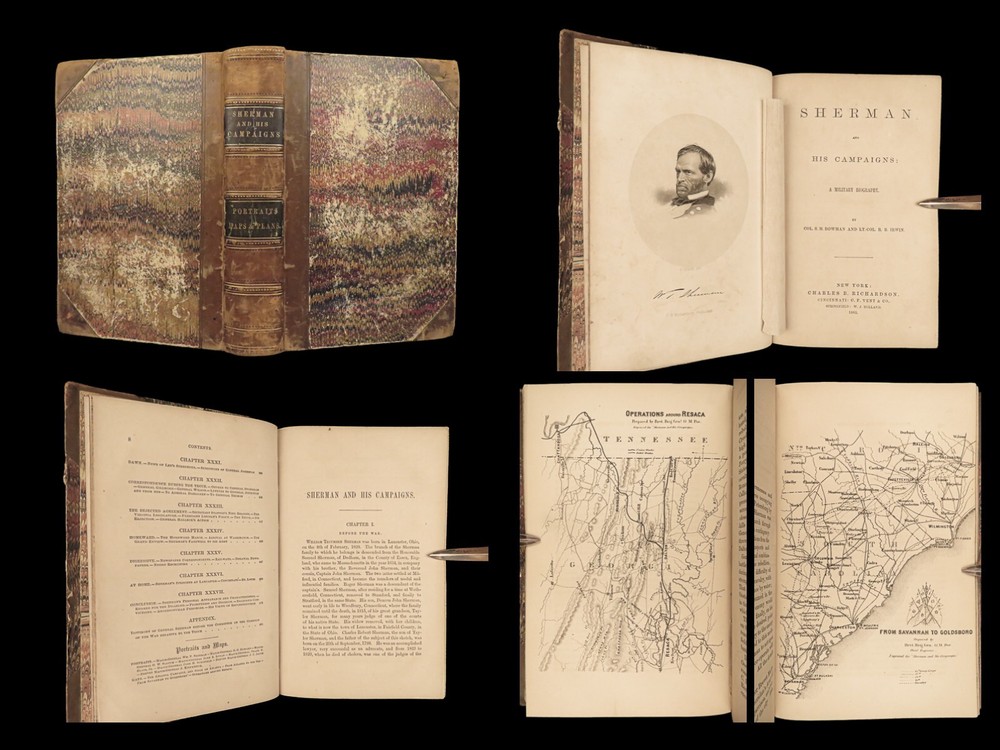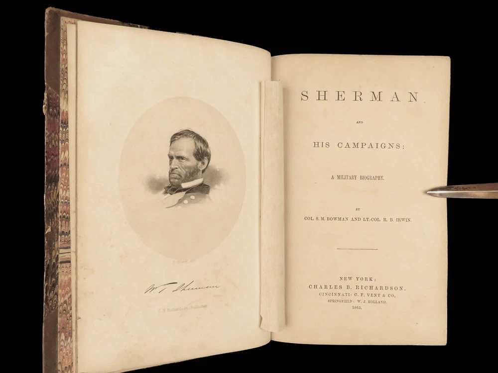 1865 PROVENANCE General Sherman 1 st ed Campaigns Civil War Union Military Maps “ Sherman and His Campaigns: A Military Biography ” by Col. Samuel Millard Bowman and Lt.-Col. Richard Biddle Irwin is a meticulously detailed account of the military endeavors of Gen. William Tecumseh Sherman during the U.S. Civil War. Presenting a well-rounded view of Sherman’s life, the authors delve into his strategic genius, innovative command style, and decisive campaigns that earned him recognition as the “first modern general” by esteemed historian B.H. Liddell Hart. The authors go beyond narrating Sherman’s military successes; they intricately explore his character, shedding light on his leadership style and the respect he commanded from his soldiers. The book also offers a defense of Sherman against critics of his truce agreement with J.E. Johnston in 1865, highlighting the authors’ commitment to preserving historical accuracy. A significant contribution to Civil War literature, this first edition offers a thorough and enlightening exploration of one of the war’s pivotal figures. Item number: #30539 Price: $599 BOWMAN, Col. S.M.; IRWIN, Lt.-Col. R.B. Sherman and His Campaigns: A Military Biography New York: Charles B. Richardson; Cincinnati: C.F. Vent and Co.; Springfield: W.J. Holland, 1865. First Edition. Details : · Collation: Complete o [2], 512 o 8 portraits o 5 maps · Provenance: Handwritten o Capt. B. F. Thompson, 1884 § Capt. Bradford F. Thompson of the 112 th Illinois Volunteer Infantry. In 1885, Thompson completed and published a detailed account of the regiment’s service, which his fellow soldiers lauded as being both impressively accurate and comprehensive. A large part of the 112 th ’s service was given to the Atlanta Campaign led by General Sherman, the success of which paved the way for Sherman's March to the Sea and hastening the end of the war. Many of the maps in this volume of Sherman and His Campaigns are dedicated to battles fought during this campaign. o James A. Henderson, 1884 · Language: English · Binding: Leather; secure · Size : ~9in X 6in (23cm x 15cm) Our Guarantee: Very Fast. Very Safe. Free Shipping Worldwide. Customer satisfaction is our priority! Notify us with 7 days of receiving, and we will offer a full refund without reservation! 30539