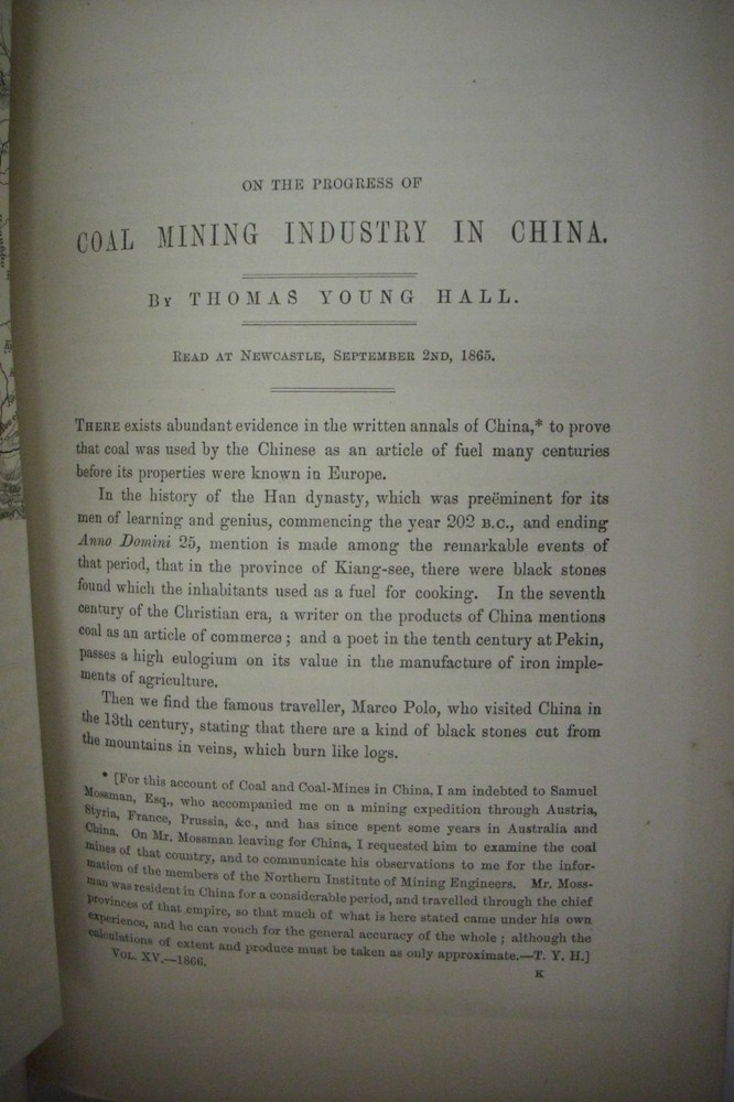 You are bidding on a super rare antique hardcover book titled North of England Institute of Mining Engineers - Transactions Volume XV for 1865 - 1866. This book is loaded with articles from the years of 1865 - 66 and is also profusely illustrated with many fold-out illustrations, some of which are hand-colored! Among the articles in this book is one titled "On The Progress of Coal Mining Industry in China" by Thomas Young Hall. With this article there is a wonderful fold-out map of China showing the Coal Districts. This beautiful book is quarter-bound in leather. The spine features titling in gold on red morocco and on black leather. There are four raised bands with gold ornamentation on them. Covers securely attached with no cracking or splitting of hinges. All pages are clean and tightly bound. No writing in book at all and no signs of previous ownership. Book shows some general wear but remains in very good condition! This is a very rare book on a desirable topic! This is a terrific book to add to a collection. Great gift idea. (Inventory: 195) Track Page Views With Auctiva's FREE Counter