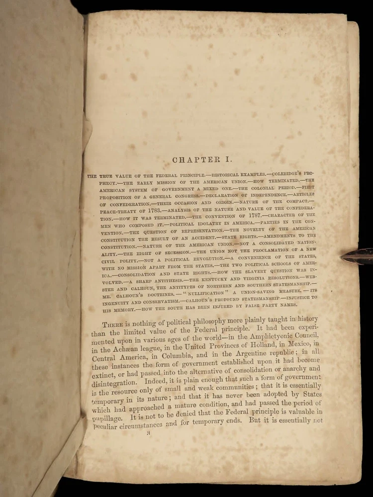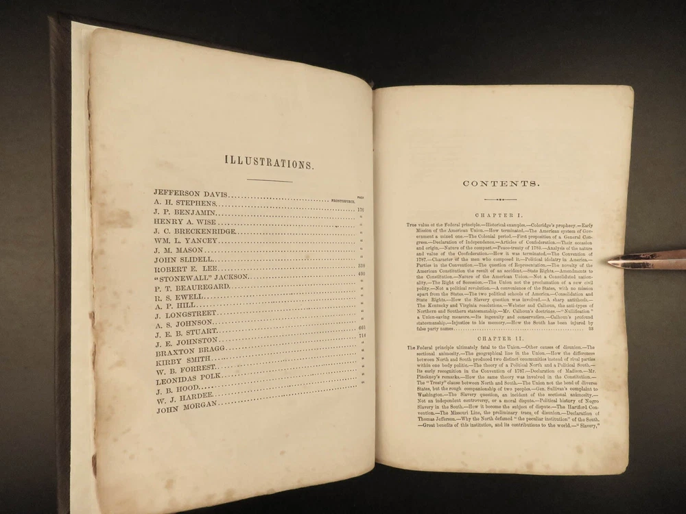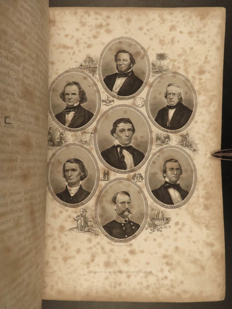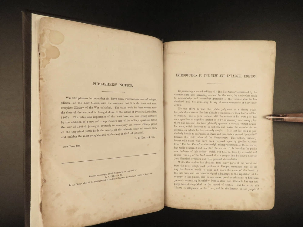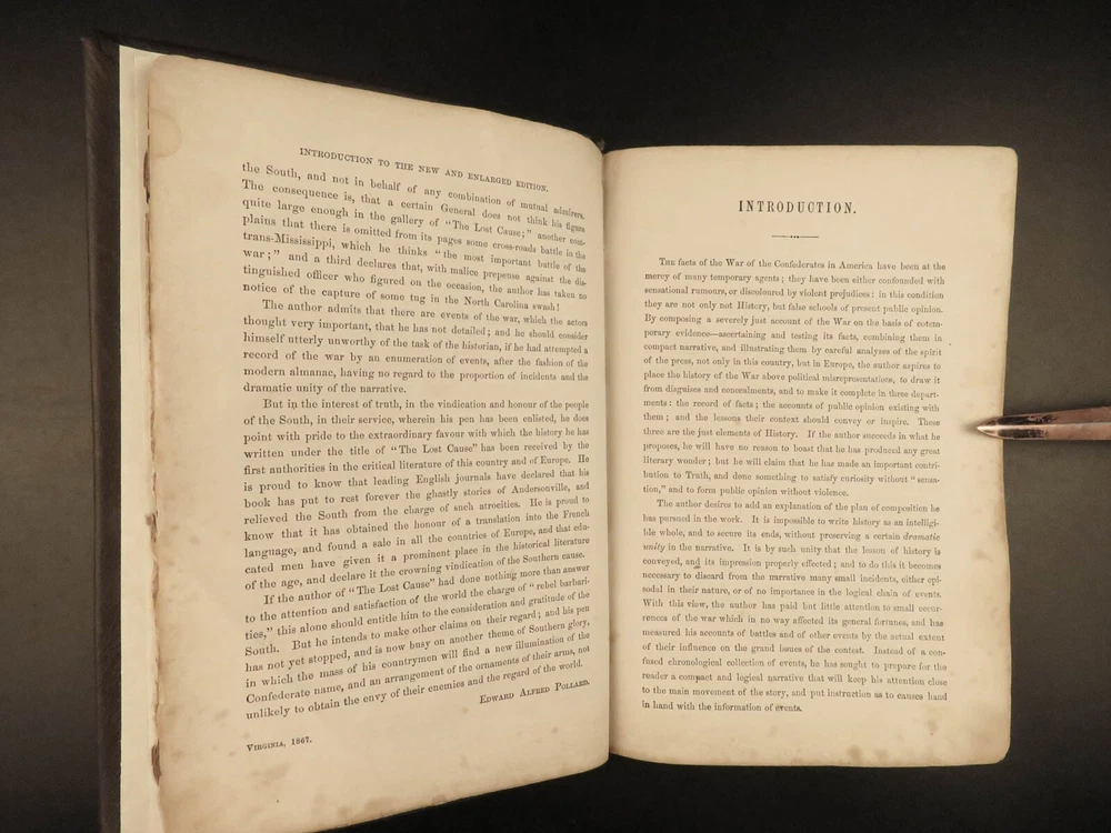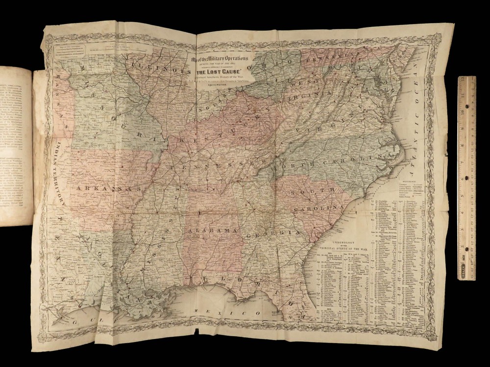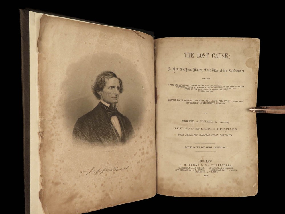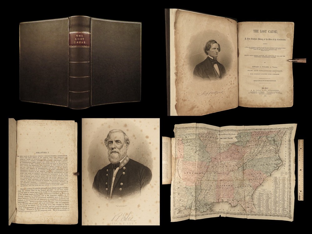 1868 The Lost Cause Pollard MAP Confederate Civil War White Supremacy SLAVERY Edward Pollard was a notable American writer on the Civil War whose works, predominantly, covered the history of the American South. He wrote about slavery, the rise of Ku Klux Klan, the life of President Jefferson Davis, as well as an impressive account of the rise and fall of the Confederacy. The latter, titled ‘ The Lost Cause’ , was Pollard’s most famous work, though not necessarily because of its popularity. ‘ The Lost Cause ’ gained its fame for Pollard’s advocating for white supremacy and the relegation of blacks to a second-class status. Pollard supported the notion that slavery was the key to a Confederate way of life and nobility. According to Gallagher & Nolan, this book was likely “the first book that set forth the Confederate case against the generalship of Ulysses S. Grant .” This 1868 subscription-only edition is illustrated with portrait engravings of notable CSA leaders including Jefferson Davis, Robert E Lee, and Stonewall Jackson, as well as a folding color map. Item number: #21587 Price: $599 POLLARD, Edward Alfred The lost cause: a new Southern history of the War of the Confederates: a full the lost cause: a new southern history of the war of the Confederates. Comprising a full and authentic account of the rise and progress of the late southern confederacy--the campaigns, battles, incidents, and adventures of the most gigantic struggle of the world's history. Drawn from official sources, and approved by the most distinguished Confederate leaders. authentic account of the rise and progress of the late Southern Confederacy ... New York: E.B. Treat; Baltimore, Md.: L.T. Palmer, 1868. Details : · Collation: Complete with all pages o [2], xxx, 33-762 (i.e. 750), [2] o Illustrated with portraits of important leaders and folding map · References: Howes P 455; Sabin 63873; Nevins II:175; Gallagher and Nolan, Myth of the Lost Cause, p.148 · Provenance: Handwritten – Thomas L. Breese, 1868 · Language: English · Binding: Leather; tight and secure · Size : ~9.5in X 6.75in (24cm x 17cm) Our Guarantee: Very Fast. Very Safe. Free Shipping Worldwide. Customer satisfaction is our priority! Notify us with 7 days of receiving, and we will offer a full refund without reservation! 21587