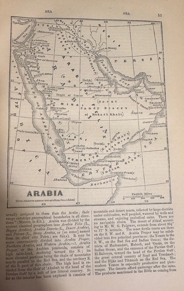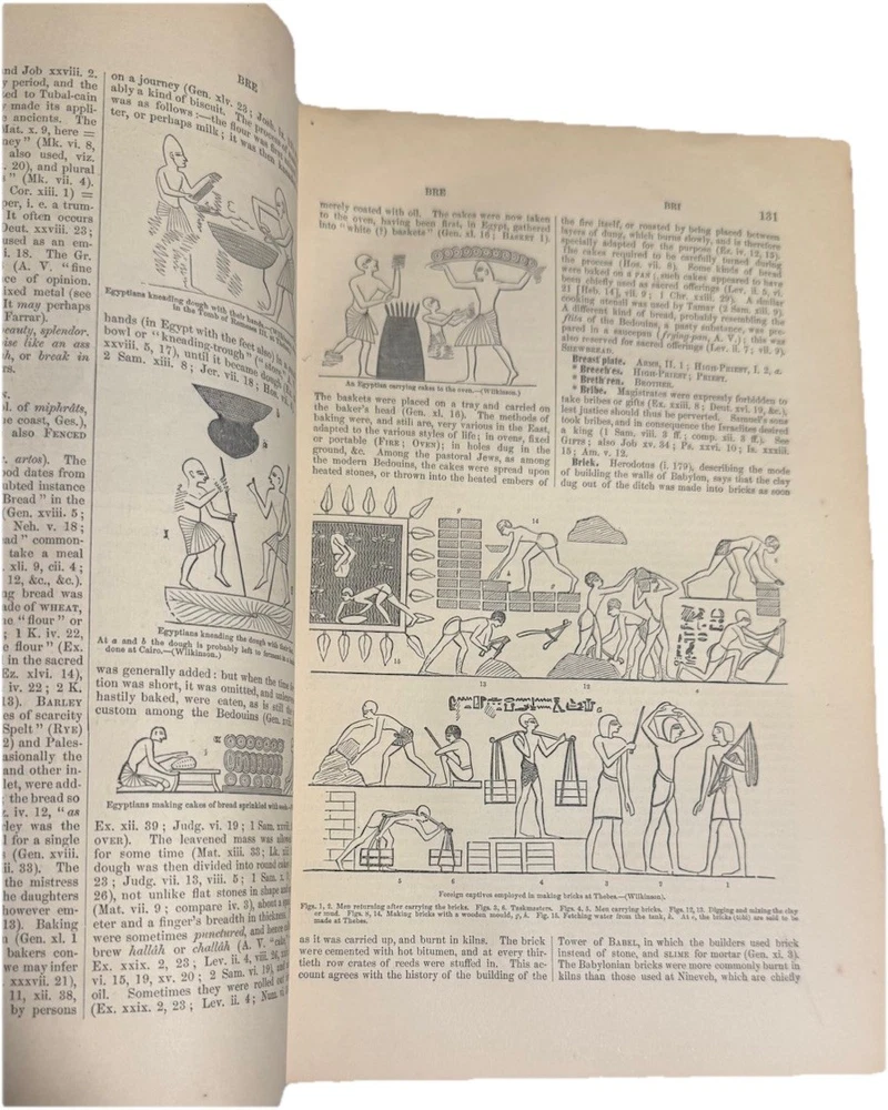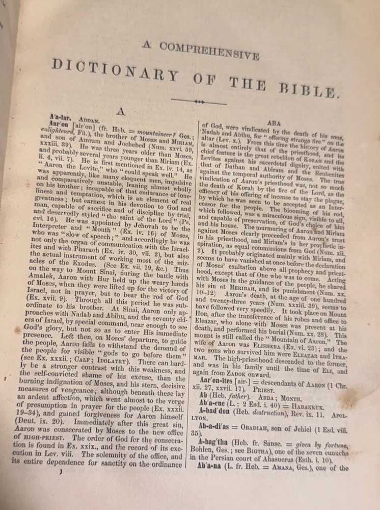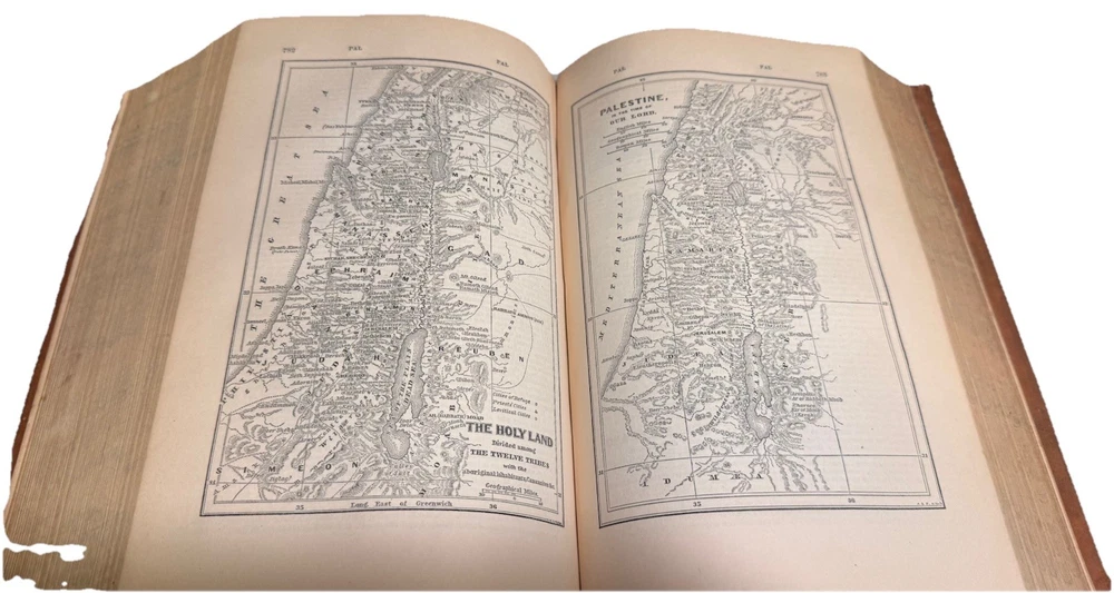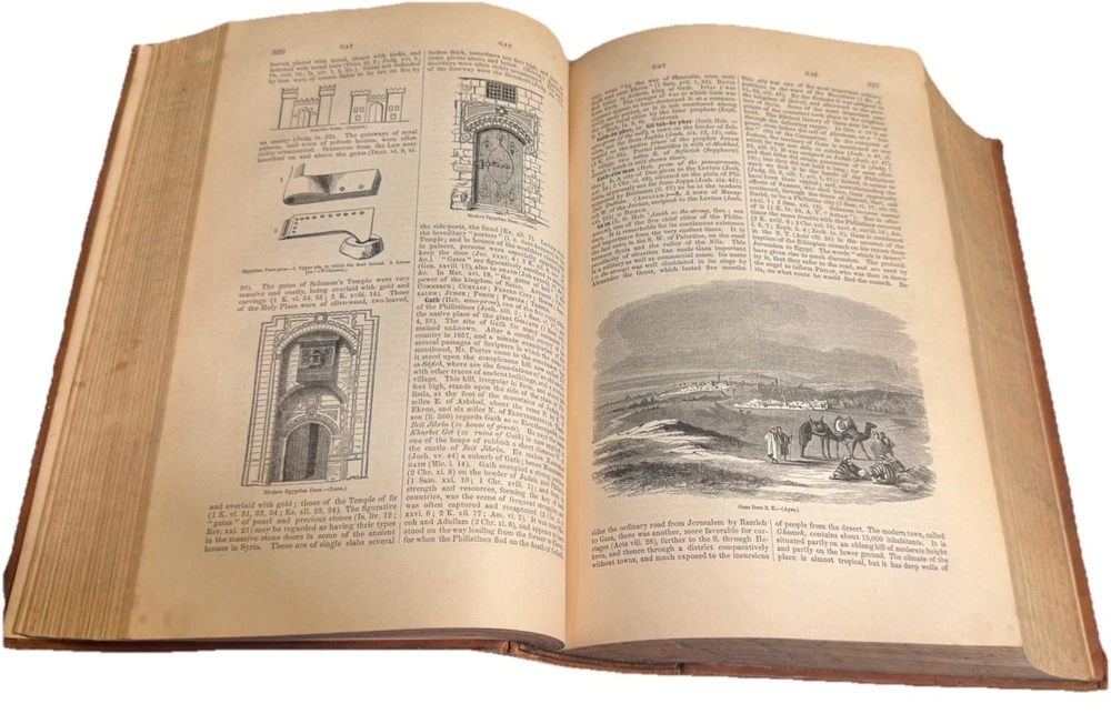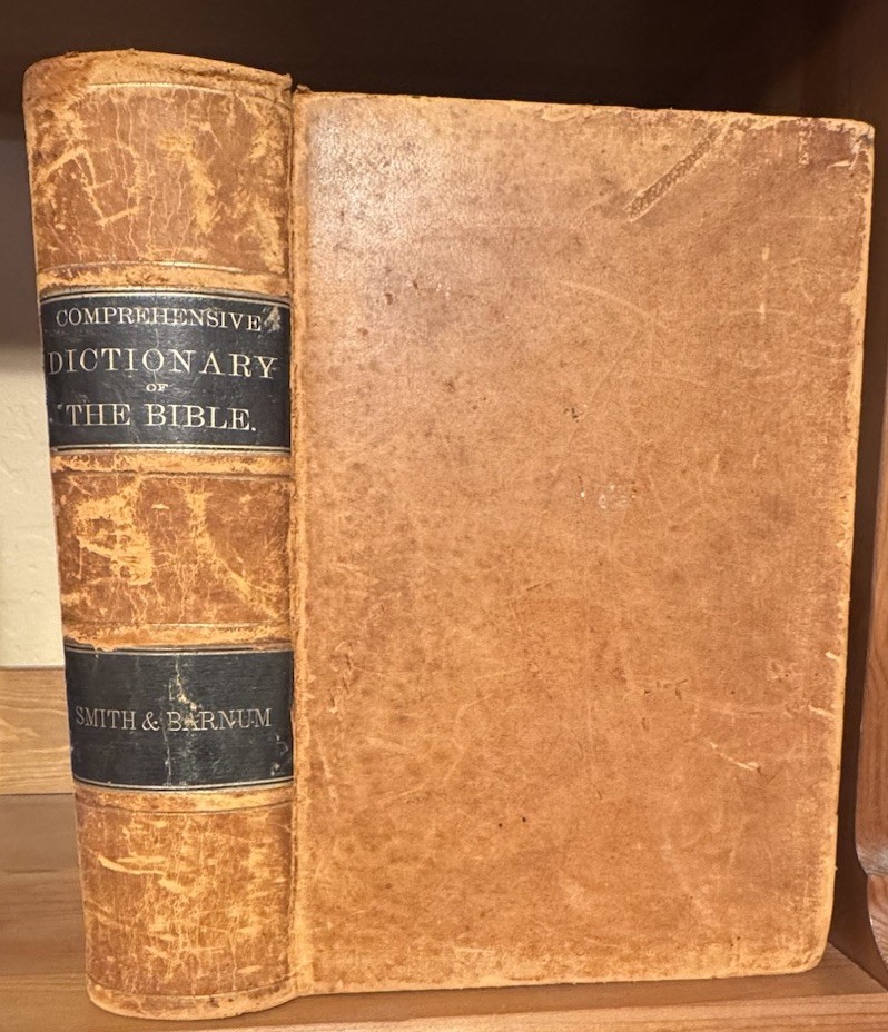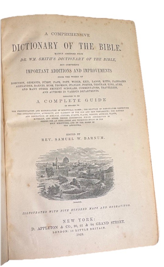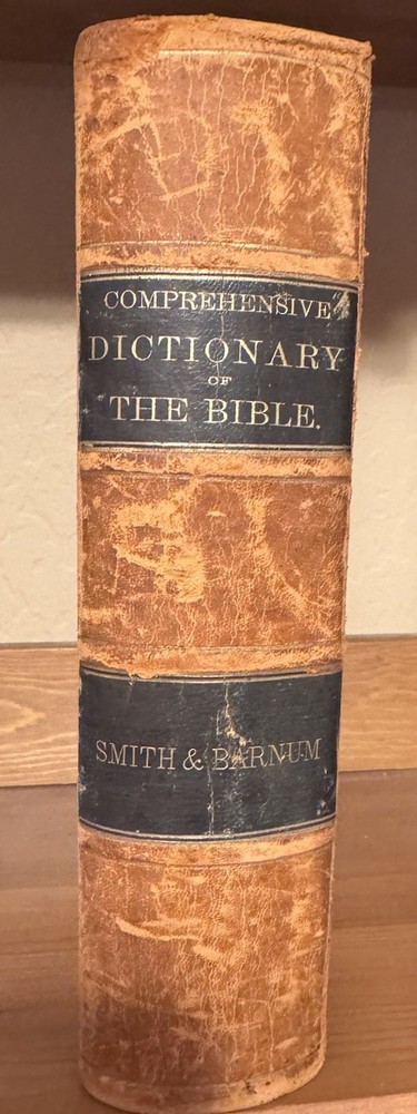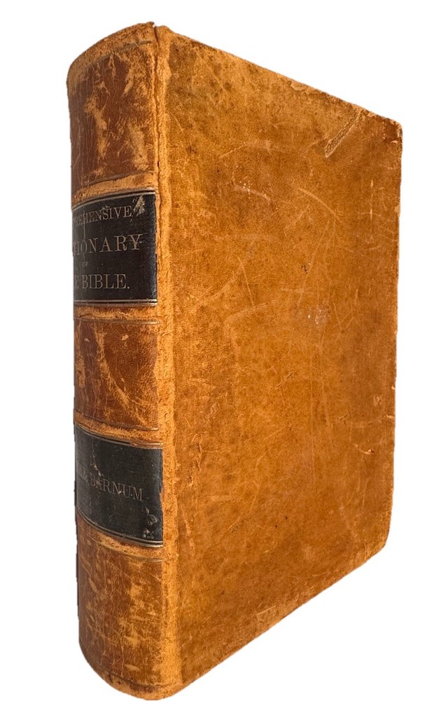 A Comprehensive Dictionary of the Bible by Rev. Samuel W. Barnum In beautiful VG+ antiquarian condition Published in 1869 by D. Appleton and Co. in New York. Second edition. In original full fine leather binding with two black gilt lettered spine labels and gilt bordered slightly raised spine bands. Ruled in gilt. All edges marbled. Marbled endpapers. Heavy, thick quarto, 10 1/8” x 7”, 1219 pages. Engraved title page. 500 beautiful illustrations: maps, engravings, several plates. Rev. Samuel Weed Barnum (June 4, 1820 – November 18, 1891) was an American minister and author. Barnum was born in North Salem, Westchester County, New York. He graduated from Yale College in 1841. He studied in the Yale Divinity School from 1841 to 1844, but during his theological course, and afterwards, he suffered much from ill-health. From March, 1845, to August, 1847, he was the principal assistant of Professor Goodrich in the revision of Webster's Dictionary. May, 1865, he removed to New Haven, and during his residence here, besides preaching as health and opportunity permitted, he prepared for the press a Comprehensive Dictionary of the Bible (1868), mainly abridged from Dr. William Smith; Romanism as it is (1871); and a Vocabulary of English Rhymes (1876). Condition Report: VG+ Spine, hinges and joints are firm. Boards, spine bands and extremities are moderately rubbed. Pages are clean, bright and gently toned. Foxing is very light throughout, though moderate toward the beginning and back of the book. Endpapers are in excellent condition minus a chip. Large darkened section of leather on rear board (has the shape of a clothes iron!) A few signs of handling - a smudge or possible bent page corner or small tear. Overall, fantastically illustrated and In quite beautiful collectible condition for a 156-year-old thick quarto in original binding. As a fellow book collector, I know how frustrating it can be when items aren’t accurately described or poorly packaged for shipping. That is why I (1) take a lot of pictures and try to describe condition issues as accurately as possible and (2) pack your book purchases with the utmost care before shipping. I have been selling and buying on eBay for over 12 years and have a 100% satisfaction rating, and offer a 100% satisfaction guarantee 30-day return policy. Happy to combine shipping on multiple orders to save you money. Be sure to check out my store and to give me a follow. I have thousands of rare, signed, and collectible books to list in the coming weeks and months!
