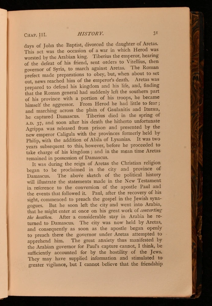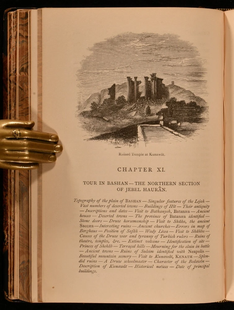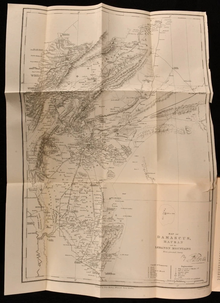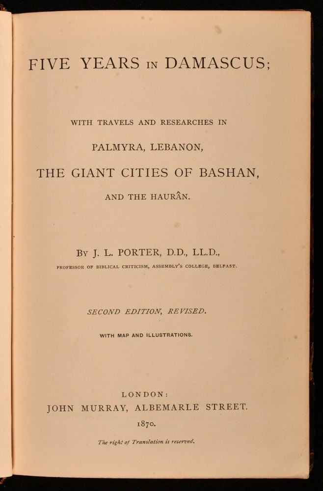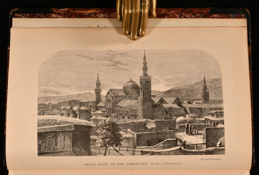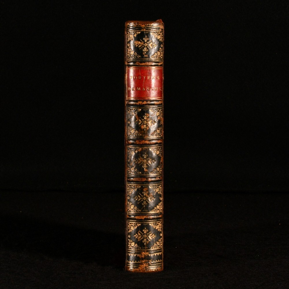 Click here to see our other books! Five years in Damascus; With travels and researches in Palmyra, Lebanon, the giant cities of Bashan, and the Haurân. Second Edition, Revised. With map and illustrations. J. L. Porter 1870 John Murray : London 7.5" by 5.5" xvi, 339pp. SUMMARY A scarce second edition of Porter's Damascus in a half calf binding, with fascinating folding map and illustrations. Folding Maps,Illustrated,Leather Binding,Scarce Overall Condition: Very Good This book weighs 0.75 KG when packed UK Postage: £ 3.99 US Postage: £ 19.99 EU Postage : £ 15.99 European Postage: £ 16.99 Asia Postage: £ 21.99 Worldwide Postage: £ 25.99 DESCRIPTION A scarce second and revised edition of Porter's exploration and history of Syria, Lebanon and the Hauran region. In a half calf binding with marbled boards and ornate gilt decoration to the spine. An ink inscription to the back of the front free end paper records that H. Wilfrid Wait received this volume as a Grammar Prize at Ascham School in Bournemouth, dated 1877. 19 illustrations. 1 map and 1 folding map. Collated complete. The intricate folding map depicts Damascus, Hauran and the Lebanon mountains from a personal survey by the author, and the illustrations are woodcut engravings of the author's drawings. Josias Leslie Porter (1823–89) was an Irish Presbyterian minister, missionary, traveller and author. He was posted to Syria as a missionary, arriving there in December 1849, and remained there for a decade during which time he travelled extensively there and in Lebanon, Palestine and Jordan. CONDITION In a half calf binding. Externally smart with some rubbing to the spine and extremities, and bumping to the boards. Marbling is still bright to the front and rear boards and to the fore edge. Internally, binding is slightly strained. Pages bright and clean, with just some spotting to the first and last pages. A small closed tear to the folding map. Overall Condition: Very Good GLOSSARY OF TERMS Overall Condition (Dustwrapper condition rating is shown after that for the book itself, where a dustwrapper is present) Fine - Very well preserved copy showing very little wear Very Good Indeed - Only one or two minor faults, really a very attractive copy Very Good - Quite a wide term meaning no major faults but probably several smaller ones often expected given the age of the book, but still a respectable copy Good - Meaning not very good. Some more serious faults as will be described in the condition report under 'condition' Good Only - Meaning one or more faults that could really do with repair Fair - As with good only above but with other faults leaving a compromised copy even after repair Poor - Really bad and possibly seriously incomplete. We only sell books in this condition where their rarity or value makes them attractive none the less. Major defects will be described. GUARANTEE We offer a full money back guarantee on our descriptions. Please ask for details and conditions. We prefer PAYPAL. If you pay via PAYPAL we will post the item off the same or the next working day with the postage you have selected. Please note we cannot accept USD cheques