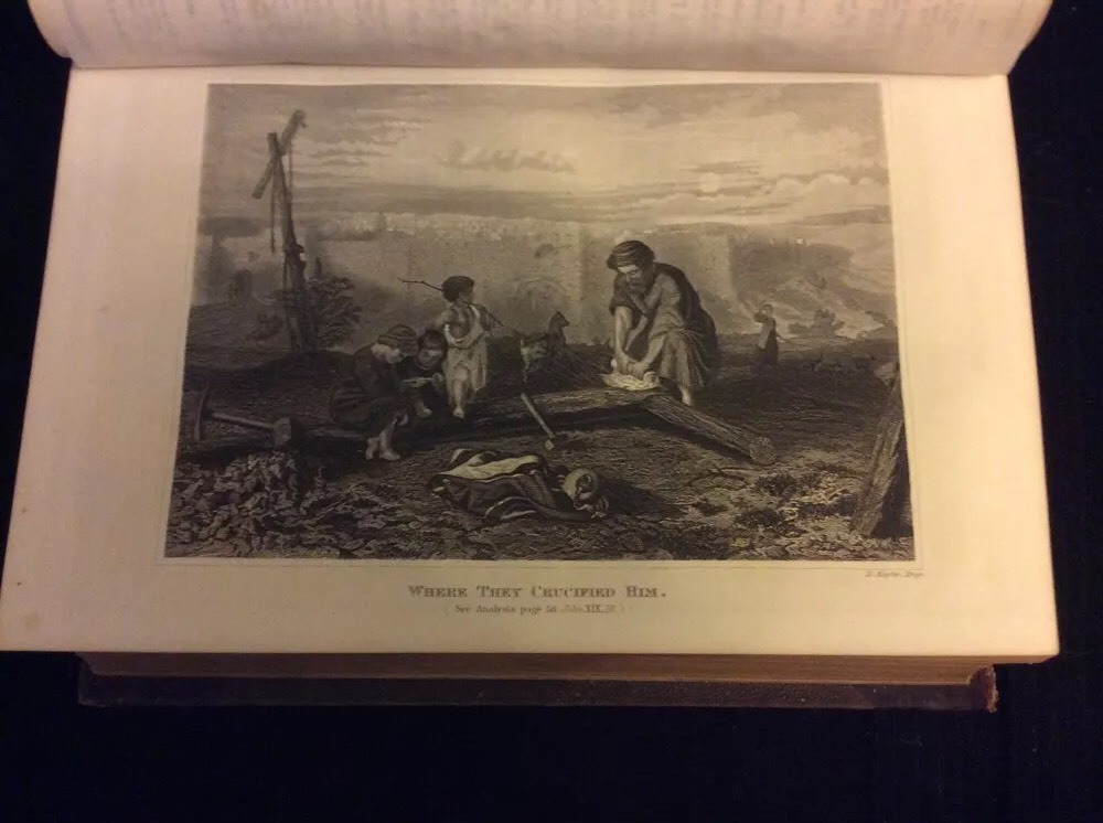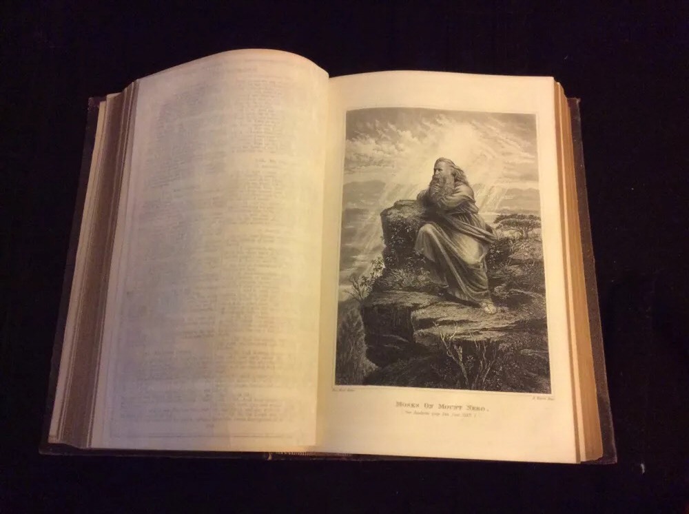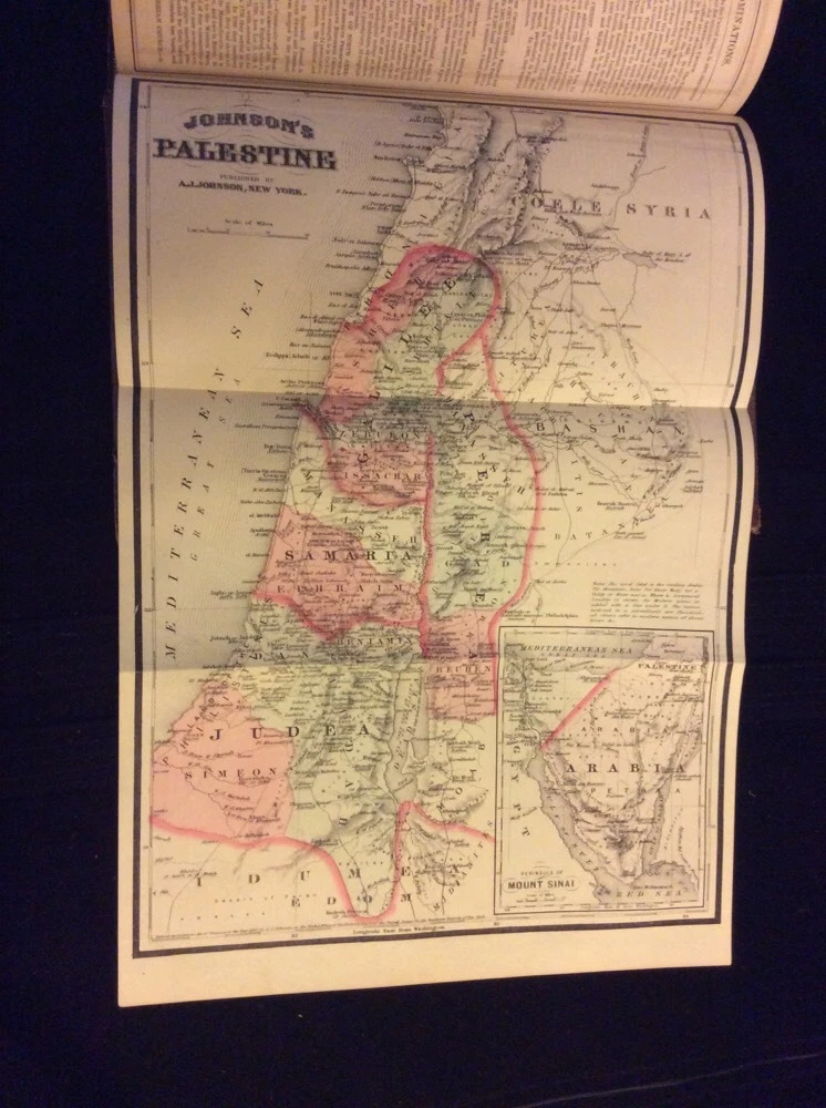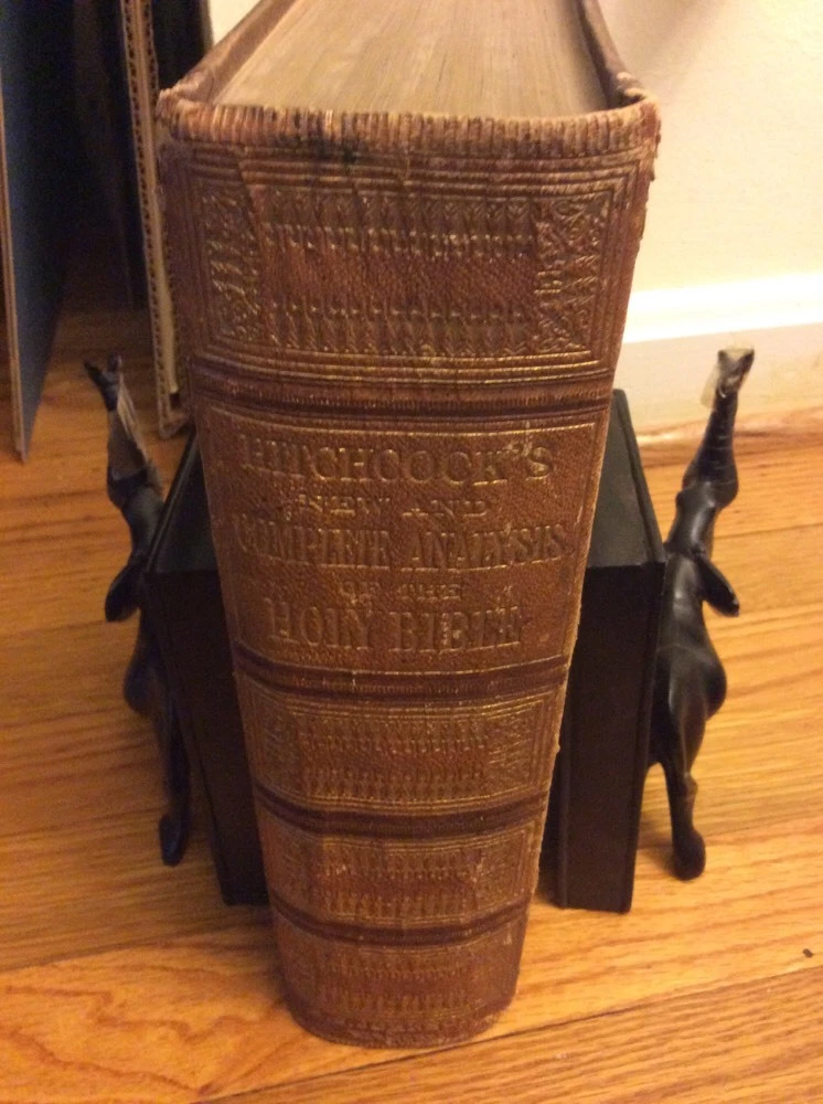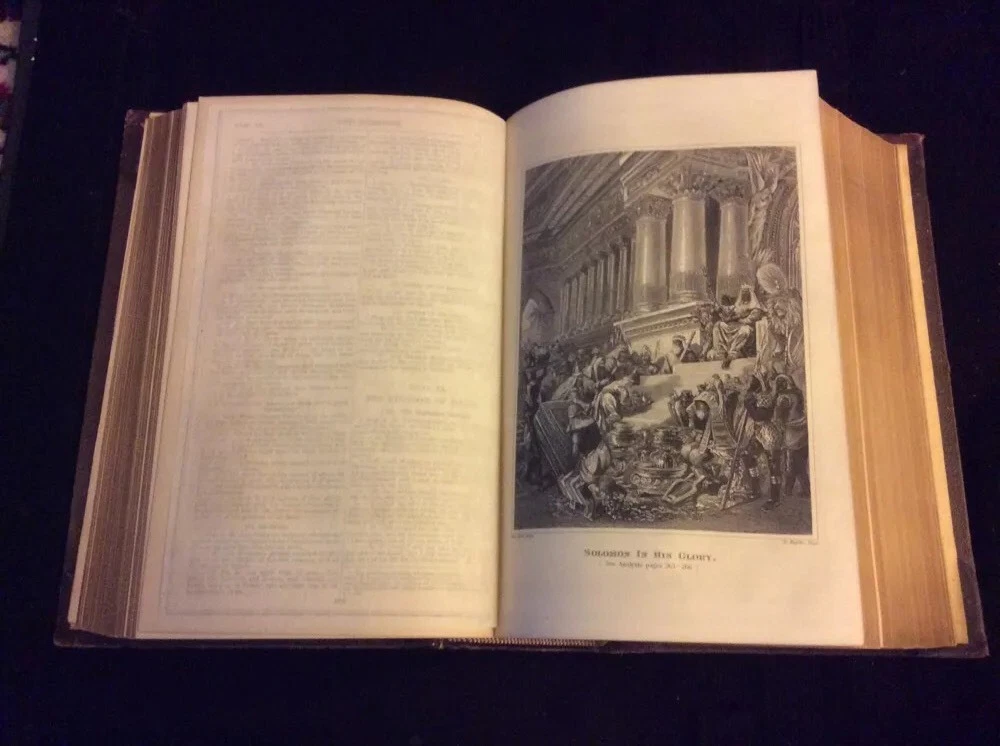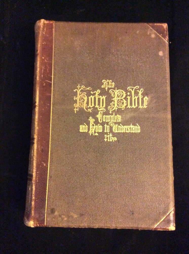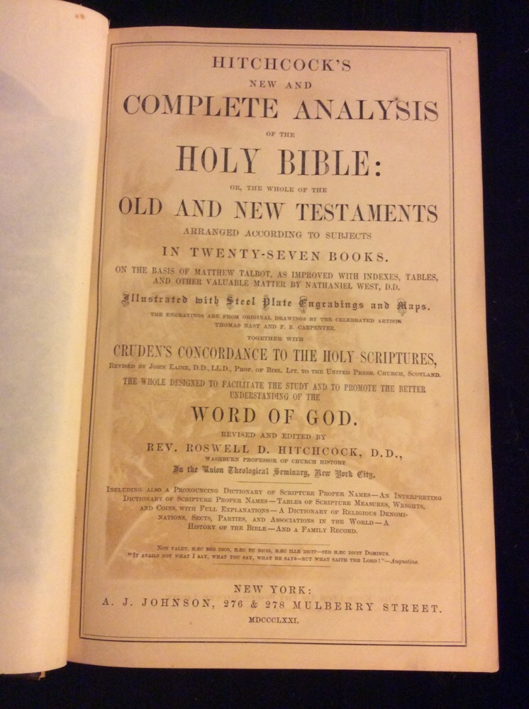 Up for sale antique Hitchcock's New and Complete of the Holy Bible : or the whole of the Old and New Testaments arranged in twenty seven Books by Rev. Roswell D. Hitchcock . Illustrated with steel engravings and maps. This engravings are from original drawings by the celebrated artists Thomas Nast and F.B. Carpenter. Crudest concordance, pronouncing dictionary, tables, charts and history of the Bible. Published by A.J. Johnson .New York.1871. The Holy Bible is in good condition considering the age. Brown cover with leather corner and spine, all edge of the text gilt, text is clean, binding is tight. The front hinge is starting. Foxing on the end papers and opposite the illustrated plates. Some writing on the record pages. The cover has light rubbing and stain. Very light creased on the spine. Please check the pictures for condition and detail. Feel free to contact me if you have any question.