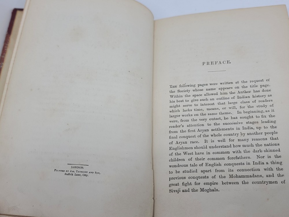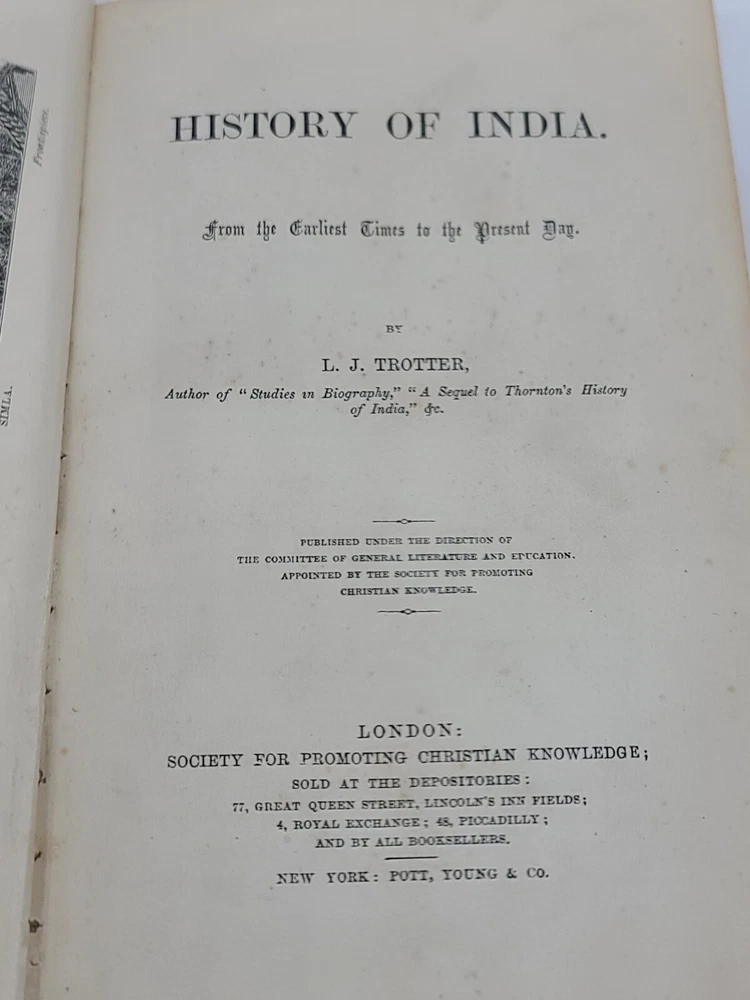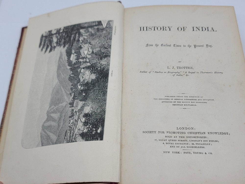 Here is a recent estate find. This is a Rare Antique "First Edition" Illustrated Antique Leather Hardcover Book with Fold Out Map, entitled " The History Of India From The Earliest Times To The Present", B y L.J. Trotter and Published by New York: Pott, Young & Co in 1874. It Measures approx. 7 3/4" x 5 1/2" x 1 1/2". This is in Overall Good Original Condition with Normal Wear From Age, Condition as Pictured, Click and Enlarge Photos for Details! Don't pass this one up, $99.99