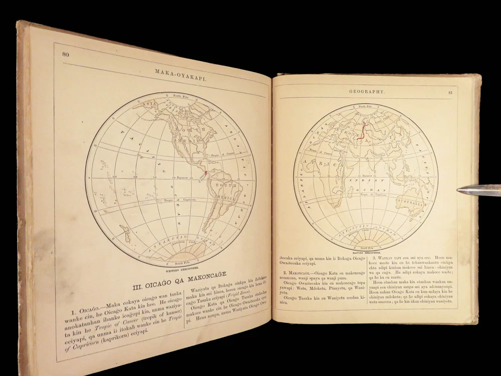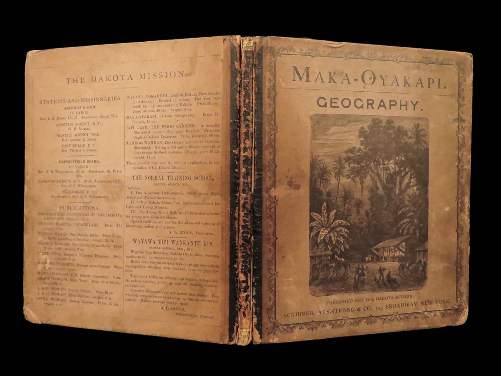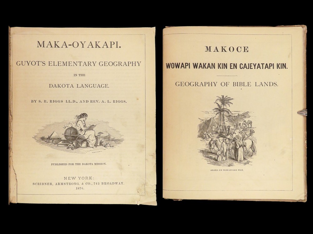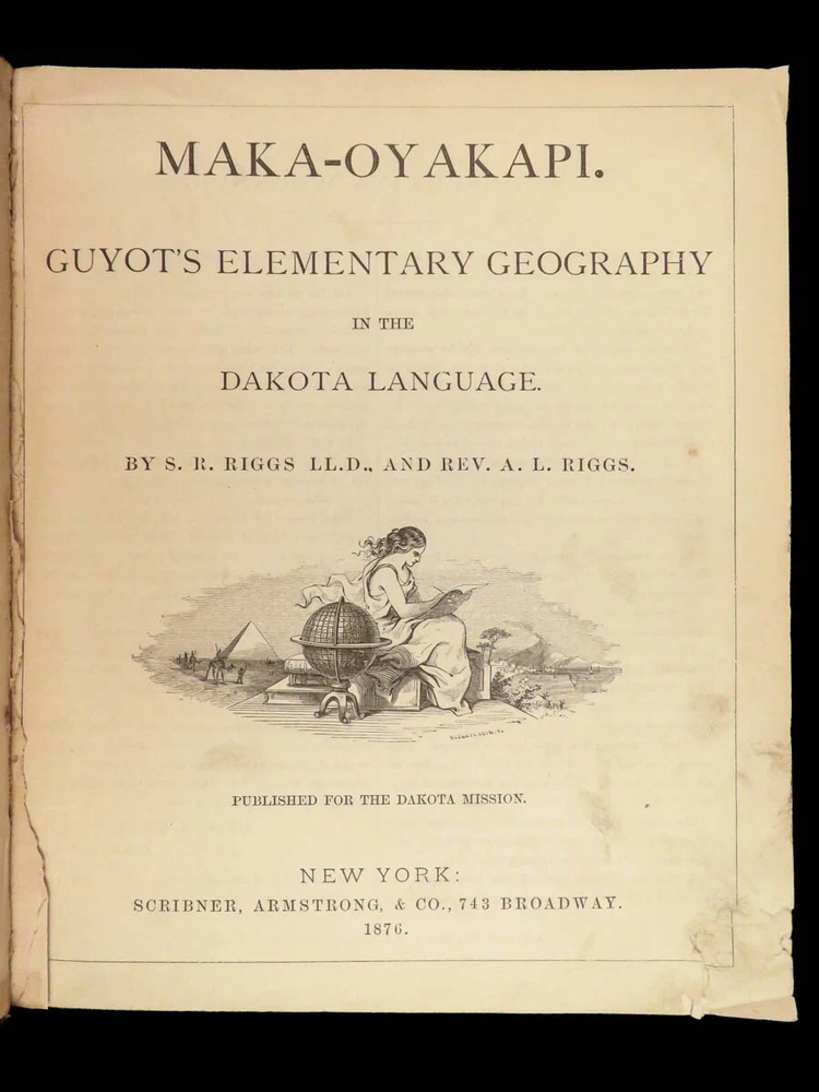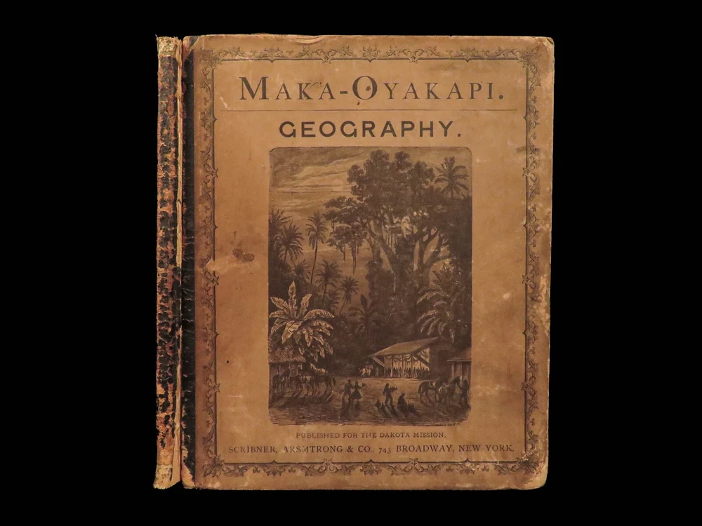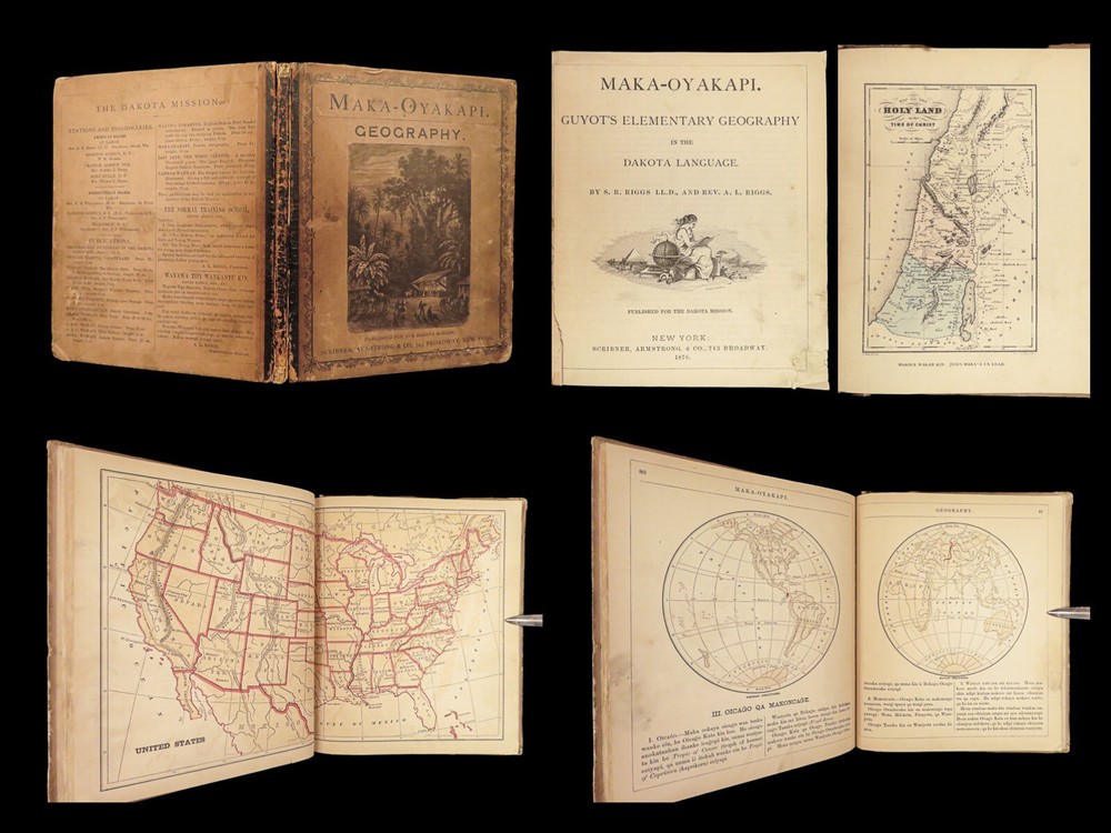 1876 Dakota INDIAN 1 ed Maka Oyakapi Language Geography MAPS Holy Land America Alfred and Stephen Riggs’ “ Maka-Oyakapi ” is a rare 19 th -century elementary geography textbook written in the Dakota language for the Native American people groups in the Dakota mission. This 1876 book describes, in basic terms, North America, Europe, Africa, Asia, and Australia with fascinating illustrations and full-page and double-page maps. It concludes with a section entitled “ Makoce wowapi wakan kin en cajeyatapi kin ” – the geography of the Bible lands including Galilee, Jerusalem, Israel, Palestine, and more. Item number: #23171 Price: $499 RIGGS, Stephen & Alfred Maka-Oyakapi, Geography. Guyot's Elementary Geography in the Dakota Language New York: Scribner, Armstrong, & Co., 1876. 1 st edition Details : · Collation: Complete with all pages o Geography – 83, [3] o Bible lands – [2], 4, [2] · Language: Dakota / English · Binding: Leather; secure · Size : ~8.75in X 7.5in (22.5cm x 19cm) Our Guarantee: Very Fast. Very Safe. Free Shipping Worldwide. Customer satisfaction is our priority! Notify us with 7 days of receiving, and we will offer a full refund without reservation! 23171