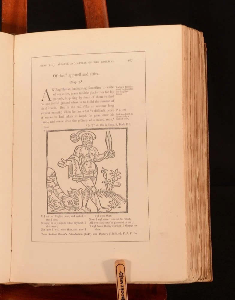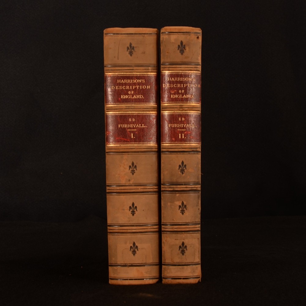 Click here to see our other books! Harrison's Description of England in Shakespeare's Youth: Being the Second and Third Books of His Description of Britaine and England. Frederick J. Furnivall (ed.) 1877-1881 N. Trubner and Co. for the New Shakspere Society : London 10" by 8" cxii, 368pp; 1-66pp, xliv, 1-196pp [plus plates] SUMMARY A copiously illustrated and leather-bound copy of Furnivall's three part edition of Williams Harrison's 'Description of England', the second and third books of his 'Description of Britaine and England'; bound here in two volumes. Folding Maps,Folding Plates,Illustrated,Leather Binding,Rebound Overall Condition: Very Good This book weighs 3 KG when packed UK Postage: £ 3.99 US Postage: £ 36.99 EU Postage : £ 25.99 European Postage: £ 27.99 Asia Postage: £ 47.99 Worldwide Postage: £ 69.99 DESCRIPTION Williams Harrison was an English clergyman best known for his 1577 'Description of England'. Originally published as part of Holinshed's 'Chronicles', the work recounted Elizabethan England's geographic, economic, social, religious and political features during the youth of William Shakespeare. This work was published by the New Shakspere Society, founded by Furnival in 1873. Furnivall used the archaic spelling of Shakespeare's name to distinguish his Society from Collier's earlier 'Shakespeare Society'. Volume I contains Part I, and Volume II contains Part II and Part III- The Supplement (published later than the other parts in 1881). With the bookplate of Roy and Nina Merley to the front pastedown of both volumes. The Merleys owned Plaish Hall, Shropshire. This is a stunning Grade I Tudor house, which is mentioned in the Domesday Book. The home once belonged to Judge William Leighton, who was an amateur poet and sixteenth century composer. The house, as it stands now, was built in two stages for Leighton, who was presiding over a trial of prisoners whilst the home was being completed. Roy and Nina Merley owned the house for thirty-five years and were responsible for reinstating the Tudor style gardens and renovating the house to its former glory. Their bookplate has an image of the house in the background, with a blackbird eating a worm in the foreground. 'Series VI. No. 1' to verso of title page volume I. 'Series VI. No. 5' to verso of title page volume II. With nine folding plates (two of which are in colour) and six full page plates to volume II. CONDITION Rebound in a half polished calf binding with cloth over boards. Externally rubbed to leather to joints, spine, and extremities. Fading to spine, and the odd handling marks to boards. Hinges slightly strained, but reasonably firm. Prior owner's bookplate tipped to front pastedown to each volume. Newspaper clipping to half title page, volume I. Internally firmly bound. Pages slightly age toned to extremities, but very bright and clean. The odd light scattered spot to the occasional plate, volume II. Library ink stamp and ink inscription to verso of title pages. Coloured folding plate of 'Old London Bridge' to volume II detached but present. Overall Condition: Very Good GLOSSARY OF TERMS Overall Condition (Dustwrapper condition rating is shown after that for the book itself, where a dustwrapper is present) Fine - Very well preserved copy showing very little wear Very Good Indeed - Only one or two minor faults, really a very attractive copy Very Good - Quite a wide term meaning no major faults but probably several smaller ones often expected given the age of the book, but still a respectable copy Good - Meaning not very good. Some more serious faults as will be described in the condition report under 'condition' Good Only - Meaning one or more faults that could really do with repair Fair - As with good only above but with other faults leaving a compromised copy even after repair Poor - Really bad and possibly seriously incomplete. We only sell books in this condition where their rarity or value makes them attractive none the less. Major defects will be described. GUARANTEE We offer a full money back guarantee on our descriptions. Please ask for details and conditions. We prefer PAYPAL. If you pay via PAYPAL we will post the item off the same or the next working day with the postage you have selected. Please note we cannot accept USD cheques