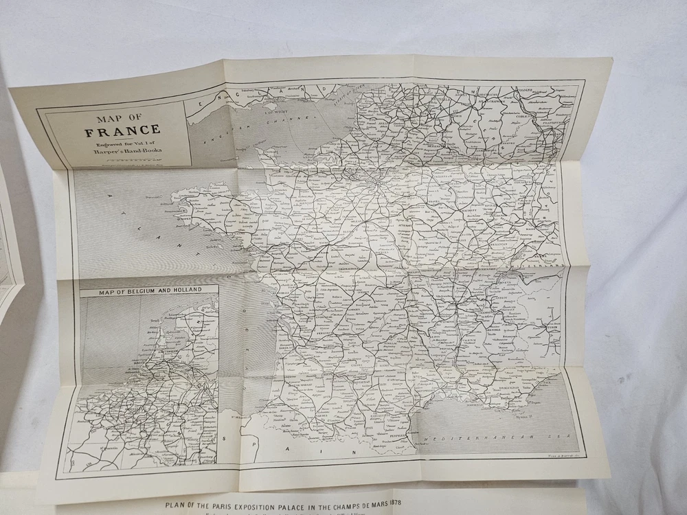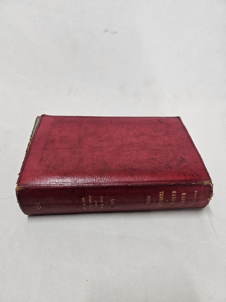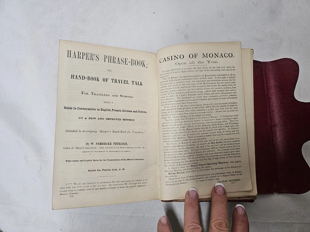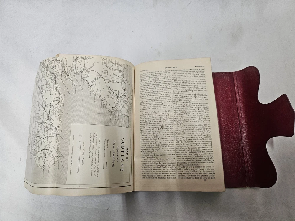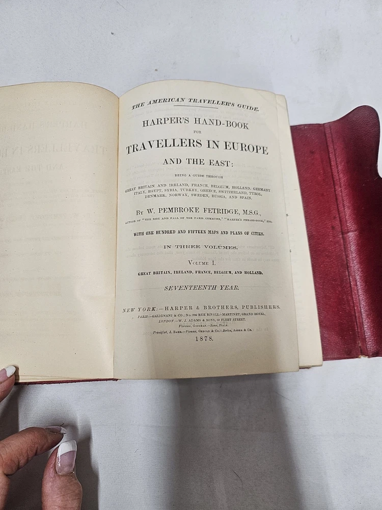 HARPER'S HAND-BOOK FOR TRAVELLERS Volume 1 1885 Edition Harper & Brothers Publishers, NY volume is 7 1/2" X 5 1/4" X 1 1/2" written by Pembroke Fetridge, M.S.G. "with 115 maps and plans of cities" volume has over 500 pages of information, an extensive index, and about 90 pages of advertising packed with information Condition.. .the leather covers are in Very Good Condition. Some edge wear but NO cracking or rips. The pages are excellent see photos for condition local pickup is an option; or media USPS shipping Let me know if you have questions and I will get right back to you. Thanks for looking!