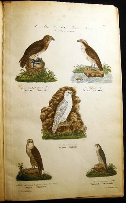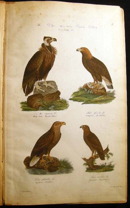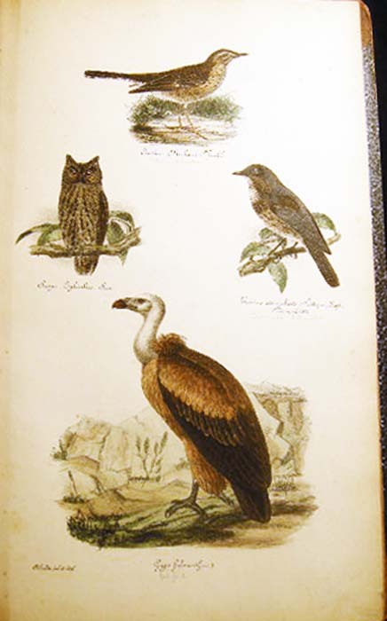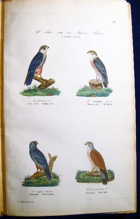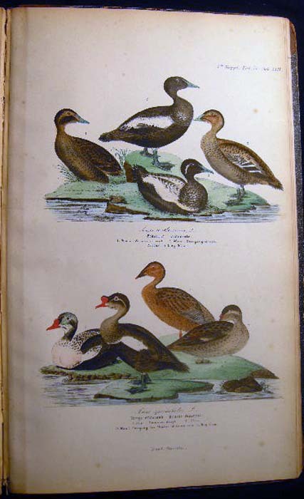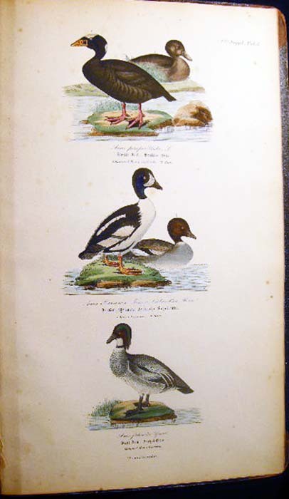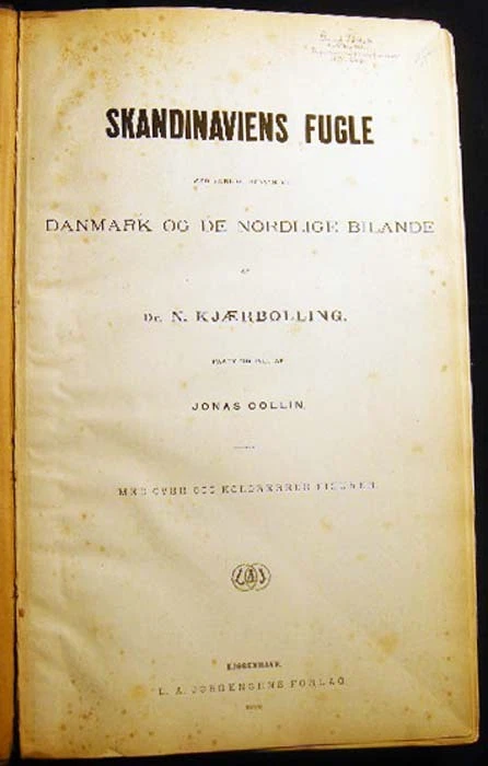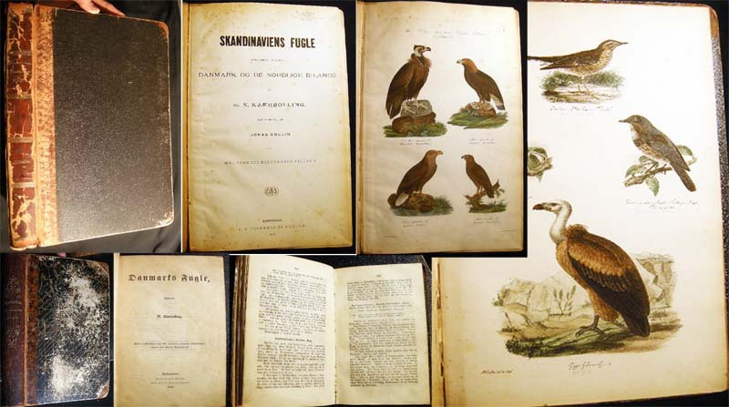 [23154] Kjaerbolling, Niels. Skandinaviens Fugle Med Saerlight Hensyn Til Danmark Og De Norldige Bilande Plate Atlas Complete (with) Danmarks Fugle 1852 Text Volume. Kjobenhavn: L.A. Jorgensens Forlag, 1879. First Edition The atlas with title page, followed by 106 color plates, collated complete ; Danish text, atlas volume with fraktur & italicized Latin titles for the birds; atlas with previous owner inscription at top edge of title page and old pencil bookseller notations on front endpaper; approx. 10" x 16" size; atlas with leather spine & corner tips, polished black pebbled-surface paper covered boards, gilt spine titles & gilt ornamentation in bars; edge, tips, spine end erosion wear, to binding, plates darkened a little, mostly clean, occasional foxing, colors still very bright; in good condition (with) Danmarks Fugle, beskrevne, af N. Kjaerbolling 1852 Kjobenhavn Forsatterens Forlag; xxxiv + 422 + ix + (2) pages errata; the text entirely in fraktur; approx. 5 1/4" x 8" size; leather spine and corner tips, black marbled paper covered boards, gilt spine titles and decoration, marbled endpapers to match; edge, tips wear and rubbing to the binding, front inner endpaper hinge strengthened in the past; in good condition; Niels Kjaerbolling (1806 - 1871) prominent Danish ornithological writer and lithographer.