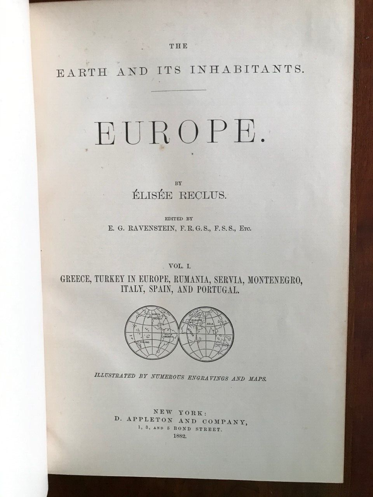 The Earth and Its Inhabitants: Europe (5 volume set) Illustrated by Numerous Engravings and Maps By Elisee Reclus Published D. Appleton and Company, New York, 1882. Five large volumes in uniform green 1/4 leather bindings. Marbled page edges & end papers, pages generally clean and the volumes are tight, each volume with detailed table of contents and an index. Prior ownership inscription of Geo. R. French, Jr. of Wilmington, NC (1883). The French family were a prominent Wilmington family that owned and operated the largest shoe repair business in Wilmington. Details on each below. This five-volume set (all that was completed as of 1882) is the complete section on Europe, of a set that would later encompass the entire world and expand to 19 volumes. The gorgeous production has hundreds of illustrations of scenes - some of which were to be destroyed by war some thirty-five years later. They show Europe as it was, and the people as they were, when the old distinctive ethnic clothing was worn every day, and not just in remembrance on special occasions. Jacques Élisée Reclus (1830-1905), French geographer, idealist, and anarchist; the son of a Calvinist minister. His political radicalism forced him to live away from France, at times in extreme poverty; he lived at one point near New Orleans as the tutor of a French family who were plantation and slave owners. His great work of geography, La Nouvelle Geographie Universelle began to be published about 1880, with the last volume completed in 1894. "His combination of scholarly geography and political anarchy embarrassed the university world, which is why he has been partially forgotten." - museeprotestant online. In 1892 he was awarded the Gold Medal of the Paris Geographical Society for this work, despite having been banished from France because of his political activism.At Clarens, Switzerland, "he wrote nearly the whole of his work, La Nouvelle Géographie universelle, la terre et les hommes, 'an examination of every continent and country in terms of the effects that geographic features like rivers and mountains had on human populations and vice versa,' This compilation was profusely illustrated with maps, plans, and engravings. It was awarded the gold medal of the Paris Geographical Society in 1892. An English edition was published simultaneously, also in 19 volumes, the first four translated by E. G. Ravenstein, the rest by A. H. Keane. Reclus's writings were characterized by extreme accuracy and brilliant exposition, which gave them permanent literary and scientific value."According to Kirkpatrick Sale: 'His geographical work, thoroughly researched and unflinchingly scientific, laid out a picture of human-nature interaction that we today would call bioregionalism. It showed, with more detail than anyone but a dedicated geographer could possibly absorb, how the ecology of a place determined the kinds of lives and livelihoods its denizens would have and thus how people could properly live in self-regarding and self-determined bioregions without the interference of large and centralized governments that always try to homogenize diverse geographical areas.'" - courtesy of wikipedia.Volume One: Greece, Turkey in Europe, Rumania, Servia, Montenegro, Italy, Spain, and Portugal. Eight color maps: Ethnological Map of Europe, Turkey-in-Europe and Greece, The Bosphorus and Constantinople, Ethnographical Map of Turkey, Italy, The Delta of the Po, The Bay of Naples, Spain and Portugal. Thirty-two full-page plates. 498 text illustrations. viii., 504 pp.Volume Two: France and Switzerland. Seven color maps: France, Geological; France, Political; Mont Blanc; The Volcanoes of Central France; Geological Map of the Paris Basin; Switzerland; Mount St .Gotthard. Thirty-four full-page plates. 334 text illustrations. viii., 504 pp.Volume Three: Austria-Hungary, Germany, Belgium, and the Netherlands. Six color maps: Germany and Austria, Vienna and its Environs, The Rhine from Mayence to Coblenz, Dresden and Saxon Switzerland, Berlin and its Environs, Hamburg and its Environs. Thirty-four full-page plates. 284 text illustrations. viii., 504 pp.Volume Four: The British Isles. Eight color maps: British Islands I've done my best to describe the book, but if you have any questions, please don't hesitate to send me an e-mail.
