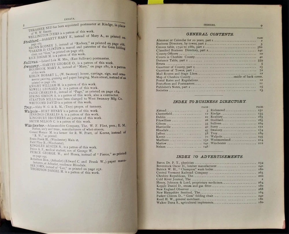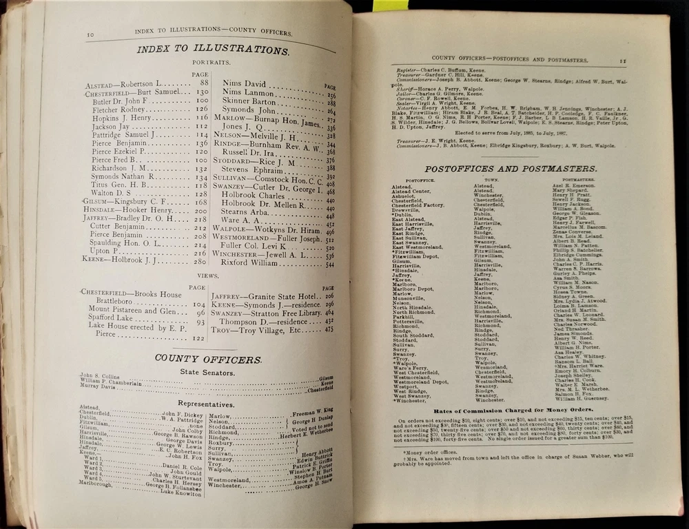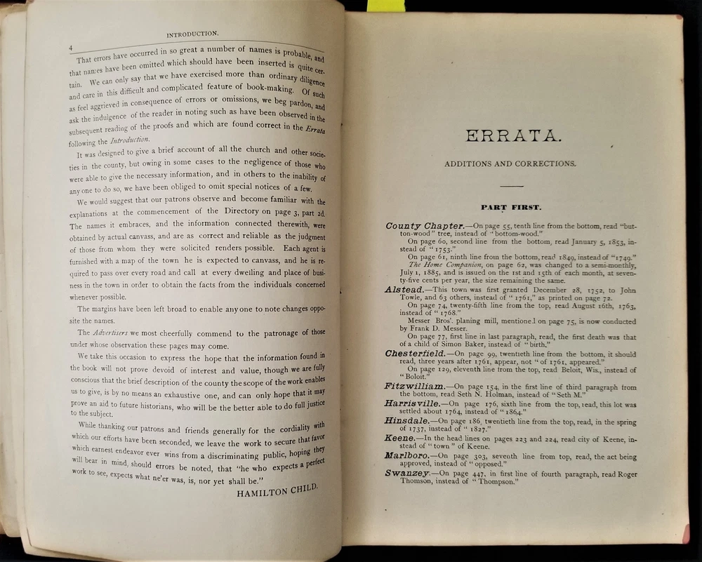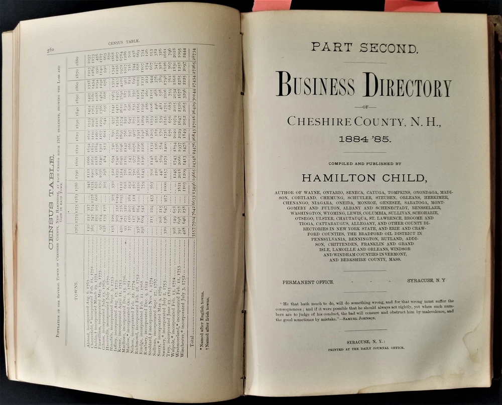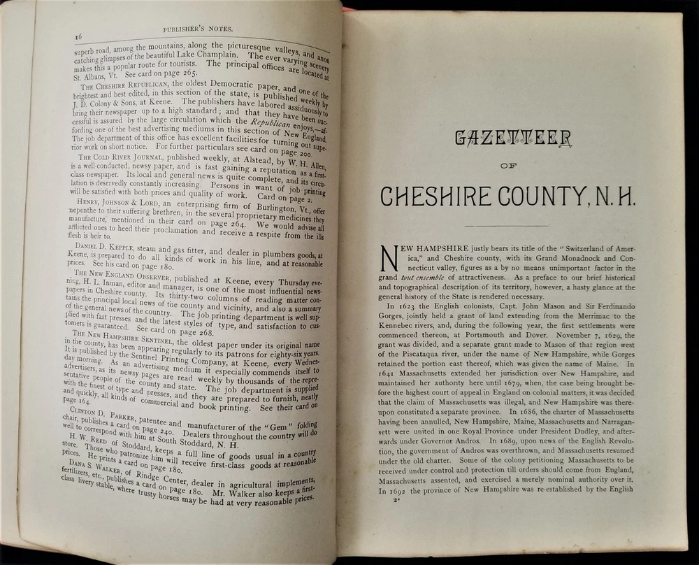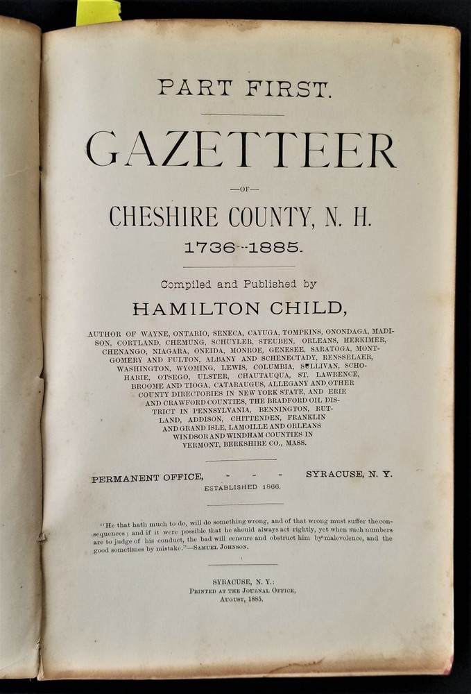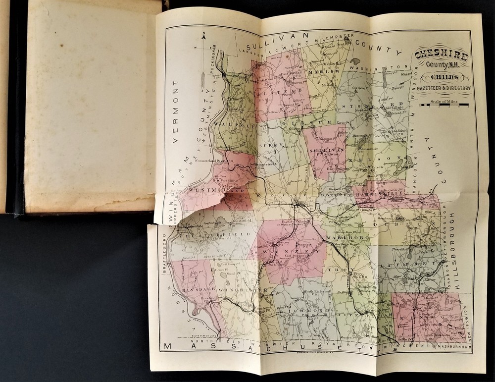 1885 antique CHESHIRE County NH HISTORY foldout MAP genealogy Business DIRECTORY SCROLL DOWN for MORE PHOTOS in DESCRIPTION Click HERE to view or search ANTIQUE.COTTAGE listings. This listing is for the original leather covered book with cloth repaired spine. Gazetteer of Cheshire County, NH, 1736-1885. Compiled by Hamilton Child. Syracuse, NY: Printed at the Journal Office, August 1885. Part First - Gazetteer - 561 pages Part Second- Business Directory - 272 pages Excellent original early family, and/or town genealogy, history, antique, museum, collectible heirloom and/or ephemera. CONDITION : Complete and intact with foldout map! Some antique page wear/edge dampstain. Other antique wear. Binding loosening. Repaired cover and spine. See listing description and photos. - International buyers are responsible to pay VAT or other Taxes to their countries as required. - eBAY collects and remits sales tax on behalf of several states. If you are a dealer, you can write to eBay to file a form to become tax exempt. LOC: LOC2: BOOKSHELF31-TMK Powered by SixBit's eCommerce Solution