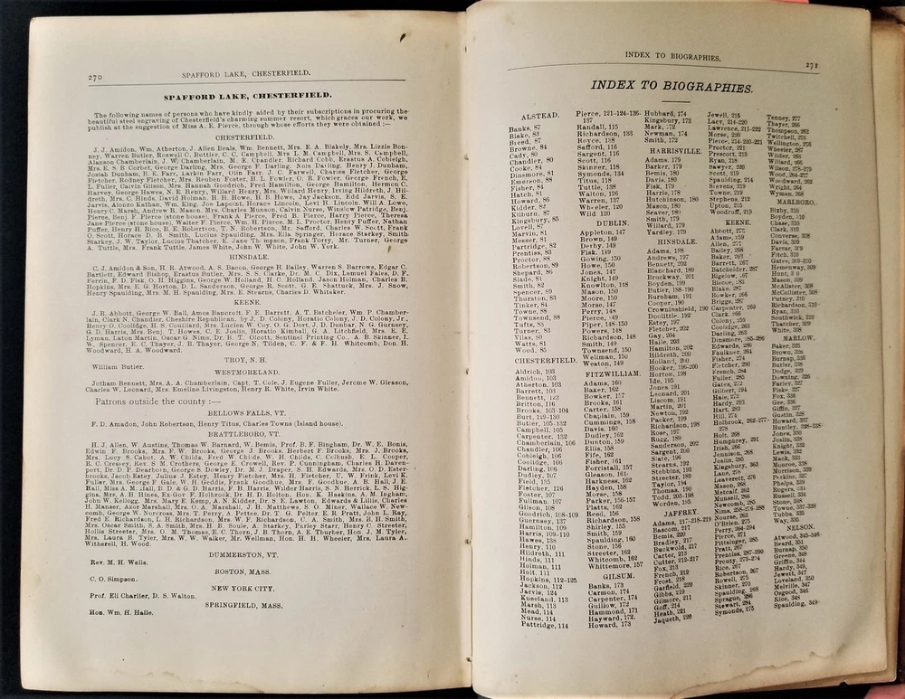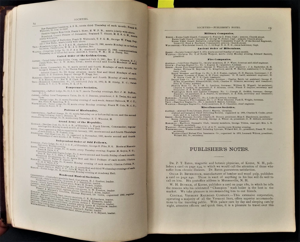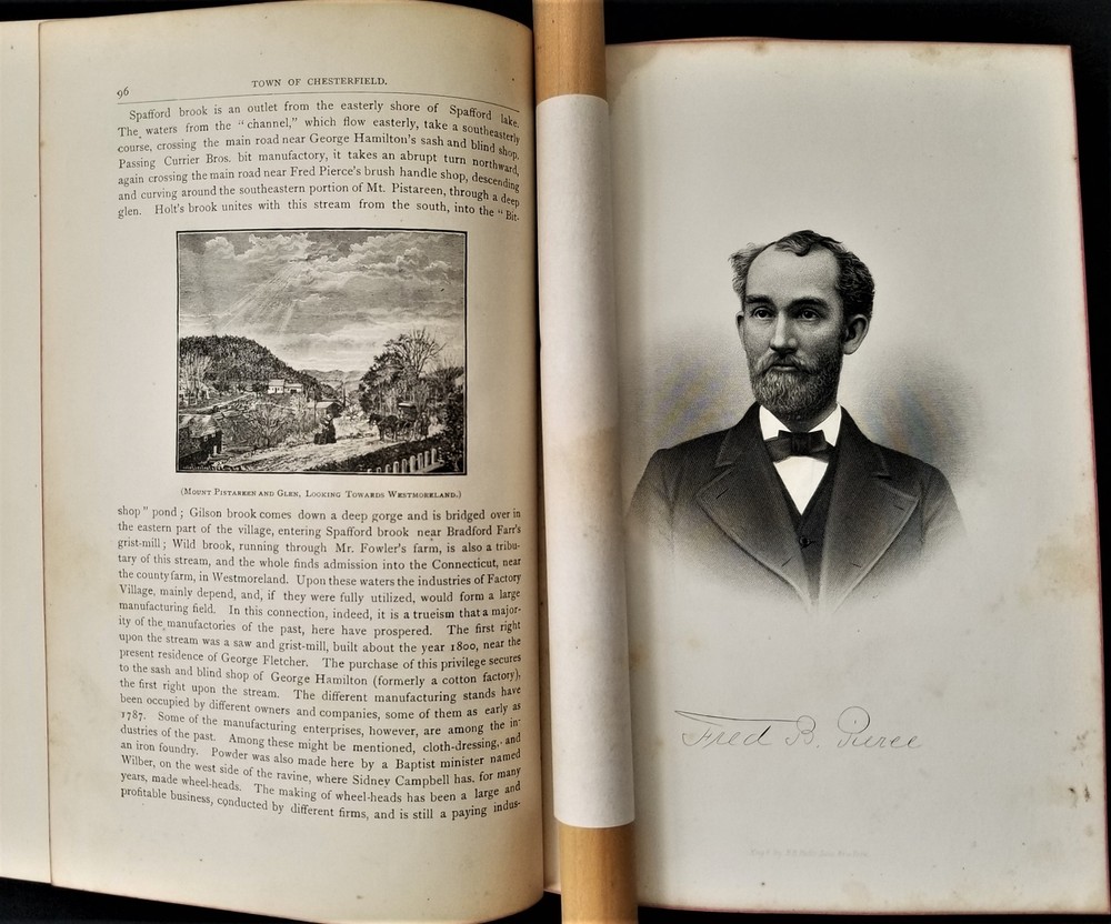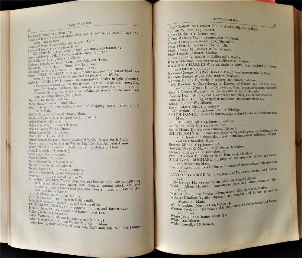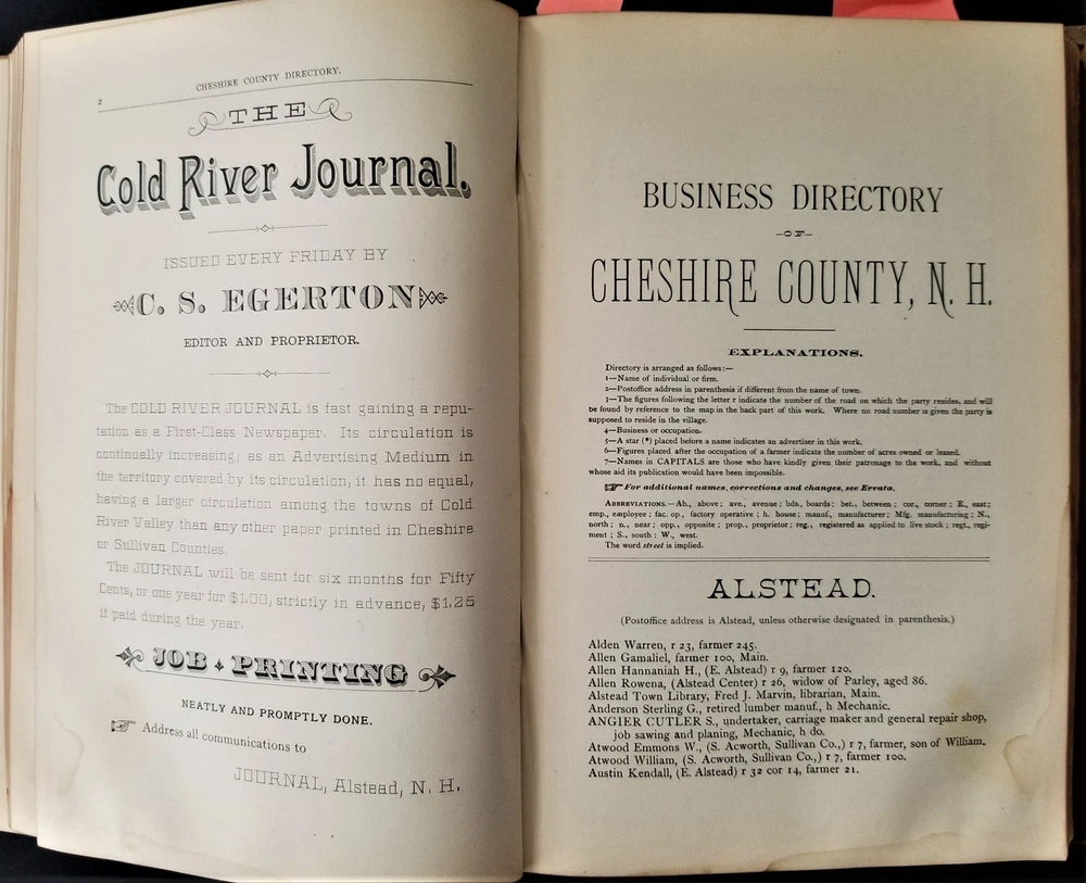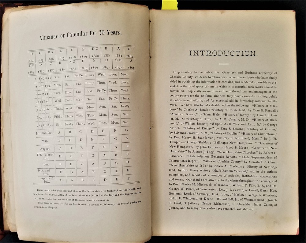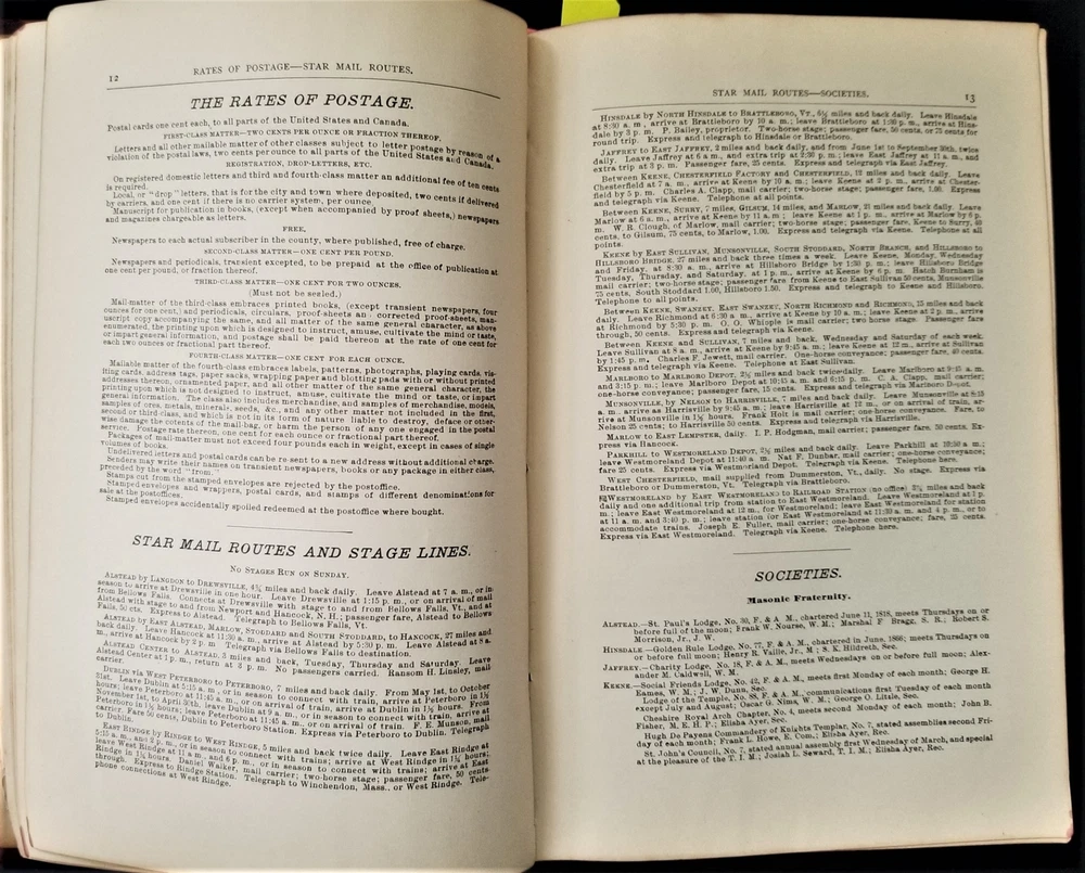 1885 antique CHESHIRE County NH HISTORY foldout MAP genealogy Business DIRECTORY SCROLL DOWN for MORE PHOTOS in DESCRIPTION Click HERE to view or search ANTIQUE.COTTAGE listings. This listing is for the original leather covered book with cloth repaired spine. Gazetteer of Cheshire County, NH, 1736-1885. Compiled by Hamilton Child. Syracuse, NY: Printed at the Journal Office, August 1885. Part First - Gazetteer - 561 pages Part Second- Business Directory - 272 pages Excellent original early family, and/or town genealogy, history, antique, museum, collectible heirloom and/or ephemera. CONDITION : Complete and intact with foldout map! Some antique page wear/edge dampstain. Other antique wear. Binding loosening. Repaired cover and spine. See listing description and photos. - International buyers are responsible to pay VAT or other Taxes to their countries as required. - eBAY collects and remits sales tax on behalf of several states. If you are a dealer, you can write to eBay to file a form to become tax exempt. LOC: LOC2: BOOKSHELF31-TMK Powered by SixBit's eCommerce Solution