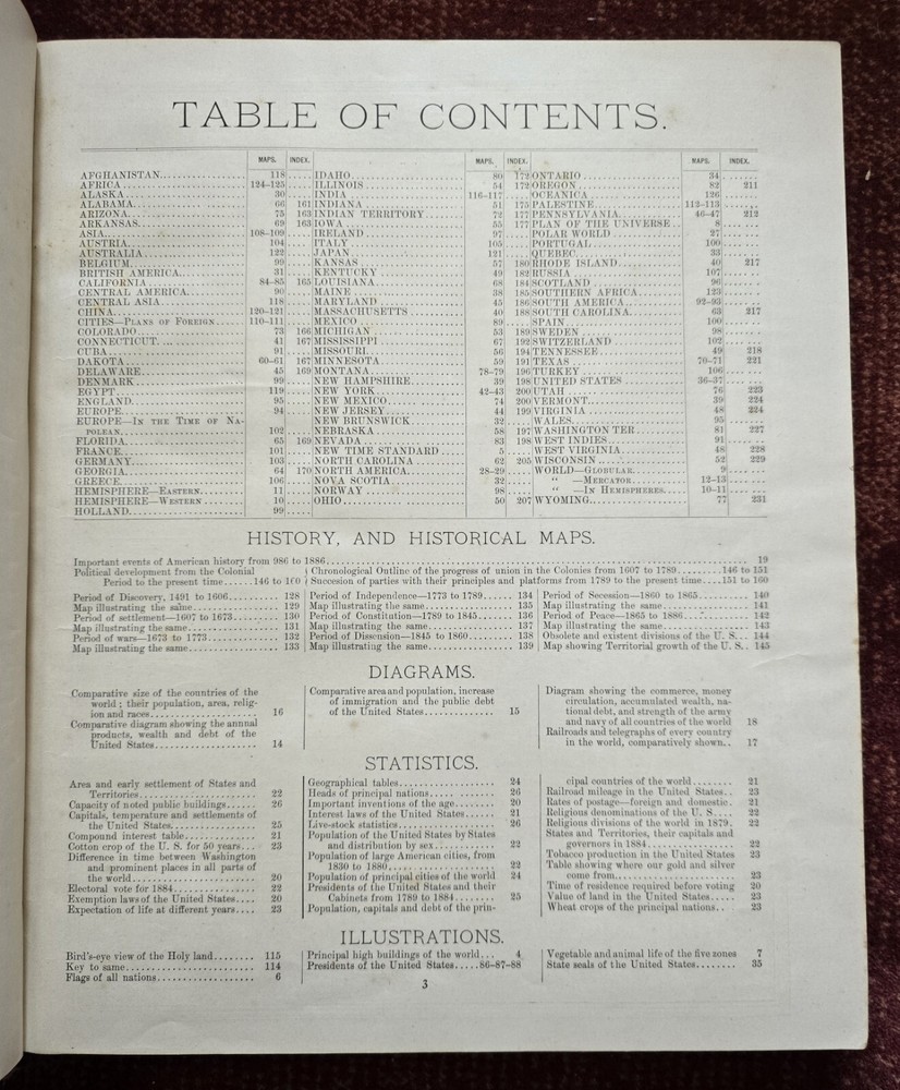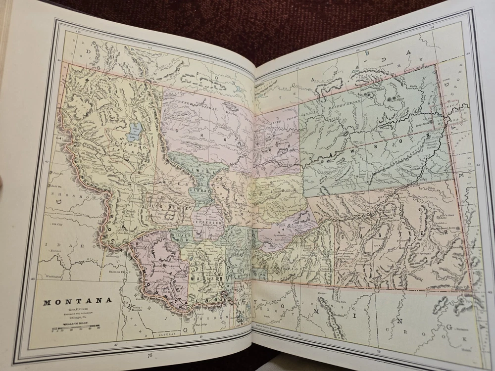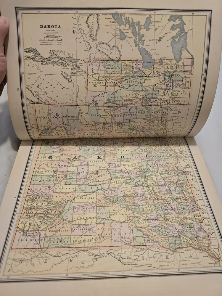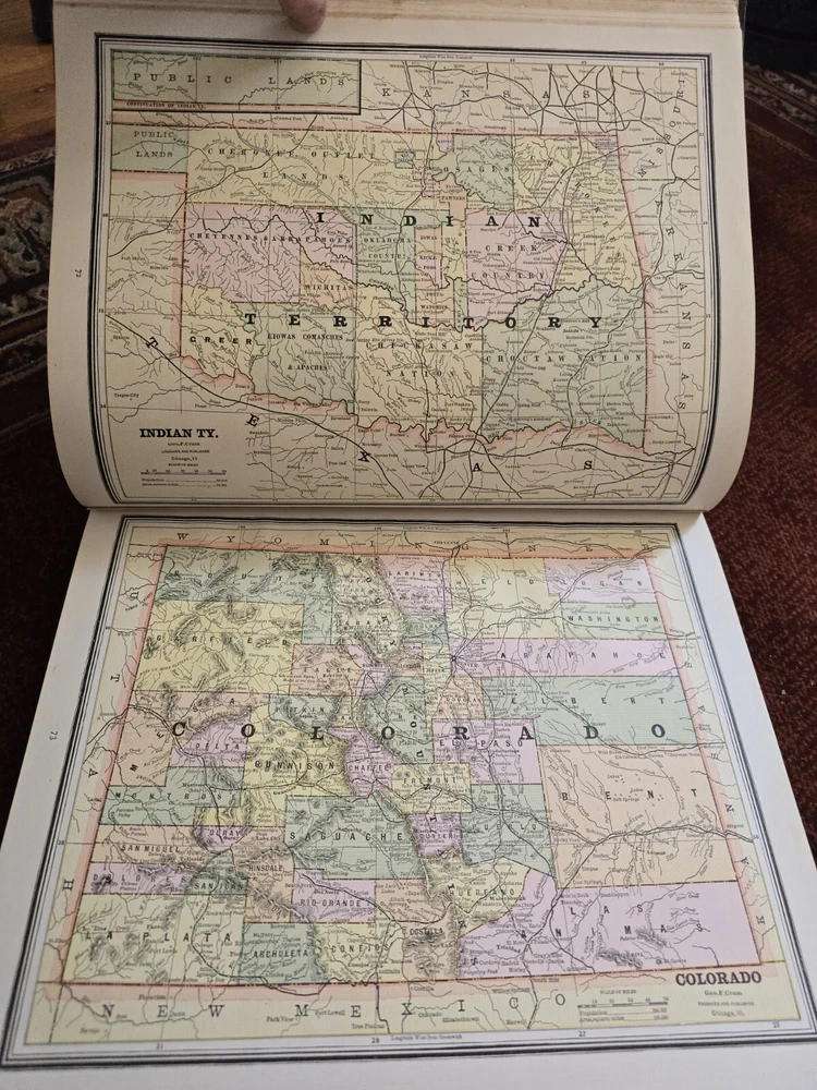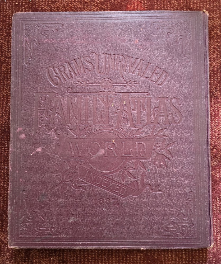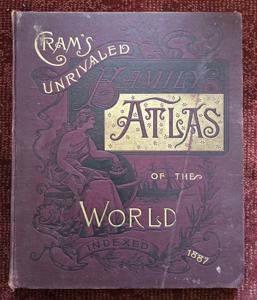 1887 Cram's Unrivaled Family Atlas of the World. Complete, with numerous color maps. Includes maps of Indian Territory. Pages are in excellent condition, with no mildew. Book covers are flat and straight. Back cover hinge is weak and has a split at top. 232 pages. Displays beautifully - see photos!
