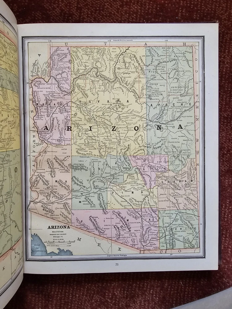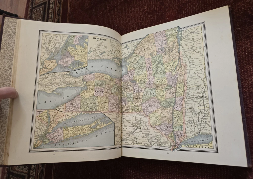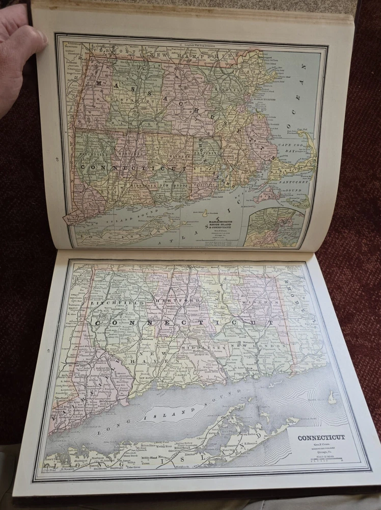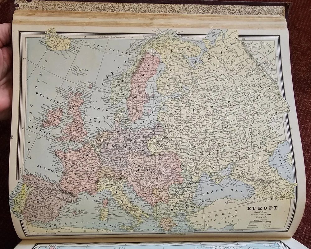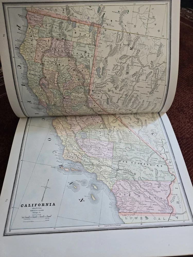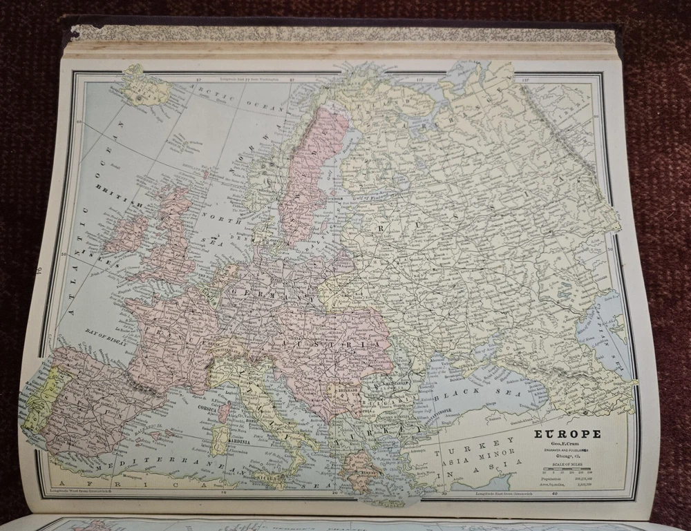 1887 Cram's Unrivaled Family Atlas of the World. Complete, with numerous color maps. Includes maps of Indian Territory. Pages are in excellent condition, with no mildew. Book covers are flat and straight. Back cover hinge is weak and has a split at top. 232 pages. Displays beautifully - see photos!
