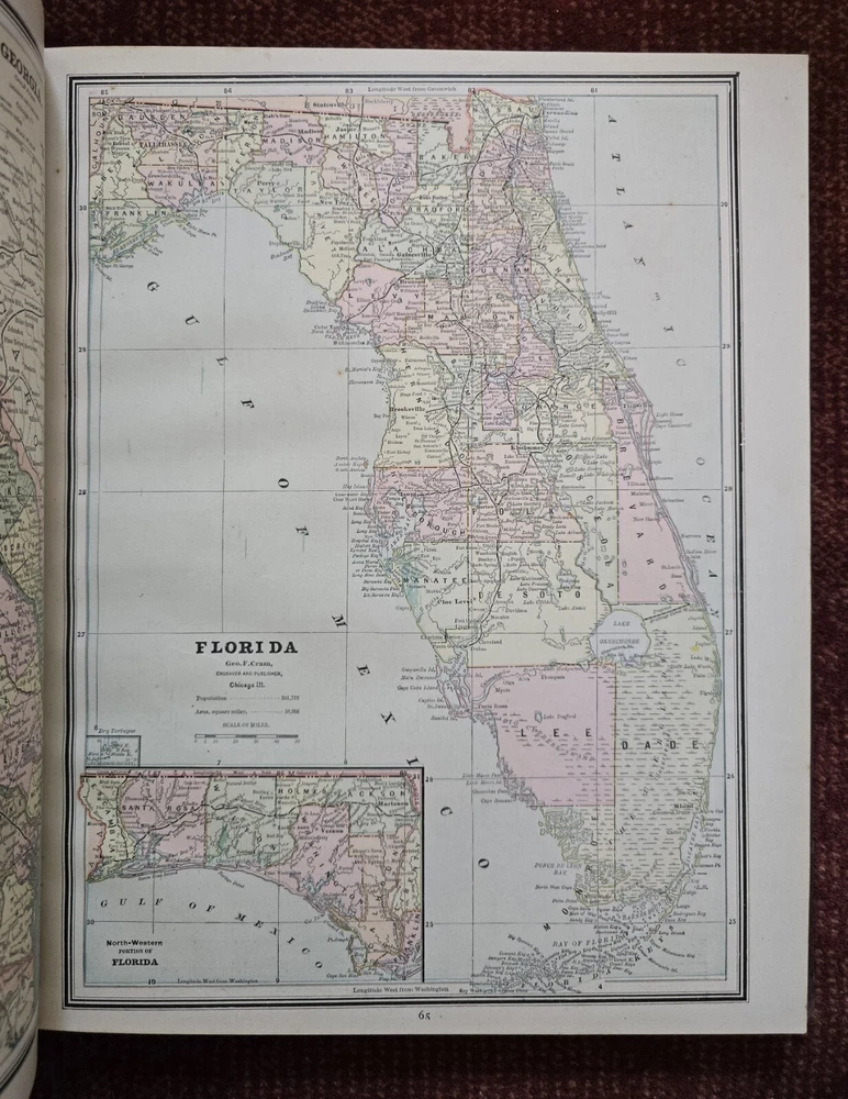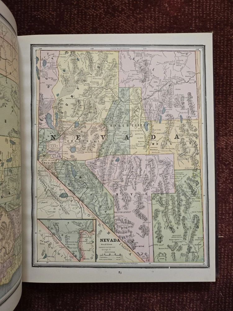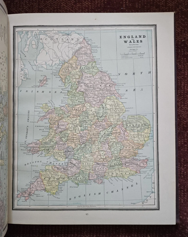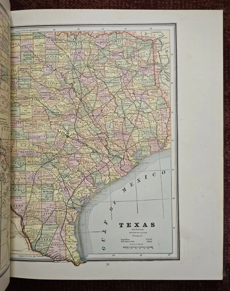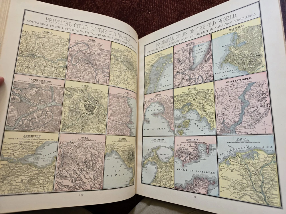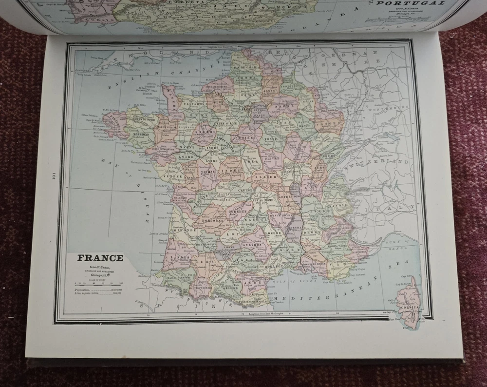 1887 Cram's Unrivaled Family Atlas of the World. Complete, with numerous color maps. Includes maps of Indian Territory. Pages are in excellent condition, with no mildew. Book covers are flat and straight. Back cover hinge is weak and has a split at top. 232 pages. Displays beautifully - see photos!