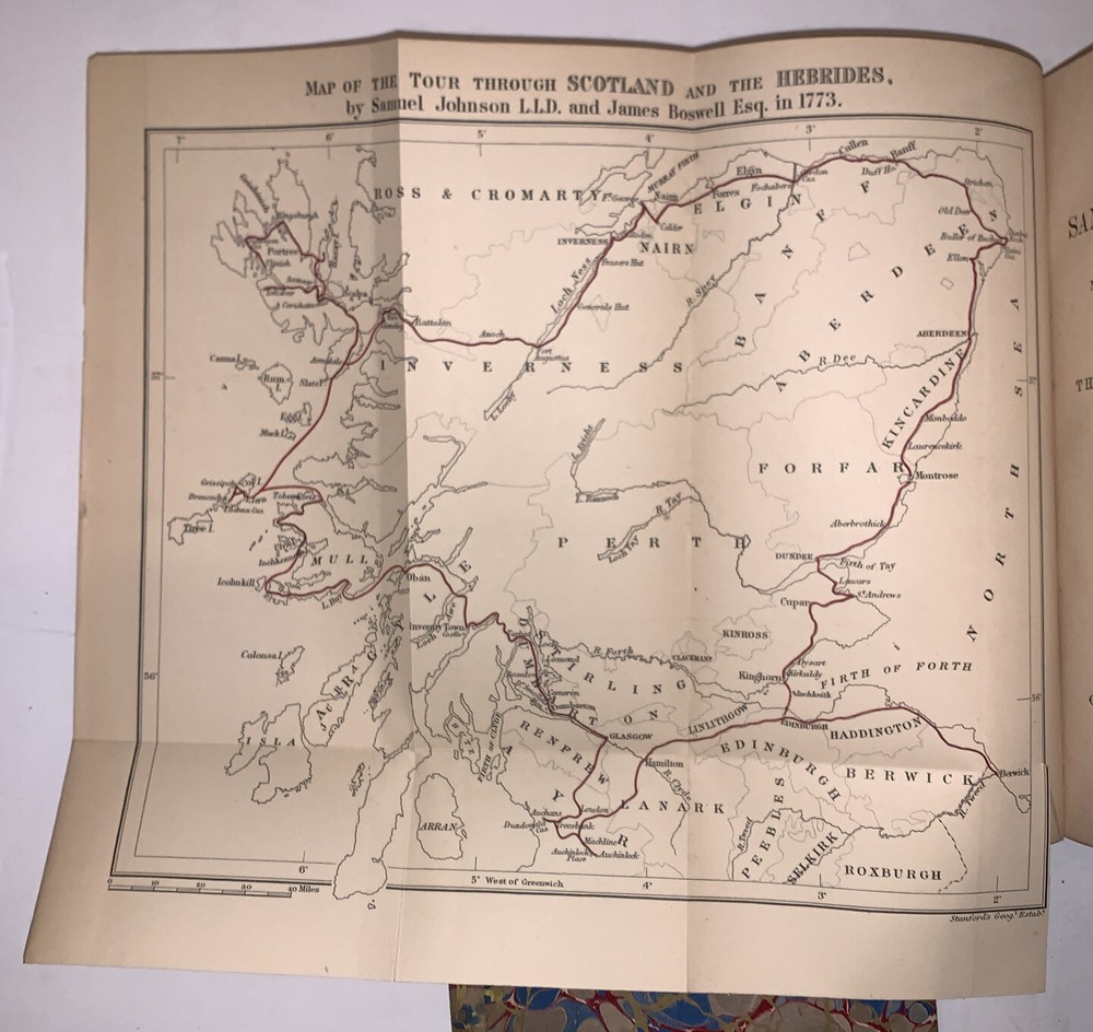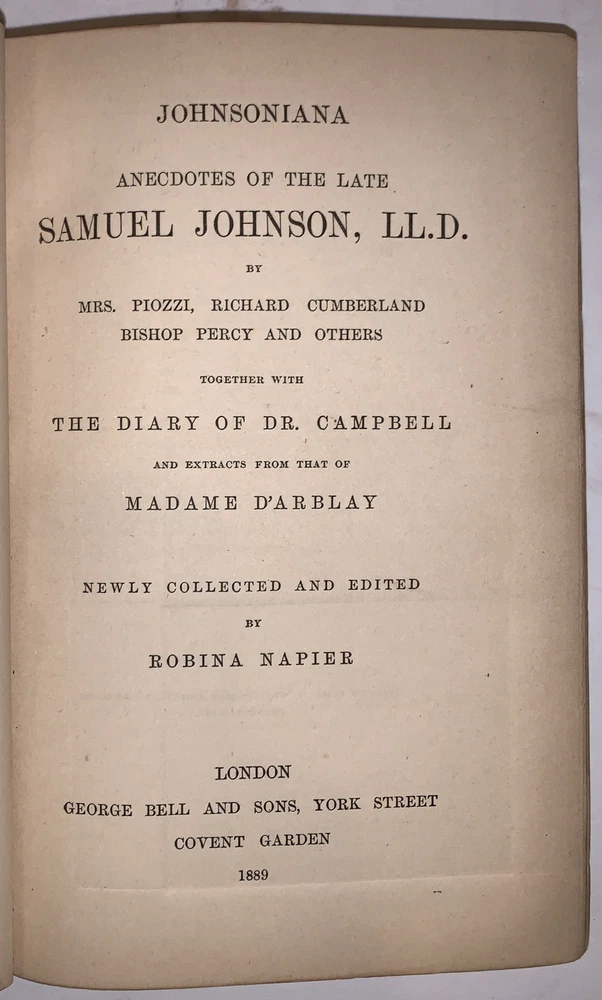 Johnsonia Anecdotes of the Late Samuel Johnson, LL.D. by Mrs. Piozzi, Richard Cumberland, Bishop Percy and Others Together with the Diary of Dr. Campbell and Extracts From That of Madame D'Arblay Newly Collected and Edited by Robina Napier London: George Bell and Sons 1889 12mo, xiii, 479 pages, bound in period three quarter leather over marbled boards. Fold out frontispiece map. Marbled endpapers, top edge gilt. Spine decorated in gilt. Lacks rear board, front board detached, moderate rubbing, damage to spine, scuffs, discoloration, else in good condition. If you have any questions feel free to ask and don't forget to check out my other listings. Johnsonia Anecdotes of the Late Samuel Johnson, Ll.D. By Mrs Piozzi, Richard Cumberland, Bishop Percy and Others Together With the Diary of Dr Campbell and Extracts From That of Madame D'Arblay