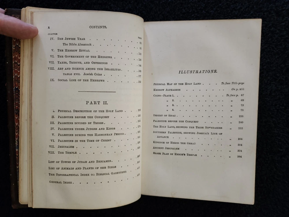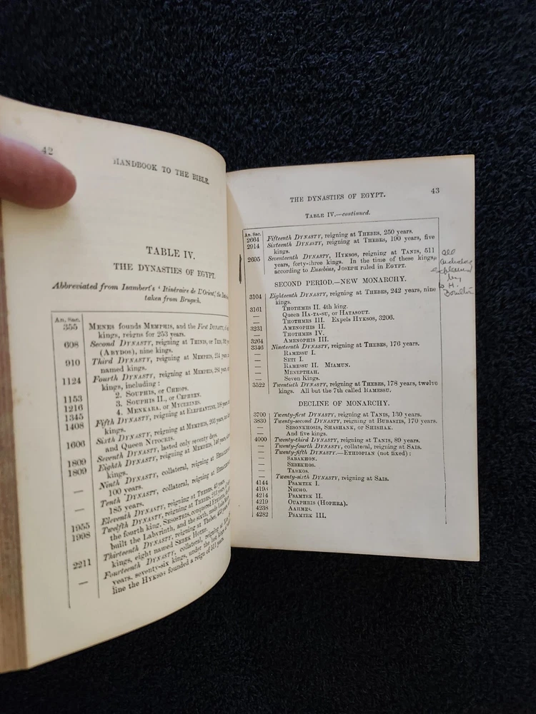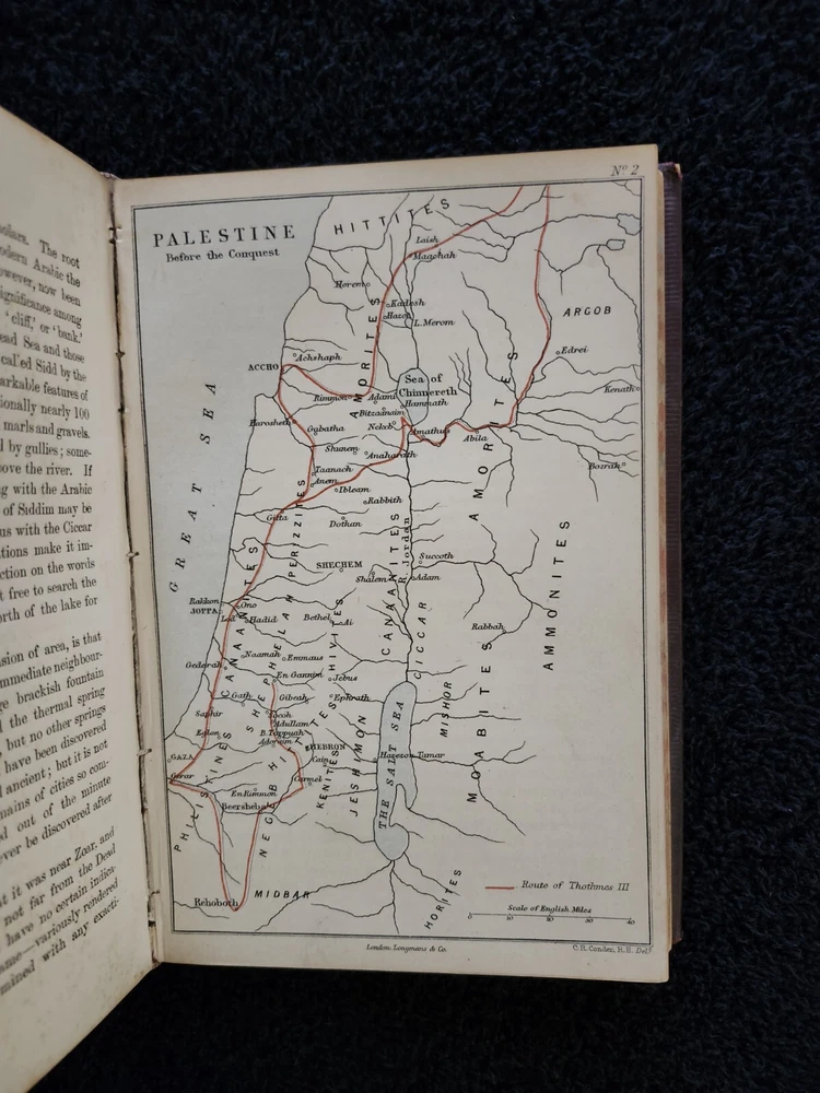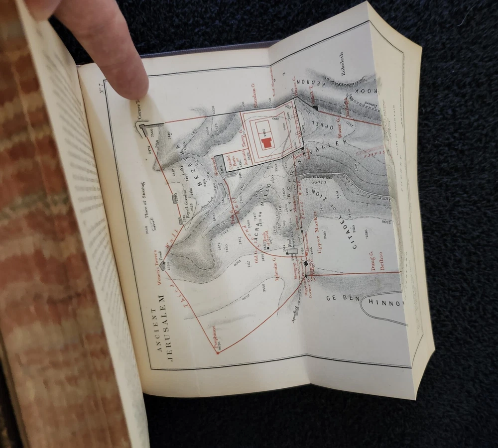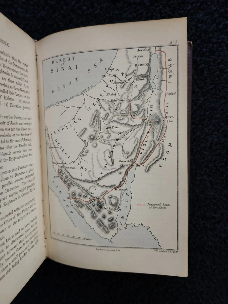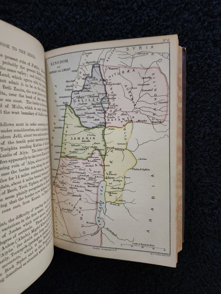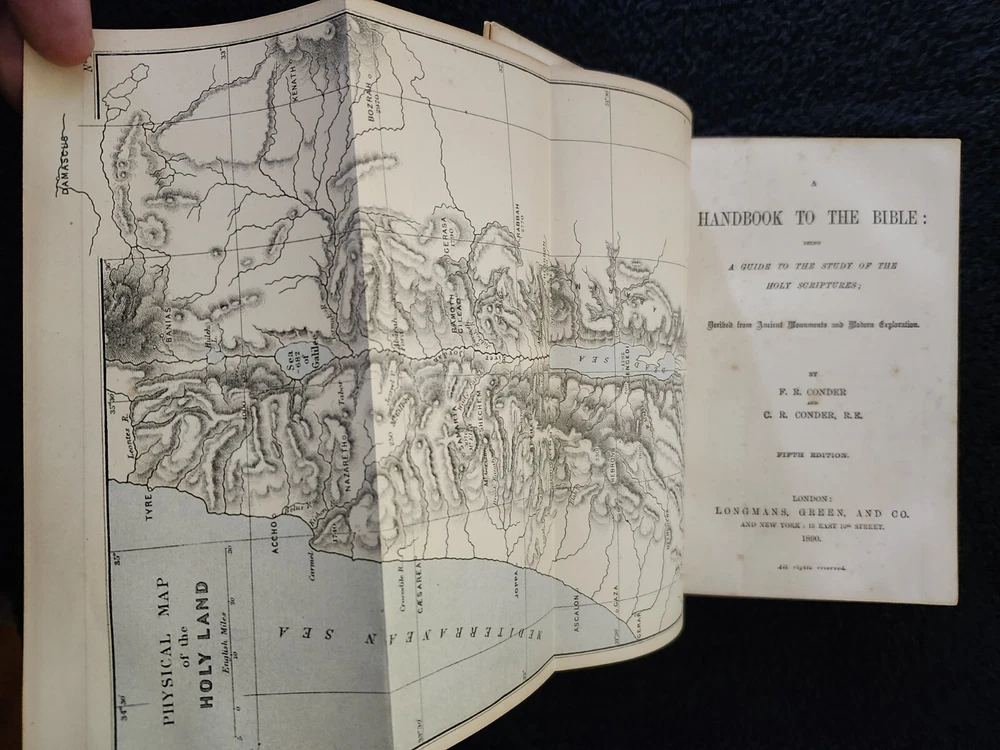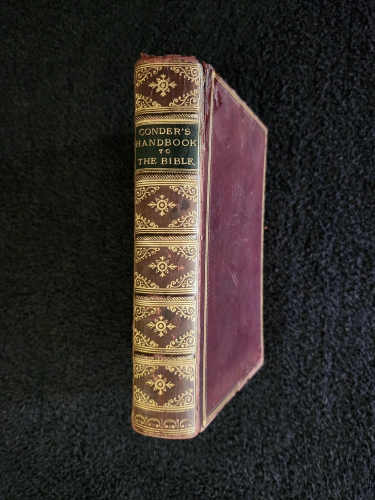 A Handbook To The Bible: Being A Guide To The Study Of The Holy Scriptures; Derived From Ancient Monuments and Modern Exploration. By C.R. (Claude Reignier 1848-1910) and F.R. Conder, London: Longmans, Green, And Company, 1890, Fifth Edition. Hardcover. 7.25"×5"×1.4", 1 lbs. 8 oz., 439 pages, foldout map frontis, additional foldout map, illustrations and color maps. Contemporary calf, gilt rules to covers, decorative gilt spine with title on black label, crack at front top hinge, glue residue from attempted repair, holding firmly, marbled edges and endpapers. Pages are clean, tight, minor occasional foxing, and unmarked with the exception of notes to half-title, and two additional instances of notes to margin/underlining. Overall a very good, beautifully bound antique book. At the time of this listing, this is the only copy of this edition for sale. Please see photos for the described condition and contents pages. Contact me for any additional photos or information. Very quickly, carefully, and securely shipped with USPS Media Mail. Also available for free local pickup in Los Angeles 90034. Combined orders shipping discount is applied to additional purchases from my listings.
