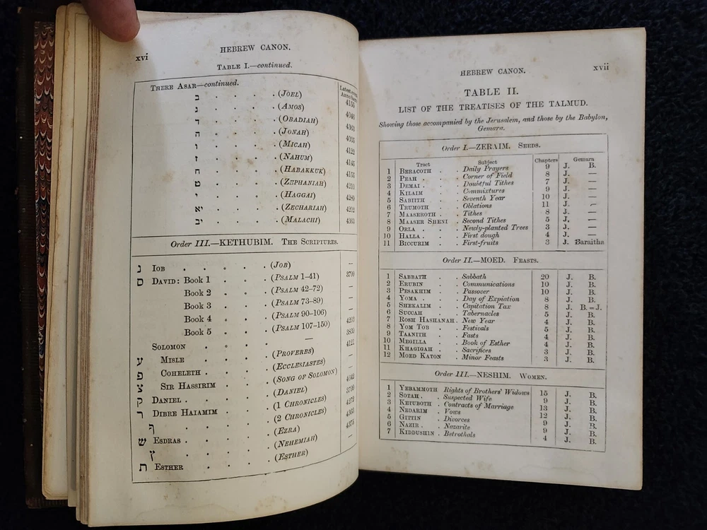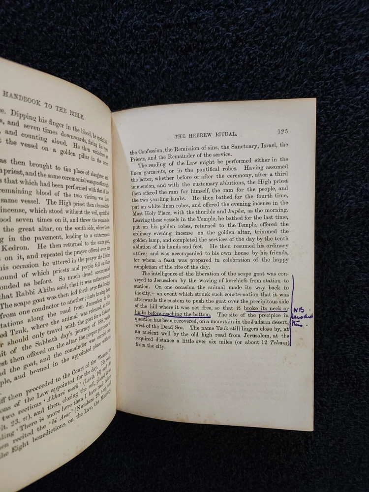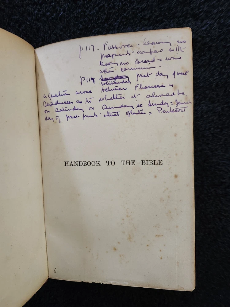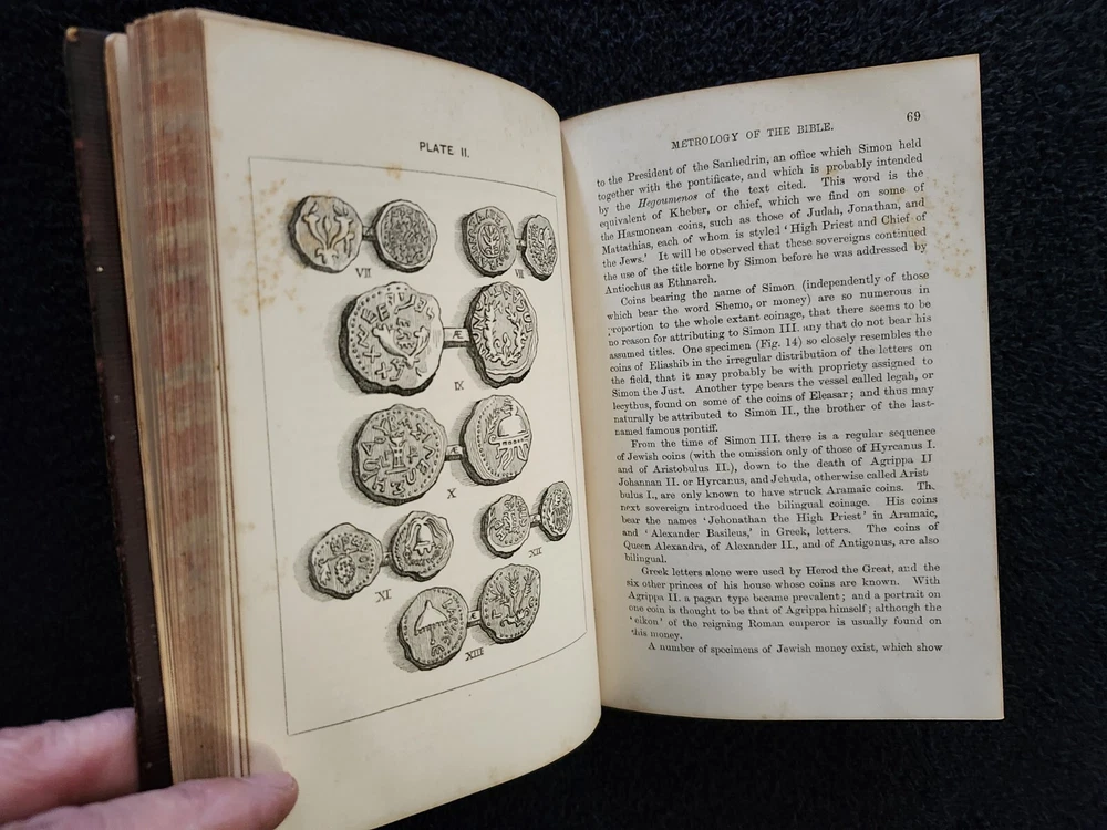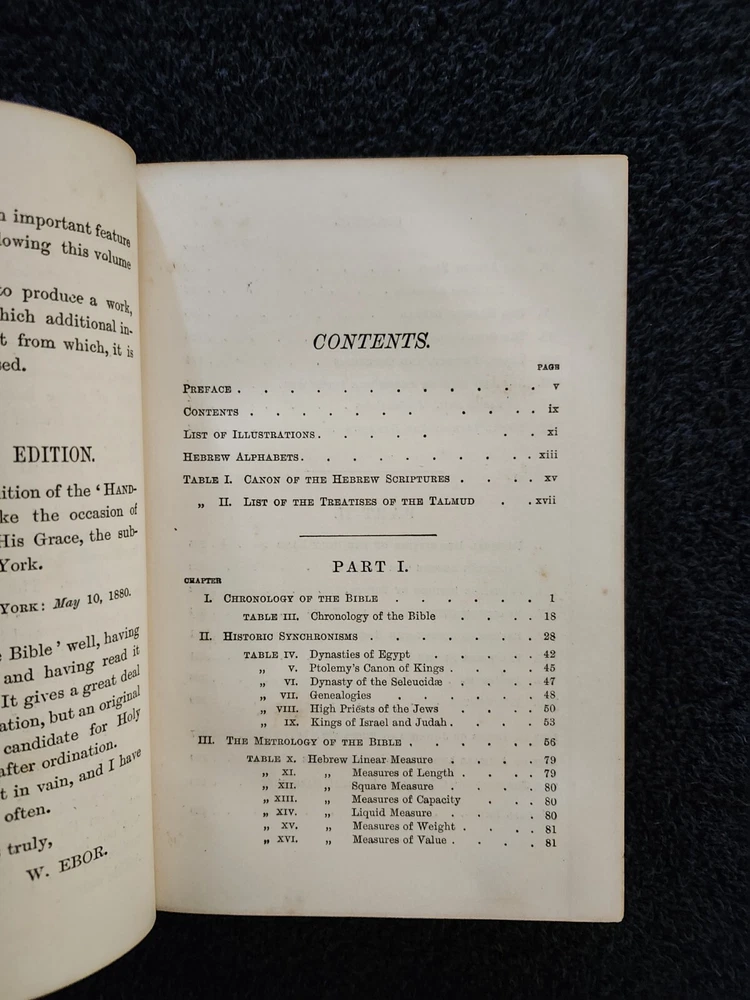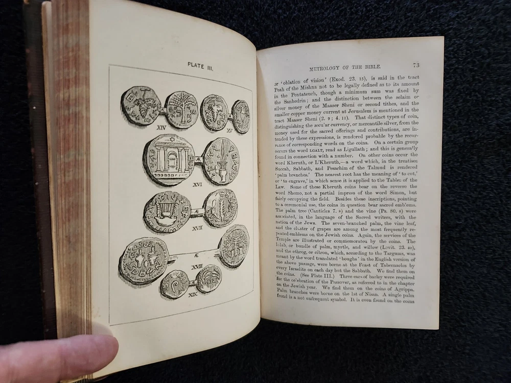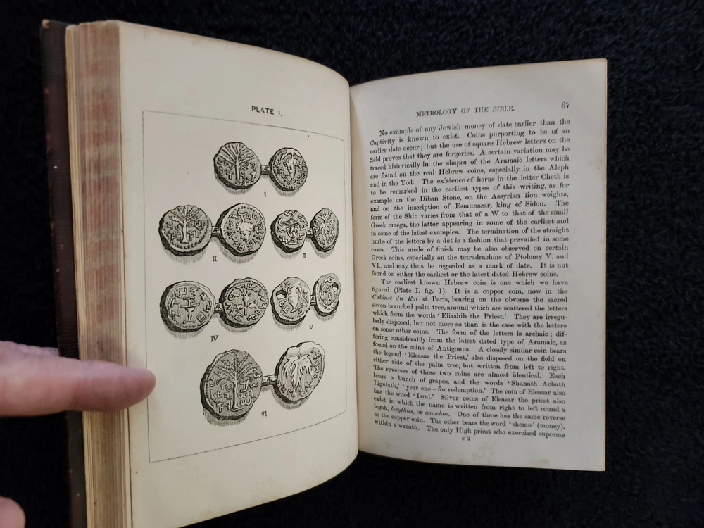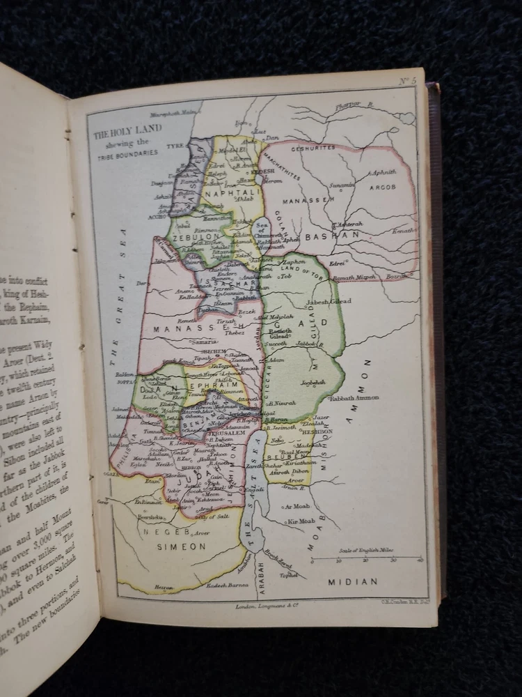 A Handbook To The Bible: Being A Guide To The Study Of The Holy Scriptures; Derived From Ancient Monuments and Modern Exploration. By C.R. (Claude Reignier 1848-1910) and F.R. Conder, London: Longmans, Green, And Company, 1890, Fifth Edition. Hardcover. 7.25"×5"×1.4", 1 lbs. 8 oz., 439 pages, foldout map frontis, additional foldout map, illustrations and color maps. Contemporary calf, gilt rules to covers, decorative gilt spine with title on black label, crack at front top hinge, glue residue from attempted repair, holding firmly, marbled edges and endpapers. Pages are clean, tight, minor occasional foxing, and unmarked with the exception of notes to half-title, and two additional instances of notes to margin/underlining. Overall a very good, beautifully bound antique book. At the time of this listing, this is the only copy of this edition for sale. Please see photos for the described condition and contents pages. Contact me for any additional photos or information. Very quickly, carefully, and securely shipped with USPS Media Mail. Also available for free local pickup in Los Angeles 90034. Combined orders shipping discount is applied to additional purchases from my listings.