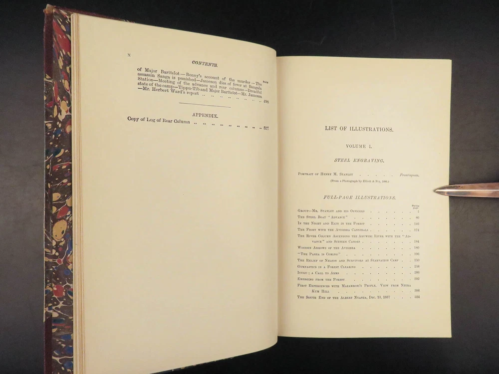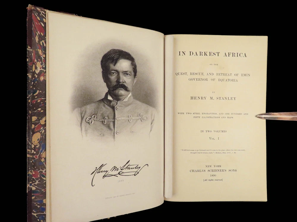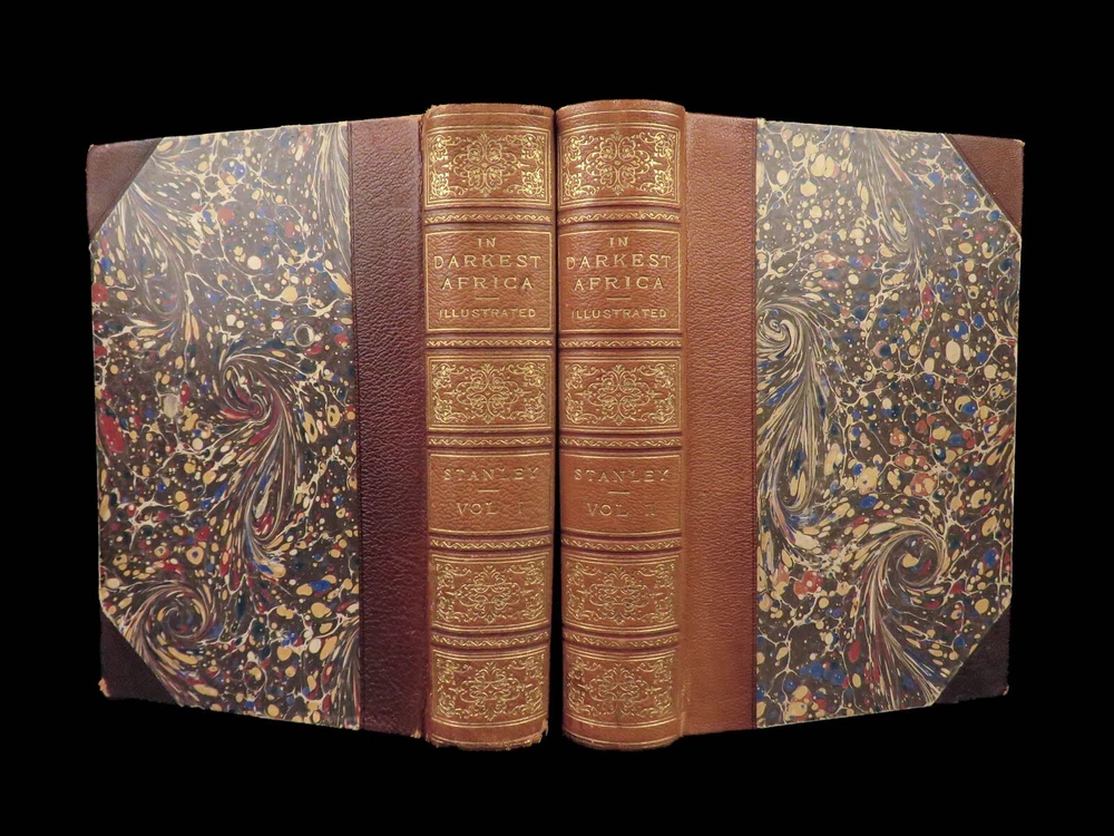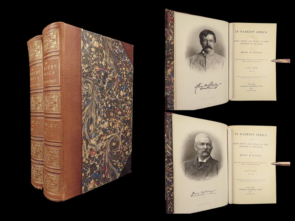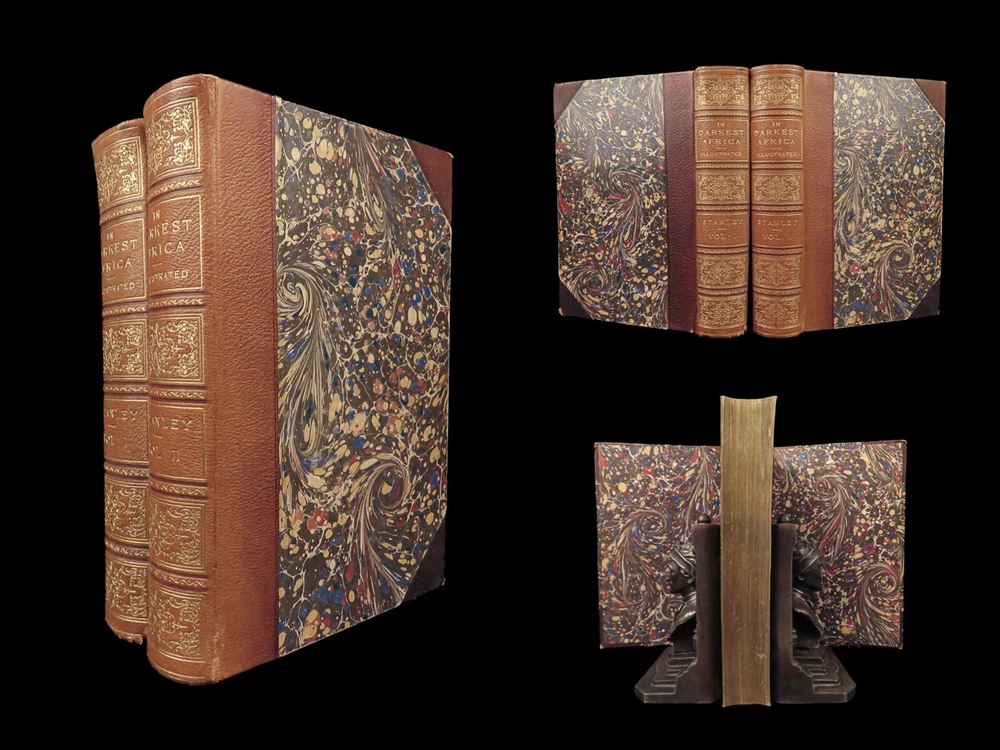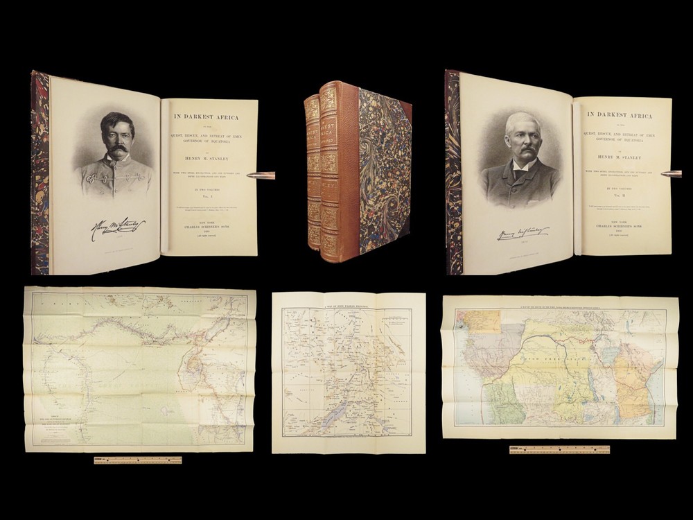 1890 Livingstone 1 ed In Darkest Africa Henry Stanley Emin Pasha Expedition MAPS “If you have men who will only come if they know there is a good road, I don't want them. I want men who will come if there is no road at all.” ― David Livingstone A rare, first printing of Henry Stanley’s ‘ In Darkest Africa. ’ Known for his explorations in Africa, he found the Scottish missionary explorer David Livingstone, whom most had assumed had been lost. His acquaintance with continuing expedition with Livingstone led to the expedition for the relief of Emin Pasha, an Ottoman physician. This voyage was notorious for causing the deaths of so many of its members to disease and disaster. The events of this expedition were recorded in Stanley’s ‘ In Darkest Africa ’ in which he was the leader of the Emin Pasha Relief Expedition. This 1890 first edition has a fantastic, large folding map located in a pocket on the back of both pastedowns. Item number: #30926 Price: $750 STANLEY, Henry M In darkest Africa: or, The quest, rescue, and retreat of Emin, governor of Equatoria New York: Charles Scribner's Sons, 1890. First edition. Details : · Collation: 2 volumes o Vol. I – xiv, 547, [1] § Includes large folding map in back pocket o Vol. II - xvi, 540 § Includes 2 folding maps in back pocket o 150 illustrations and maps · References: Howgego IV S60; · Language: English · Binding: Leather; tight and secure · Size : ~9in X 6.25in (23cm x 16cm) · RARE Deluxe Leather first edition! Our Guarantee: Very Fast. Very Safe. Free Shipping Worldwide. Customer satisfaction is our priority! Notify us with 7 days of receiving, and we will offer a full refund without reservation! 30926