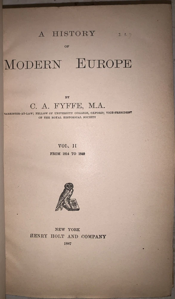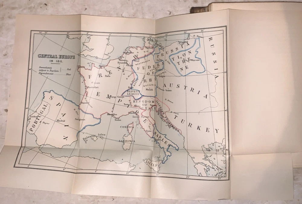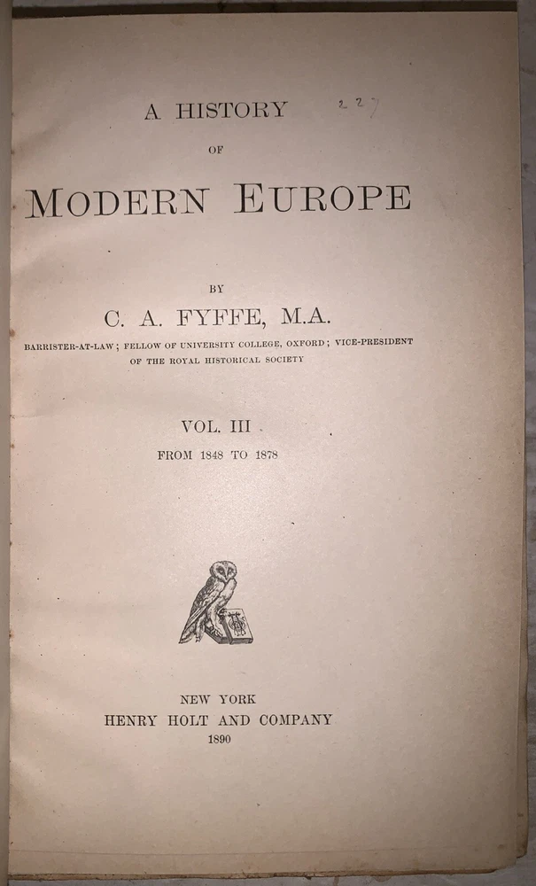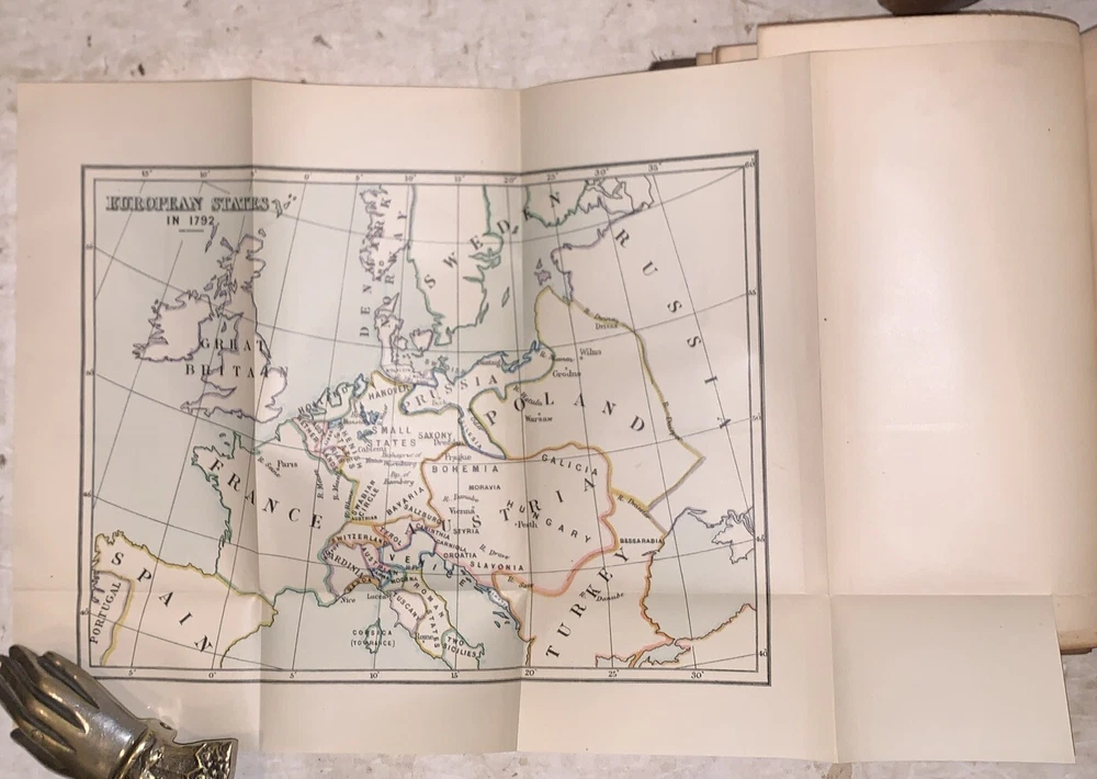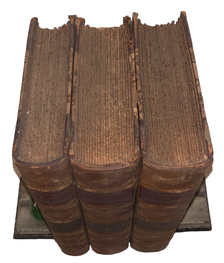 A History of Modern Europe by C. A. Fyffe, M.A In Three Volumes With Two Maps Second Edition, Revised New YorK: Henry Holt and Company 1891 Three octavos, xxxi, 545p; xii, 513p; viii, 572 pages, bound in period quarter leather over marbled boards. Spines with gilt lettering and decoration, marbled endpapers. Volume one illustrated with two fold out color maps. Most edges remain uncut and unopened. Some rubbing and wear, soiling to covers, some discoloration, else in good + condition. A History of Modern Europe by C. A. Fyffe, M.A., offers a comprehensive exploration of European history from the late Middle Ages through the 19th century, providing readers with an in-depth look at the continent's dynamic political, social, and cultural transformations. Fyffe’s narrative combines a detailed analysis of significant events, such as the Reformation, the rise of nation-states, and the impact of the French and Industrial Revolutions, with insights into the forces that shaped Europe’s trajectory. Written with scholarly rigor, the book presents a balanced view of the influential figures and ideologies that played pivotal roles in shaping modern Europe, making it an invaluable resource for understanding the roots of contemporary European society. If you have any questions, feel free to ask, and don't forget to check out my other listings.
