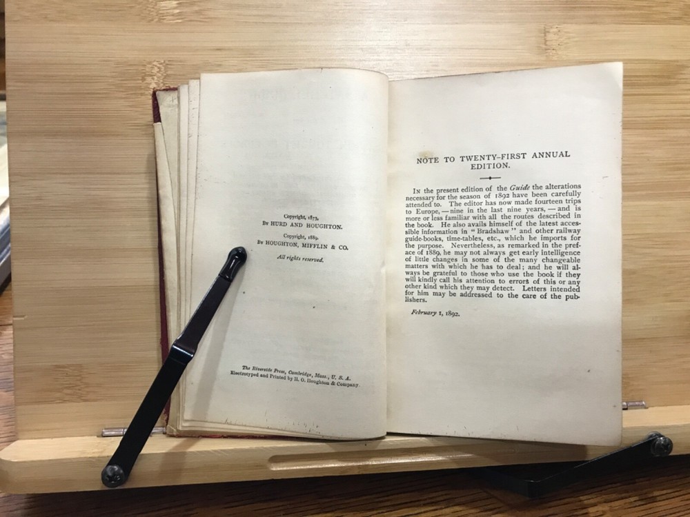 A Satchel Guide For The Vacation Tourist in Europe. A Compact Itinerary of the British Isles, Belgium and Holland, Germany and the Rhine, Switzerland, France, Austria, and Italy. Published in Boston and New York by Houghton, Mifflin and Company. 1892, 307 pp, hardcover binding. In fair condition. Covers and spine have age-related toning and wear that has caused some discoloration, tearing, and bending along the edges. Pages have age-related toning and foxing. Hinges are worn, and while pages remain attached, the support is not even throughout. Maps have some tearing, toning, and foxing, but are otherwise clear to see. Please see photographs and ask any questions prior to purchasing. An excellent travel guide for tourists in the late nineteenth century. With maps and in-depth descriptions of various sites, this volume would make a great addition to the personal collection of any travel lover. Any issues with hinges or binding due to age or wear could provide an excellent opportunity for restoration or rebinding, if desired. COLT1892ABDL JR1057
