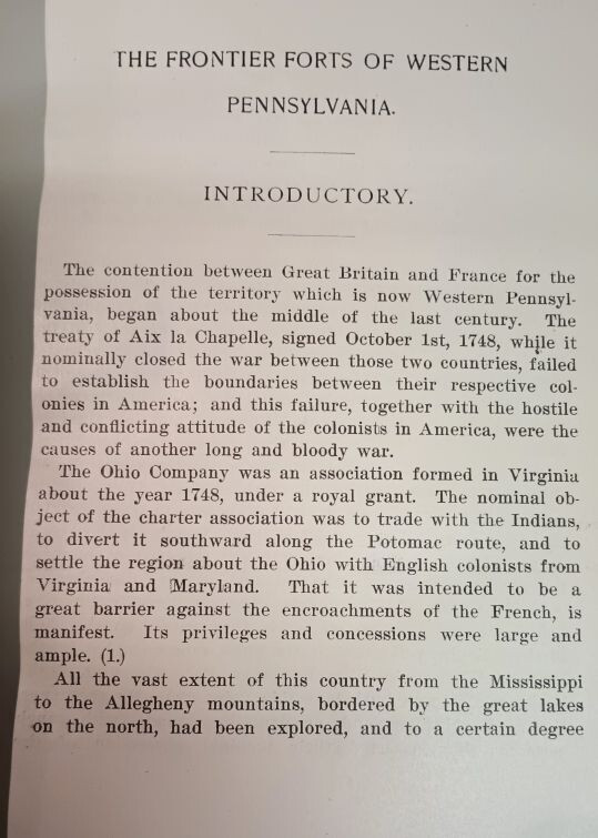1896; Pioneer Pennsylvania, Ohio Indian forts: Pontiac, French Indian War: Maps Frontier Forts of Pennsylvania Report of the Commission to Locate the Site of... Volume Two only The Frontier Forts of Western Pennsylvania" by George Dallas Albert. Pennsylvania: Clarence M. Busch, State Printer, Date: 1896. First Edition. The interior pages are near fine as are all of the pull out maps Illustrated with large folding, and two-page and single-page maps, sites and plans (most in color) and color plates most depicting various forts. Index. Three-quarter maroon leather over marbled paper-covered boards; gilt decoration and lettering to spines; All Edges Gilt; marbled endpapers. Large 7x10" 636 pp. Index. Very Good condition. (Light wear to extremities and spine; some fading to spine.) Pages are clean and unmarked. Binding firm and tight. No loose, torn, or missing pages,. No water damage, mustiness, or odors. No highlighting, notes, underlining, or marks. e-o-317-frontier-forts