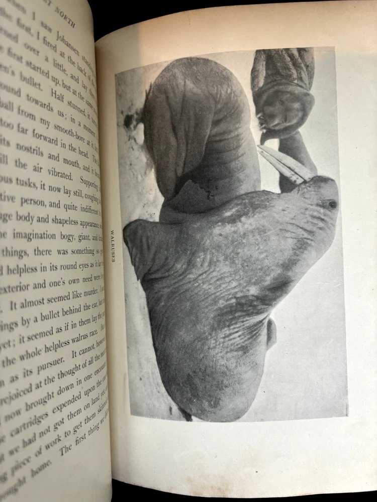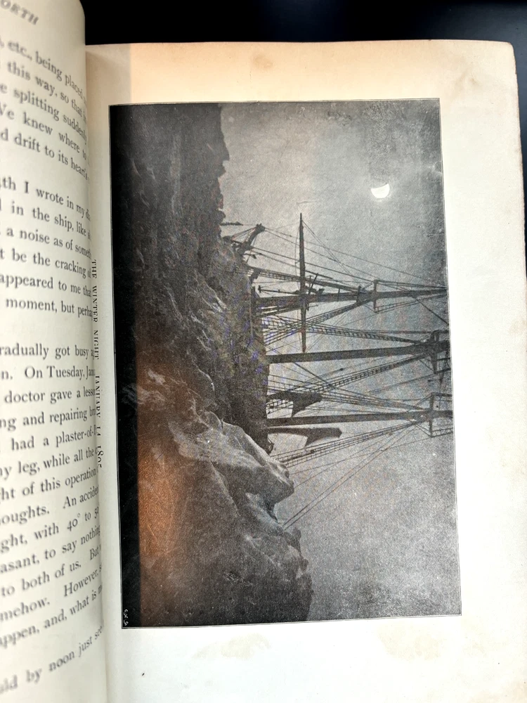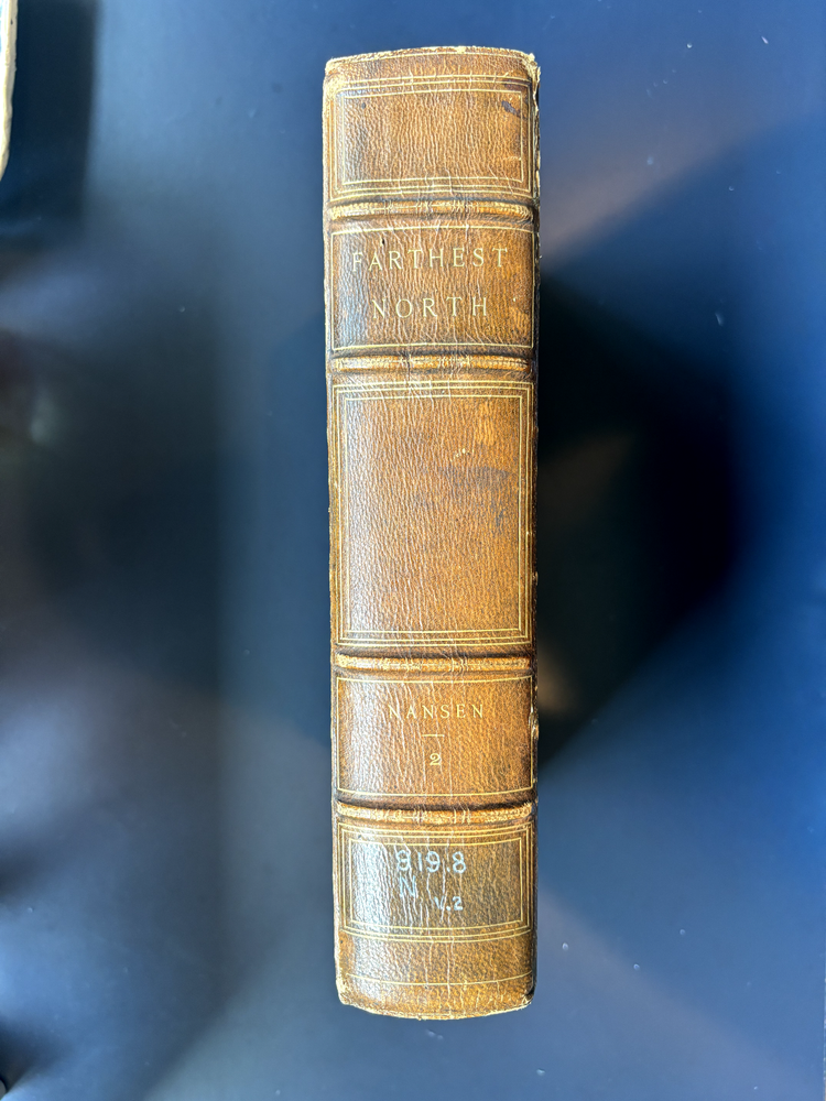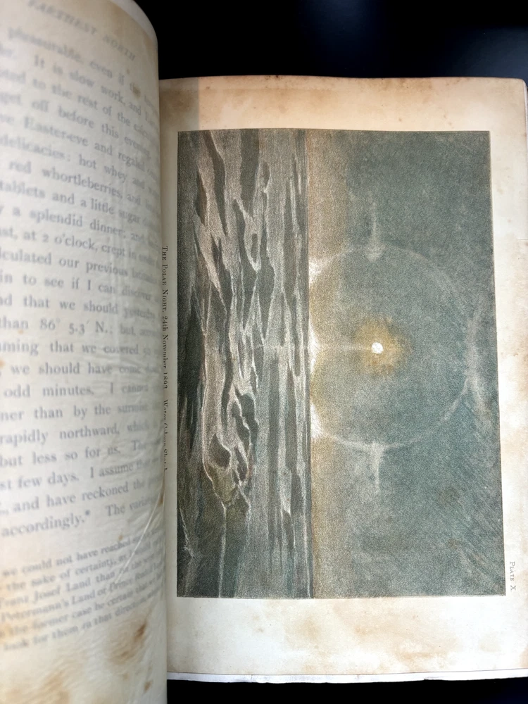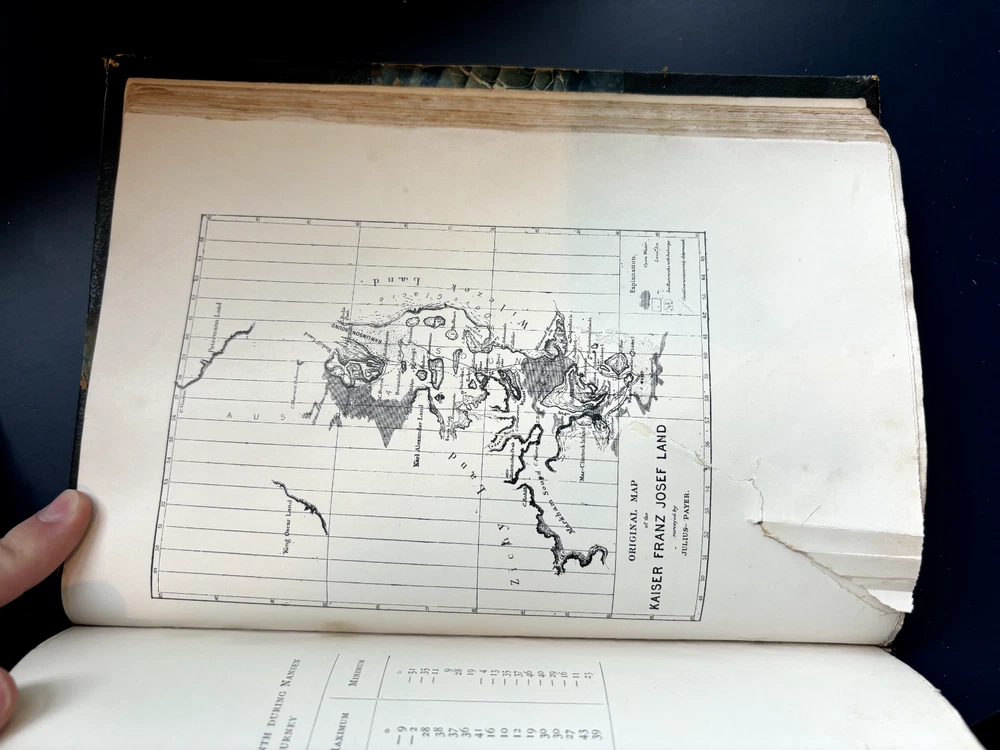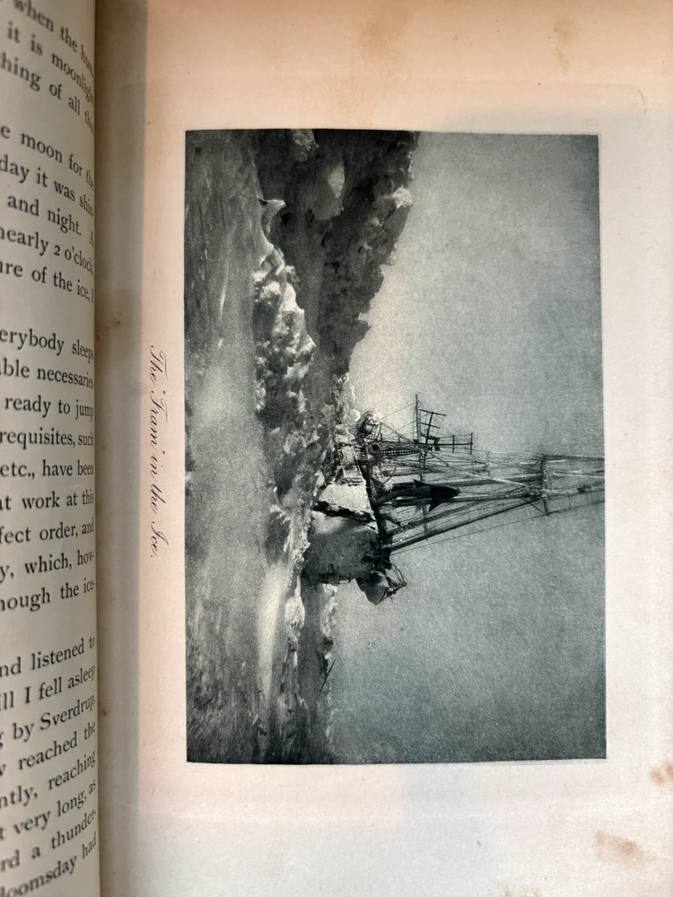 1897 leatherbound copy of Farthest North Vol. 2 by Dr. Fridtjof Nansen. Beautiful marbled paper on covers and endpages and gilded details on the leather spine. The book includes numerous photos, at least one map, and numerous plates with watercolor and pastel sketches (some shown in the pictures). Book is in moderate condition - its structurally intact and pages appear to be free from rips except for the map shown in the images above. There is some foxing and the edges of the cover are well worn, but spine and text block are intact. This was a former library book and has some markings indicating that as can be seen in the images. Overall a beautiful book about an interesting voyage. The pictures are especially interesting! Please let me know if you have any questions.