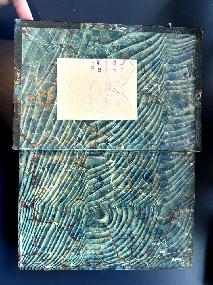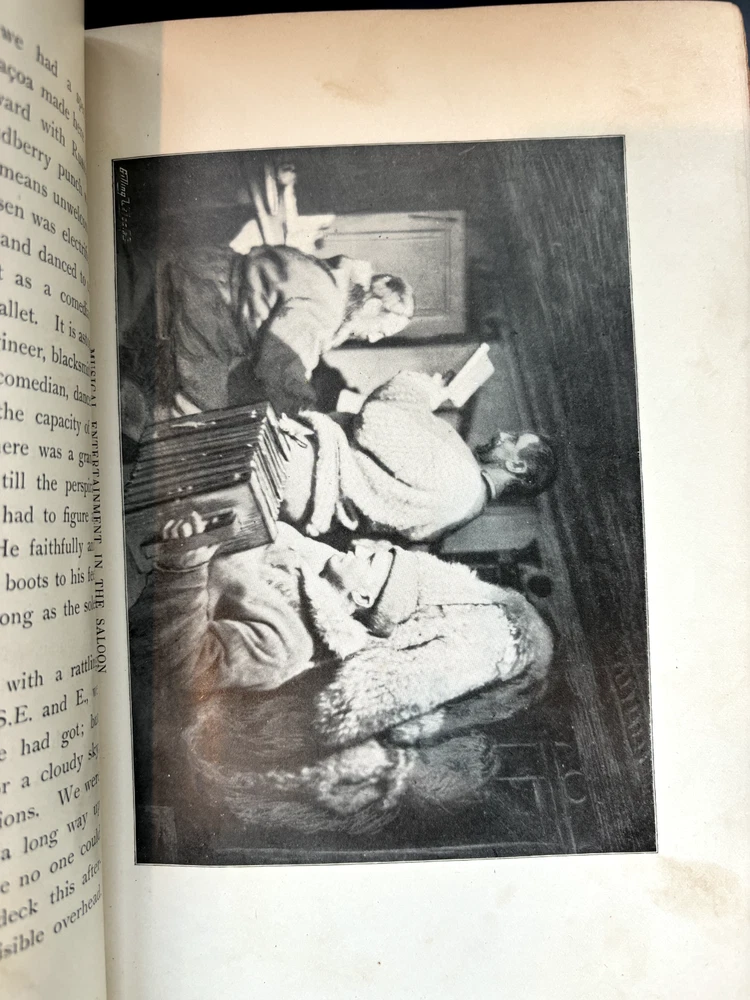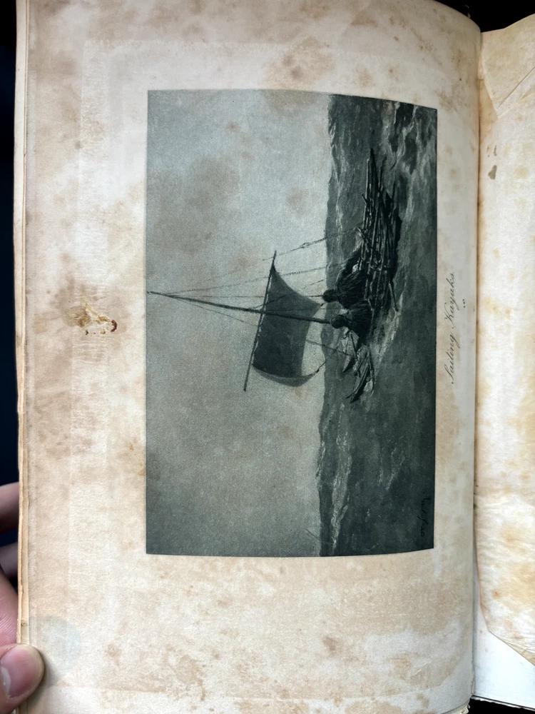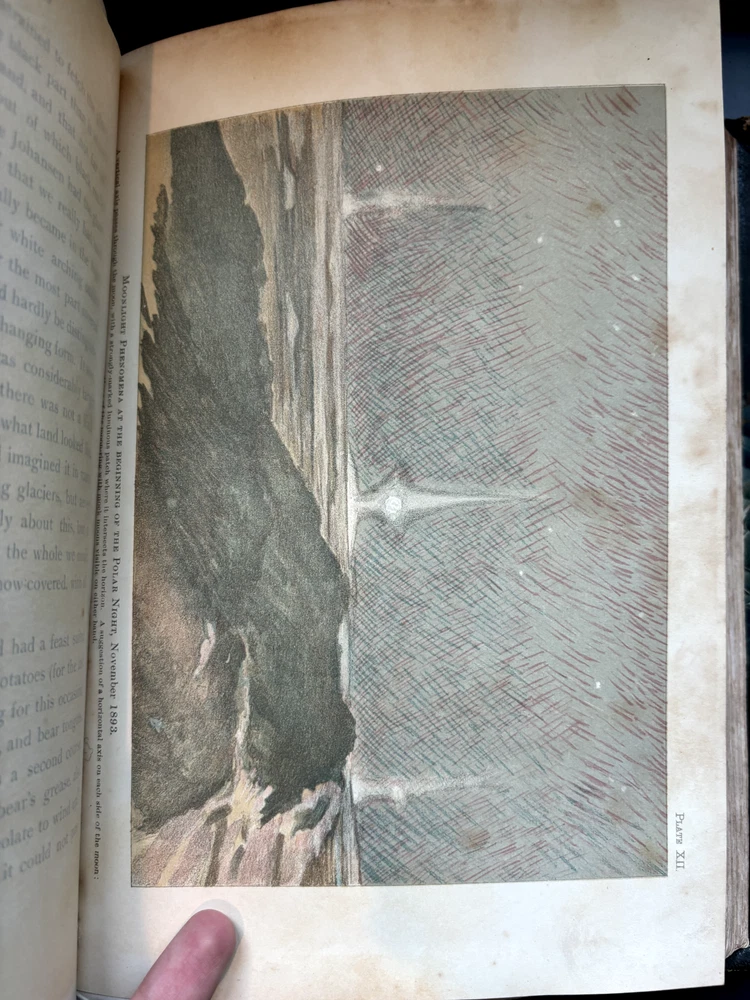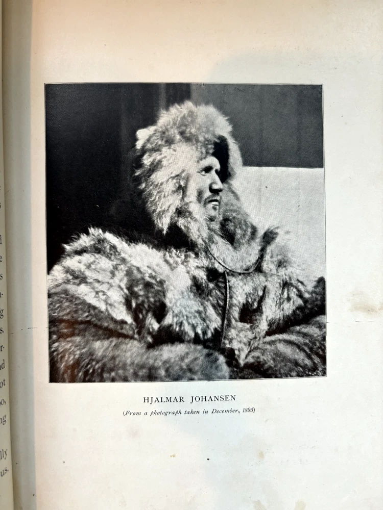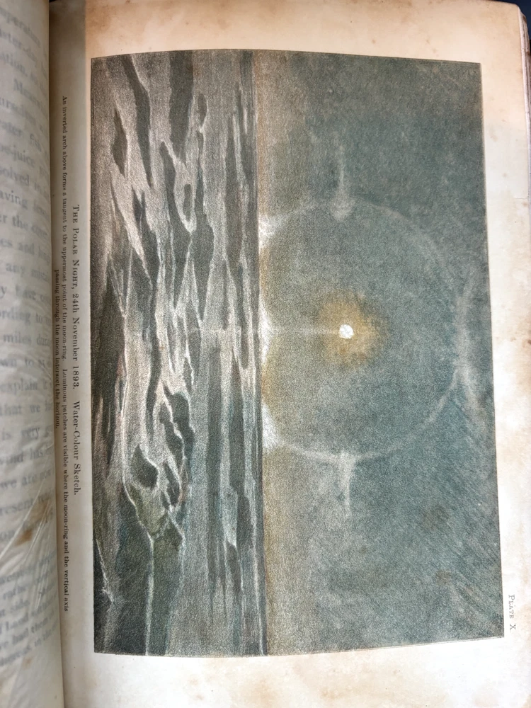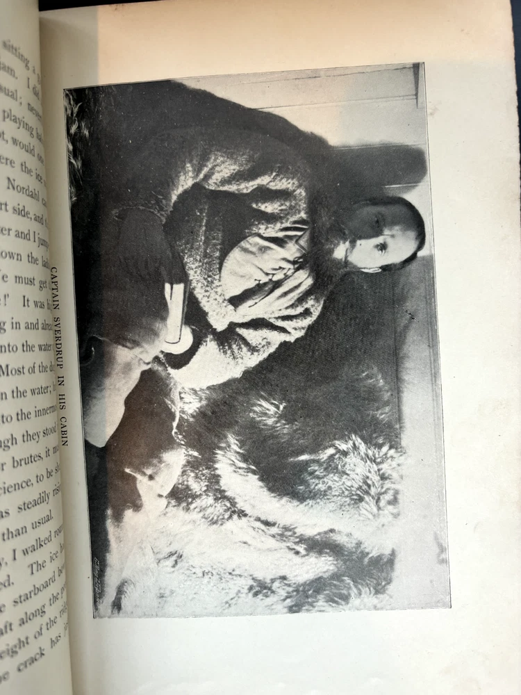 1897 leatherbound copy of Farthest North Vol. 2 by Dr. Fridtjof Nansen. Beautiful marbled paper on covers and endpages and gilded details on the leather spine. The book includes numerous photos, at least one map, and numerous plates with watercolor and pastel sketches (some shown in the pictures). Book is in moderate condition - its structurally intact and pages appear to be free from rips except for the map shown in the images above. There is some foxing and the edges of the cover are well worn, but spine and text block are intact. This was a former library book and has some markings indicating that as can be seen in the images. Overall a beautiful book about an interesting voyage. The pictures are especially interesting! Please let me know if you have any questions.
