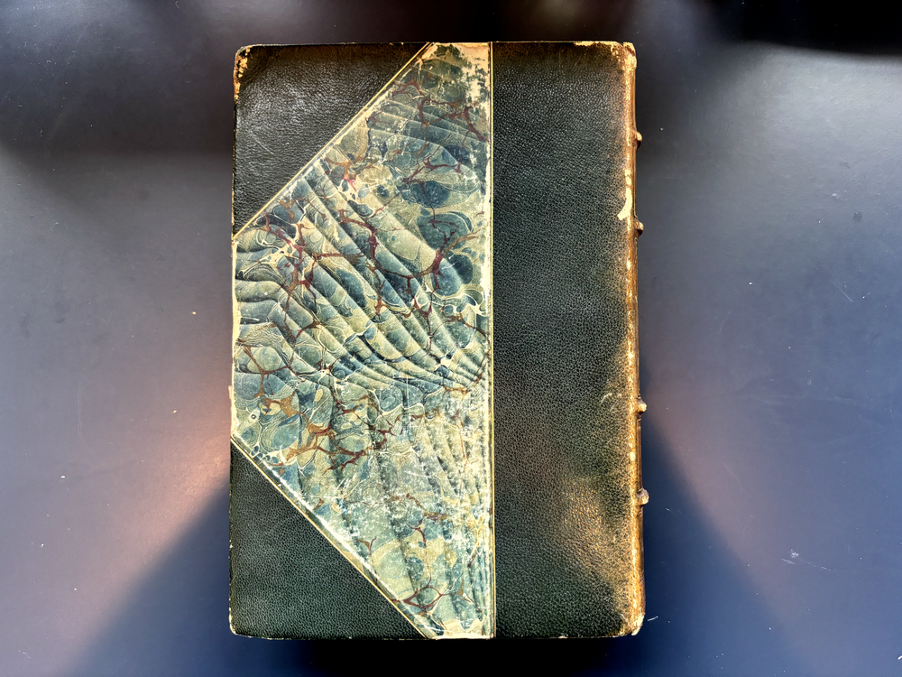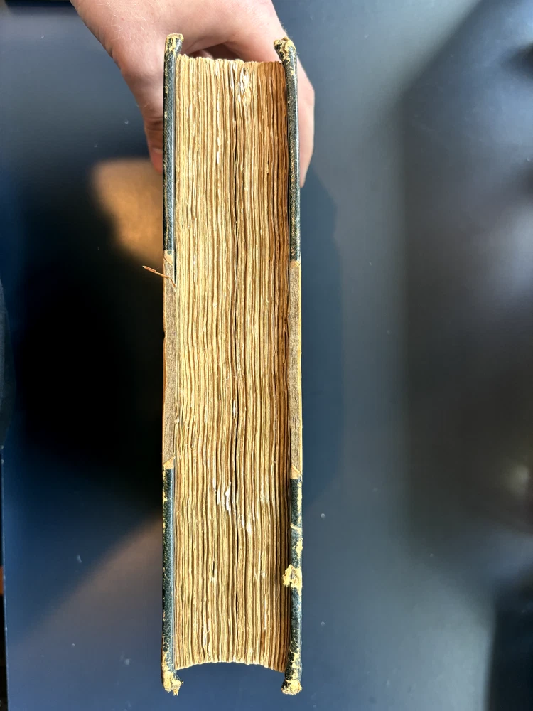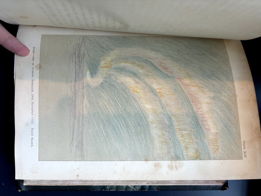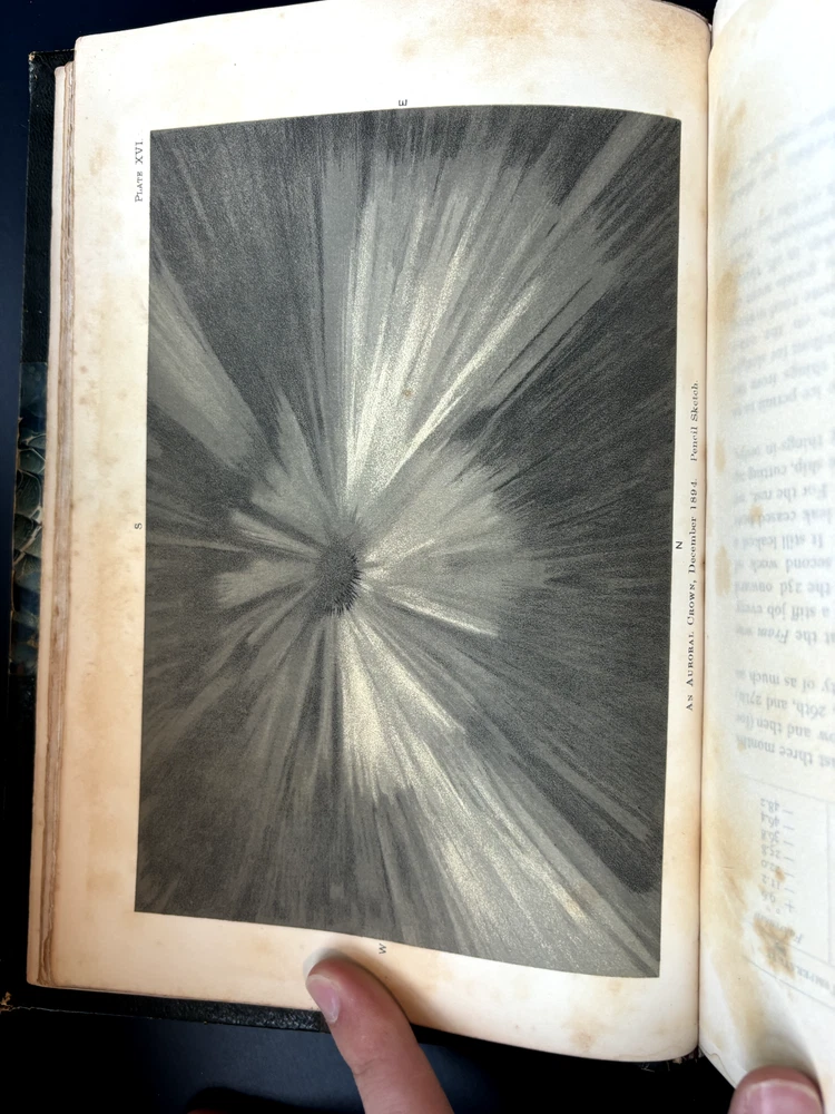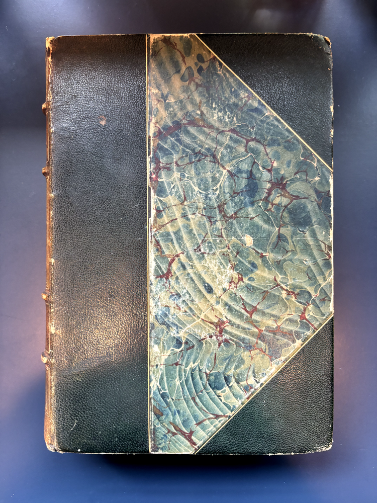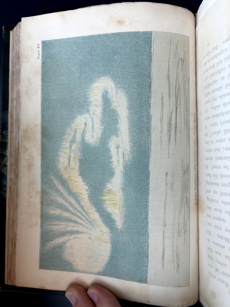 1897 leatherbound copy of Farthest North Vol. 2 by Dr. Fridtjof Nansen. Beautiful marbled paper on covers and endpages and gilded details on the leather spine. The book includes numerous photos, at least one map, and numerous plates with watercolor and pastel sketches (some shown in the pictures). Book is in moderate condition - its structurally intact and pages appear to be free from rips except for the map shown in the images above. There is some foxing and the edges of the cover are well worn, but spine and text block are intact. This was a former library book and has some markings indicating that as can be seen in the images. Overall a beautiful book about an interesting voyage. The pictures are especially interesting! Please let me know if you have any questions.