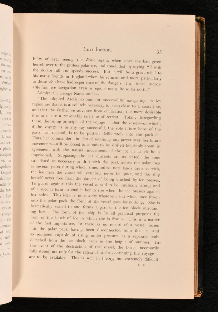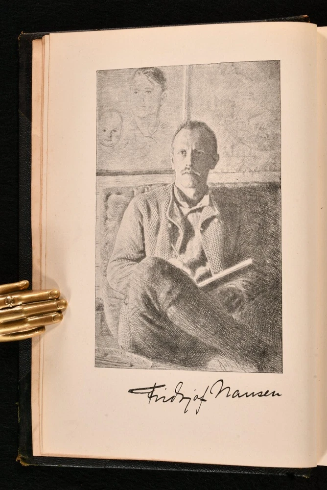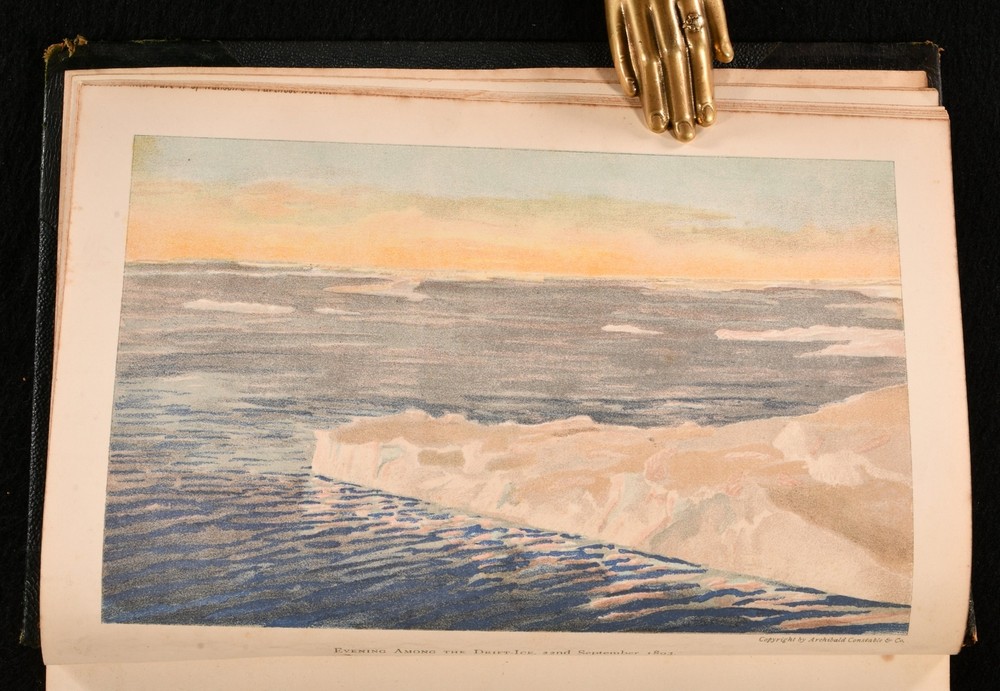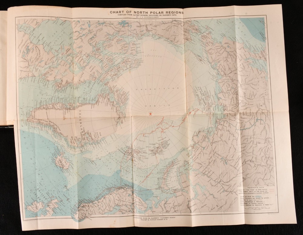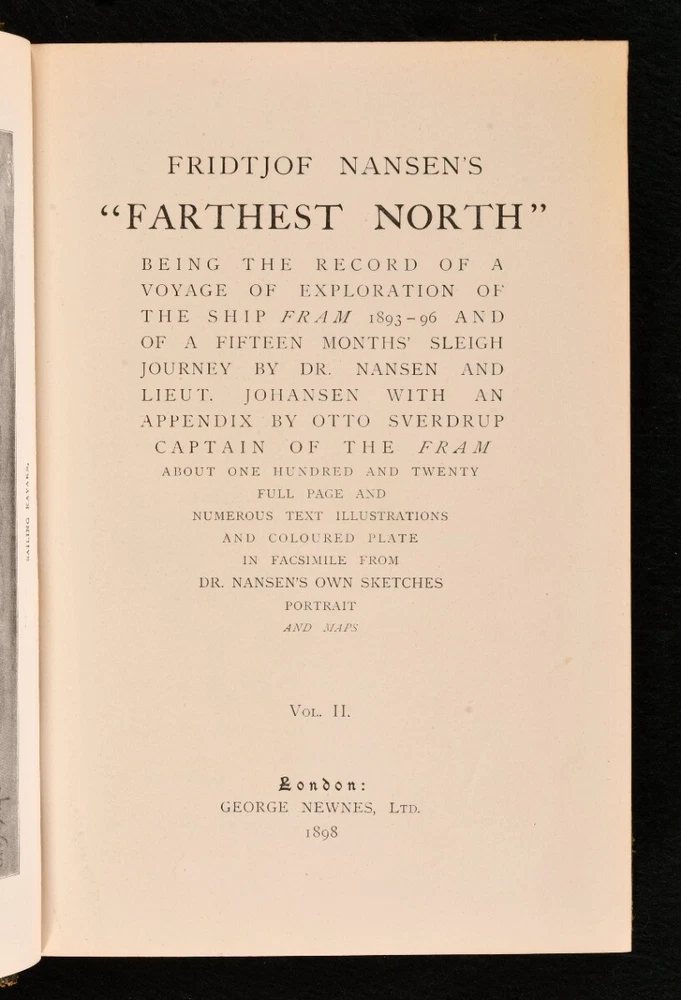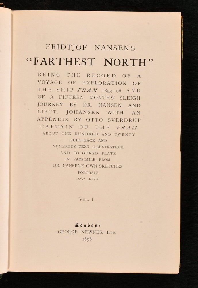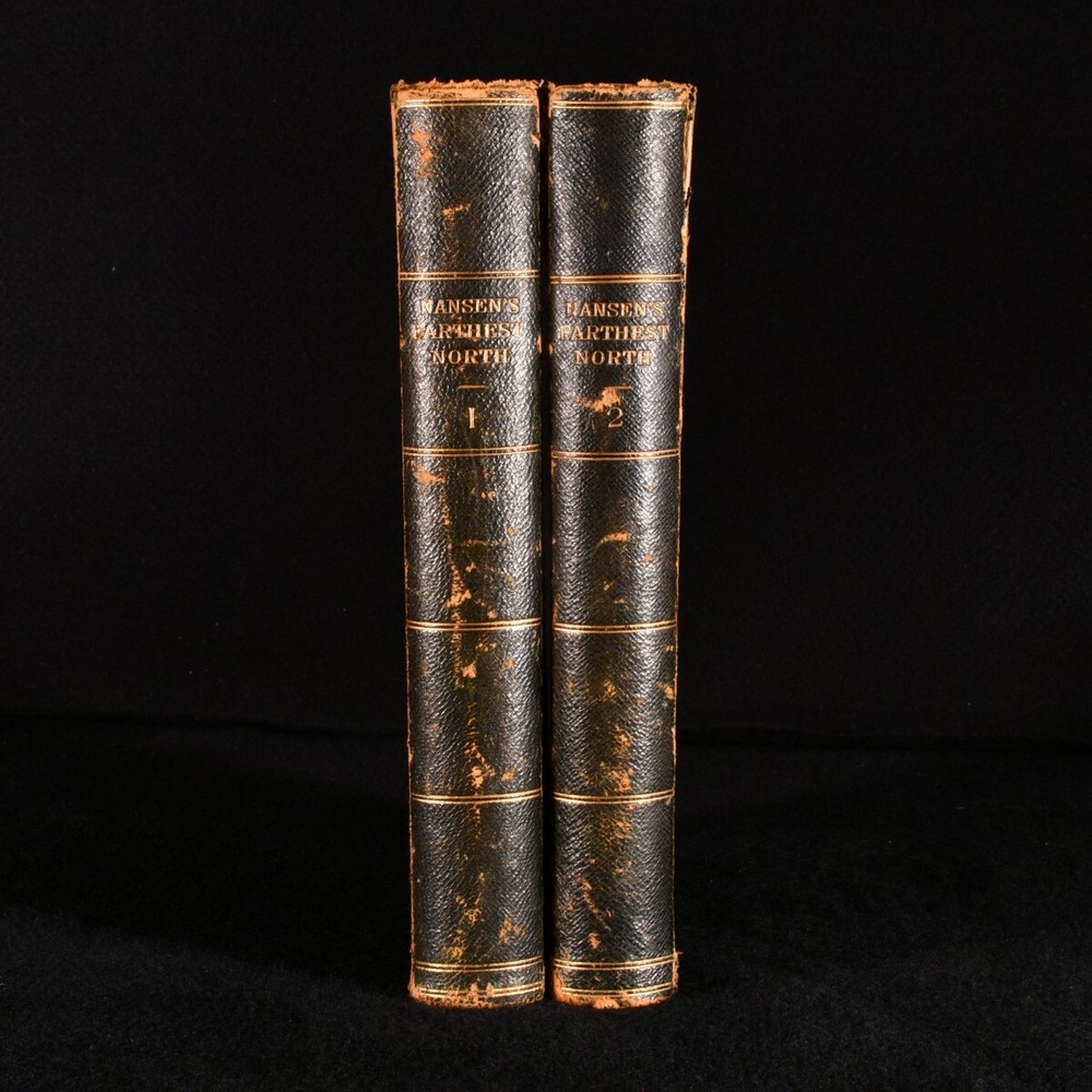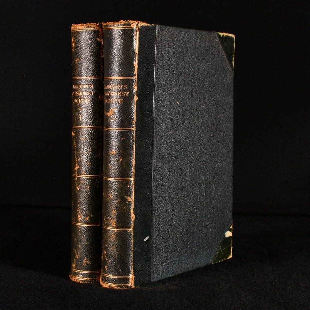 Click here to see our other books! Fridtjof Nansen's 'Farthest North': Being the Record of a Voyage of Exploration of the Ship Fram 1893-96 and of a Fifteen Months' Sleigh Journey Fridtjof Nansen 1898 George Newnes : London 9" by 6" xv, 480; [viii], 1-456pp. SUMMARY The second edition of Nansen's account of his extraordinary Fram expedition of 1893, complete in two volumes with its folding map. Early Edition,Folding Maps,Illustrated,Leather Binding,Rebound Overall Condition: Very Good This book weighs 3 KG when packed UK Postage: £ 3.99 US Postage: £ 36.99 EU Postage : £ 25.99 European Postage: £ 27.99 Asia Postage: £ 47.99 Worldwide Postage: £ 69.99 DESCRIPTION The second edition of this work by Fridtjof Nansen. Complete in two volumes, with half title. Comprising the story of the incredible Fram expedition led by Dr Nansen from 1893 to 1896, in which he tried to reach the geographical North Pole by harnessing the north-east current of the Arctic Ocean. Even though the mission was discouraged by other explorers, Nansen took the Fram with his companion Hjalmas Johansen to the eastern Arctic Ocean, and waited for the water to carry it towards the pole. After eighteen months, they both left the ship and carried on the expedition with a team of Samoyed dogs and sledges to reach the Pole. Although they did not reach it, they did reach the Farthest North latitude of 86°13.6′N. The Fram finally emerged in the North Atlantic Ocean. With a frontispiece to each volume, one coloured plate in facsimile from Nansen's own sketches, one hundred and ten full page plates in black and white, and various in text illustrations of etched portrait, photogravures. With a large coloured folding map to the rear of volume I. Collated, complete. With an Appendix by Otto Sverdrup, Captain of the Fram . CONDITION In a half morocco binding over cloth covered boards. Externally generally sound with shelf wear and chipping to the spine and edges, some rubbing to the leather and boards. A minor cracking to the upper joint of volume II. Internally, firmly bound. With some spotting to the endpapers and fore edge, affecting only the odd leaf with the odd minor spot. Otherwise, the pages appear bright and clean throughout. With a frontispiece to each volume, one coloured plate in facsimile from Nansen's own sketches, one hundred and ten full page plates in black and white, and various in text illustrations of etched portraits, photogravures. With a large coloured folding map to the rear of volume I. Collated, complete. Overall Condition: Very Good GLOSSARY OF TERMS Overall Condition (Dustwrapper condition rating is shown after that for the book itself, where a dustwrapper is present) Fine - Very well preserved copy showing very little wear Very Good Indeed - Only one or two minor faults, really a very attractive copy Very Good - Quite a wide term meaning no major faults but probably several smaller ones often expected given the age of the book, but still a respectable copy Good - Meaning not very good. Some more serious faults as will be described in the condition report under 'condition' Good Only - Meaning one or more faults that could really do with repair Fair - As with good only above but with other faults leaving a compromised copy even after repair Poor - Really bad and possibly seriously incomplete. We only sell books in this condition where their rarity or value makes them attractive none the less. Major defects will be described. GUARANTEE We offer a full money back guarantee on our descriptions. Please ask for details and conditions. We prefer PAYPAL. If you pay via PAYPAL we will post the item off the same or the next working day with the postage you have selected. Please note we cannot accept USD cheques